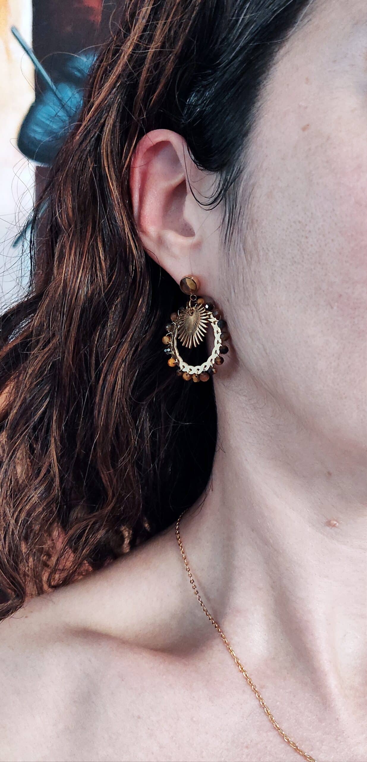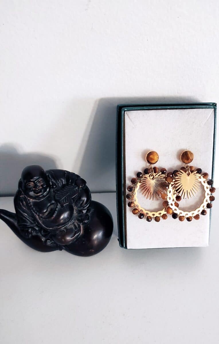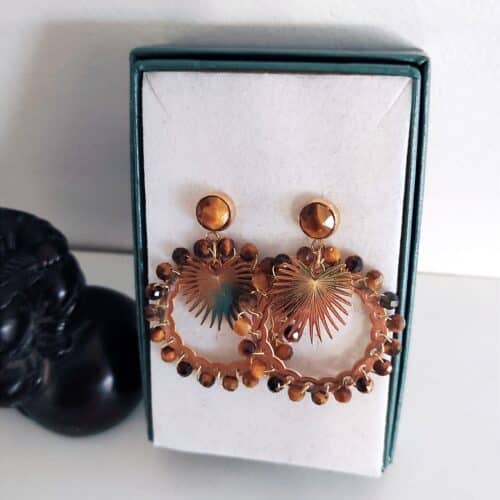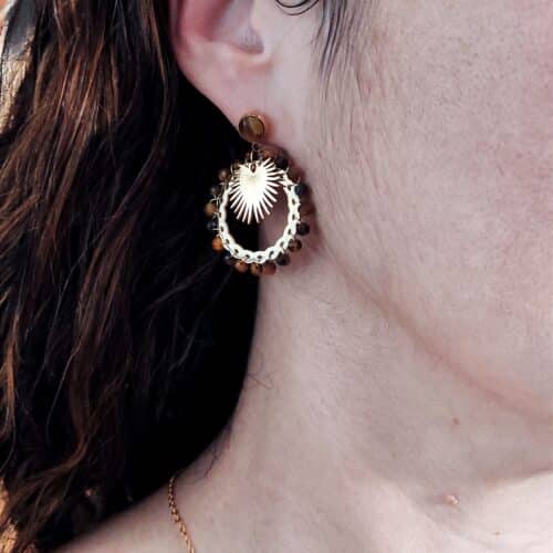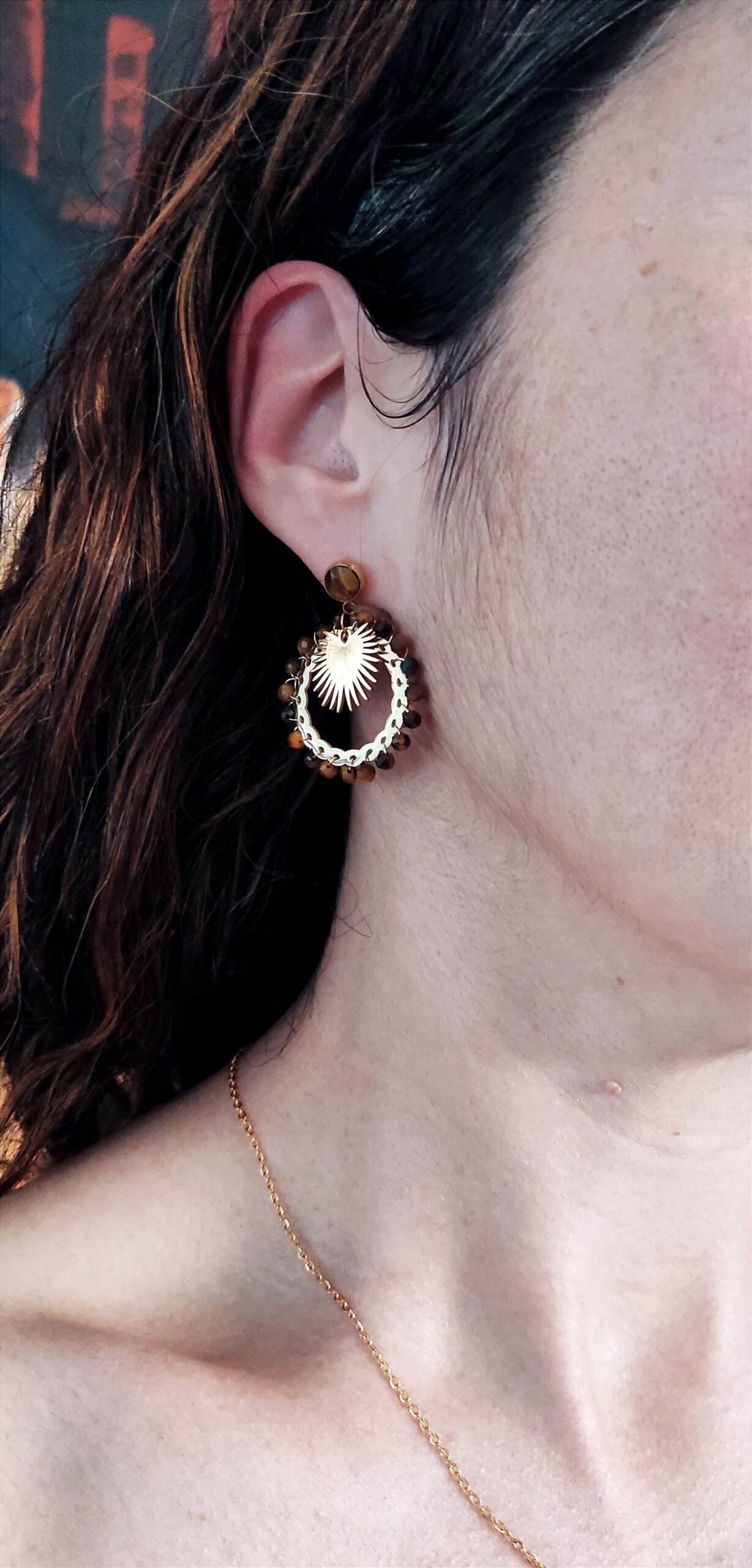 Belles boucles d’oreilles de forme ronde en acier inoxydable doré de marque Habaha. Elles sont ornées de petites perles en pierre naturelle oeil de tigre.