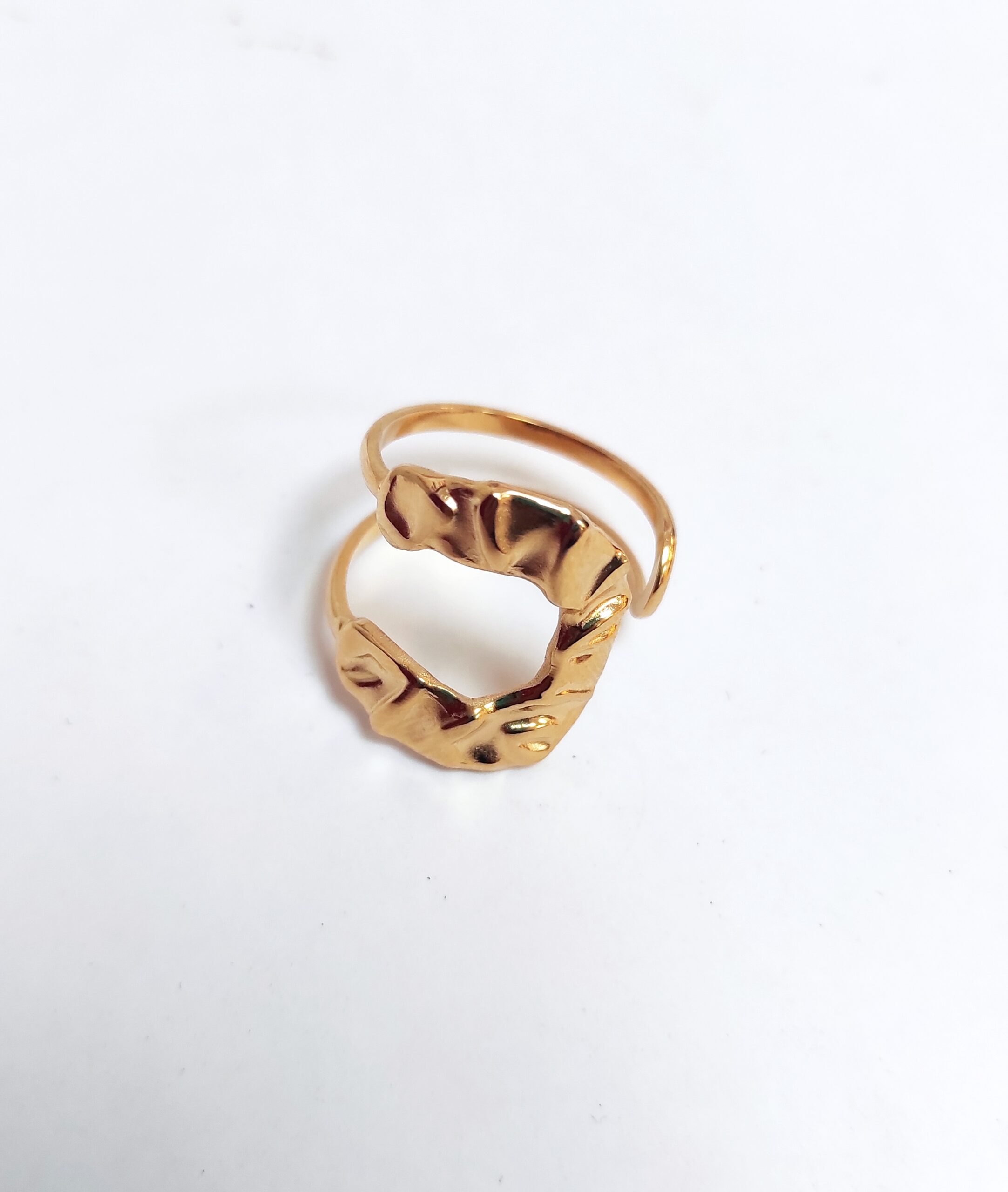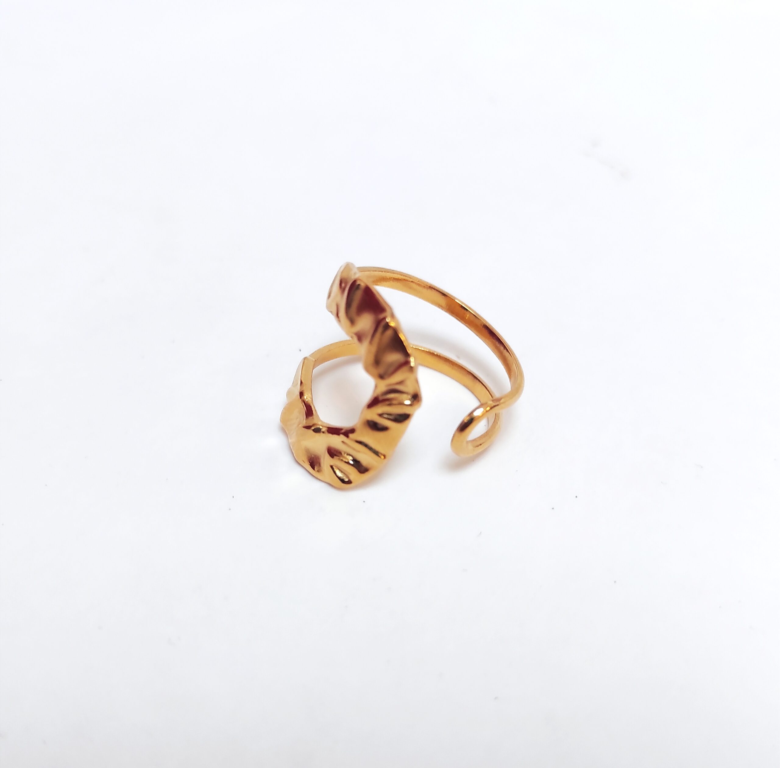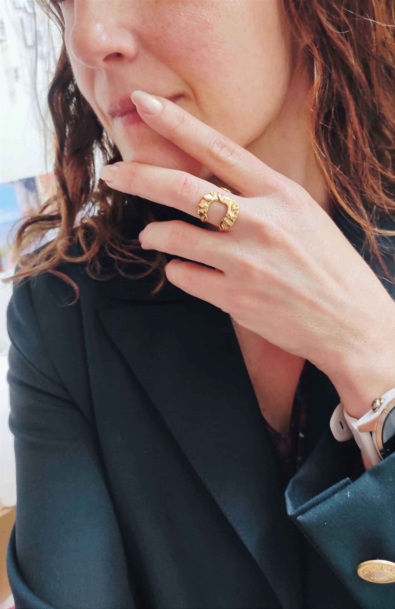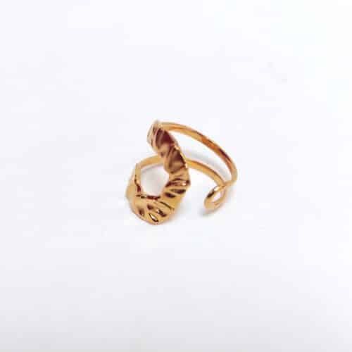 Bague en acier inoxydable doré de marque Mile Mila. Bague asymétrique avec un effet martelé sur le dessus, bague originale et distinguée avec beaucoup d’allure 😍