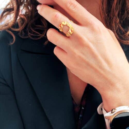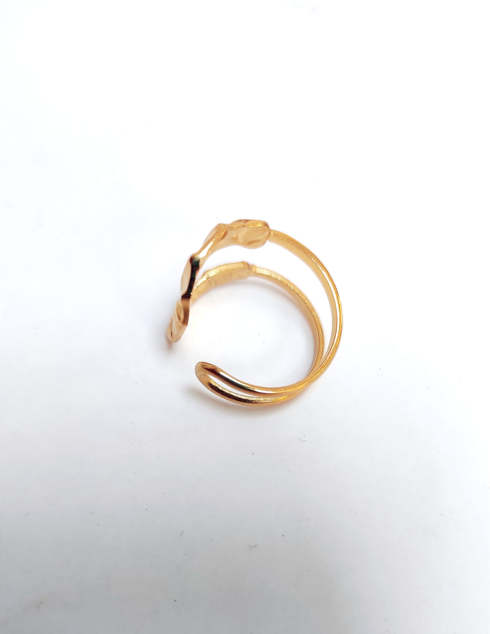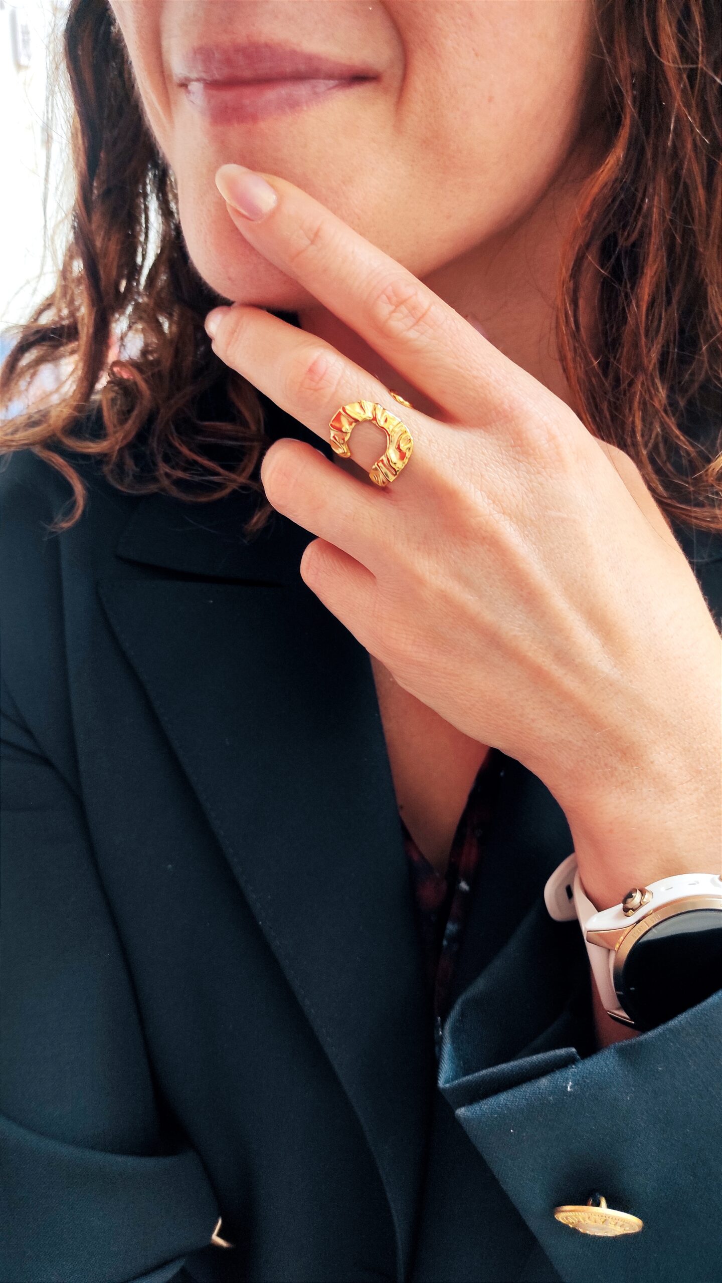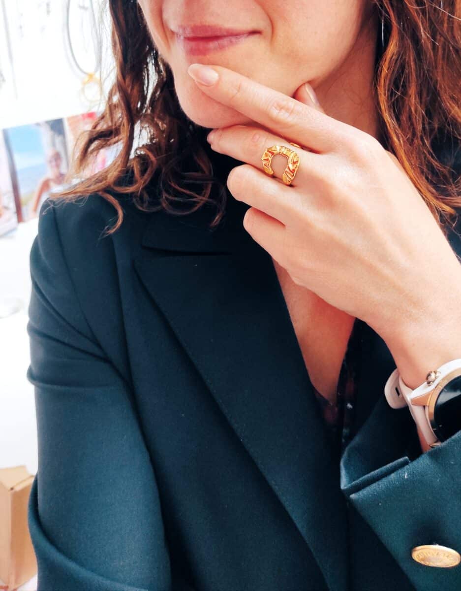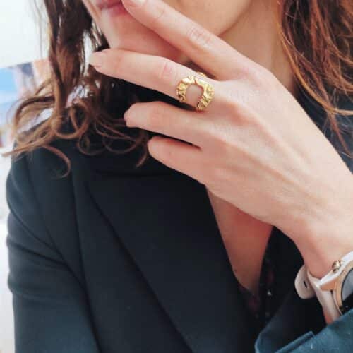 Bague en acier inoxydable doré de marque Mile Mila. Bague asymétrique avec un effet martelé sur le dessus, bague originale et distinguée avec beaucoup d’allure 😍