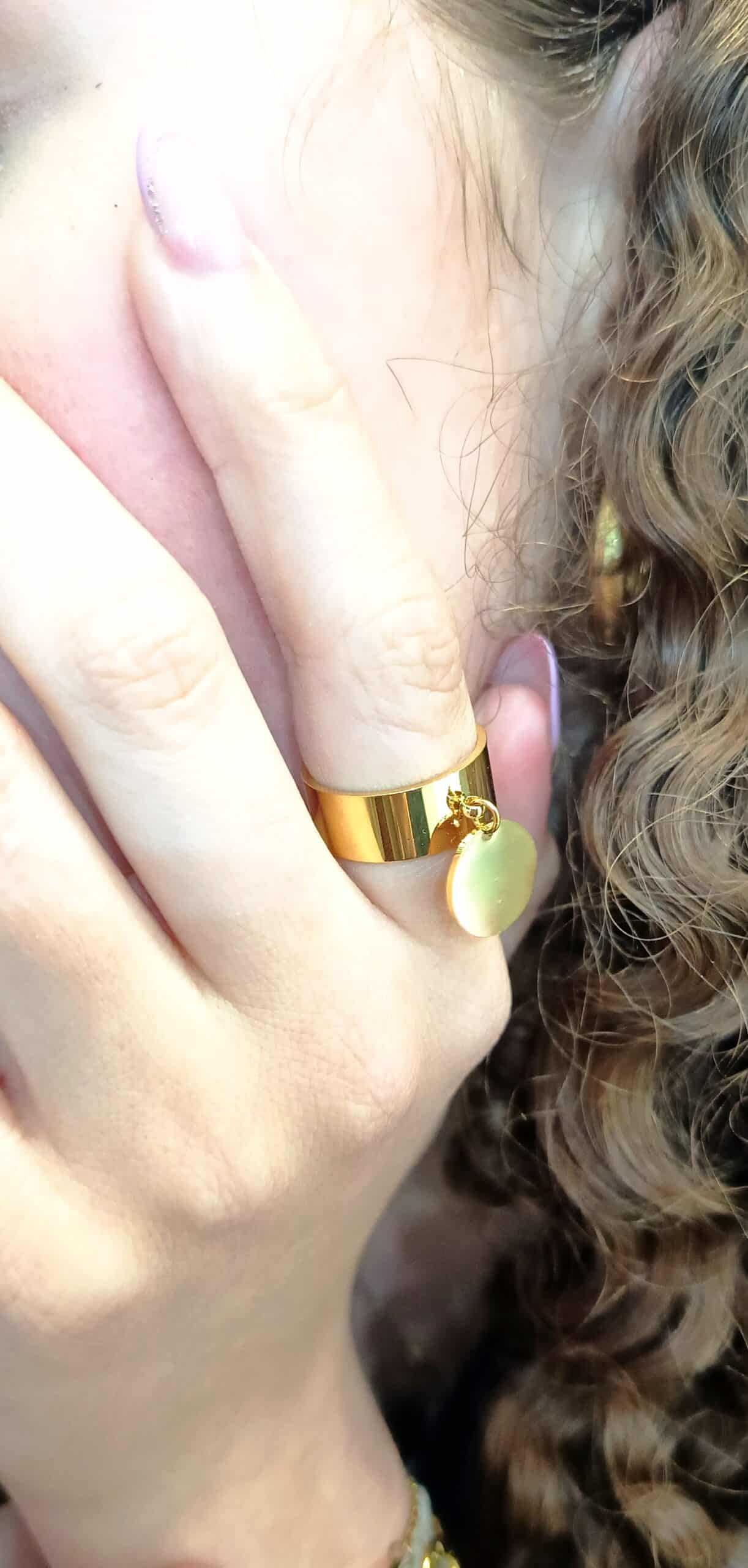 Jolie bague en acier inoxydable doré avec une pampille lisse brillante de couleur or.