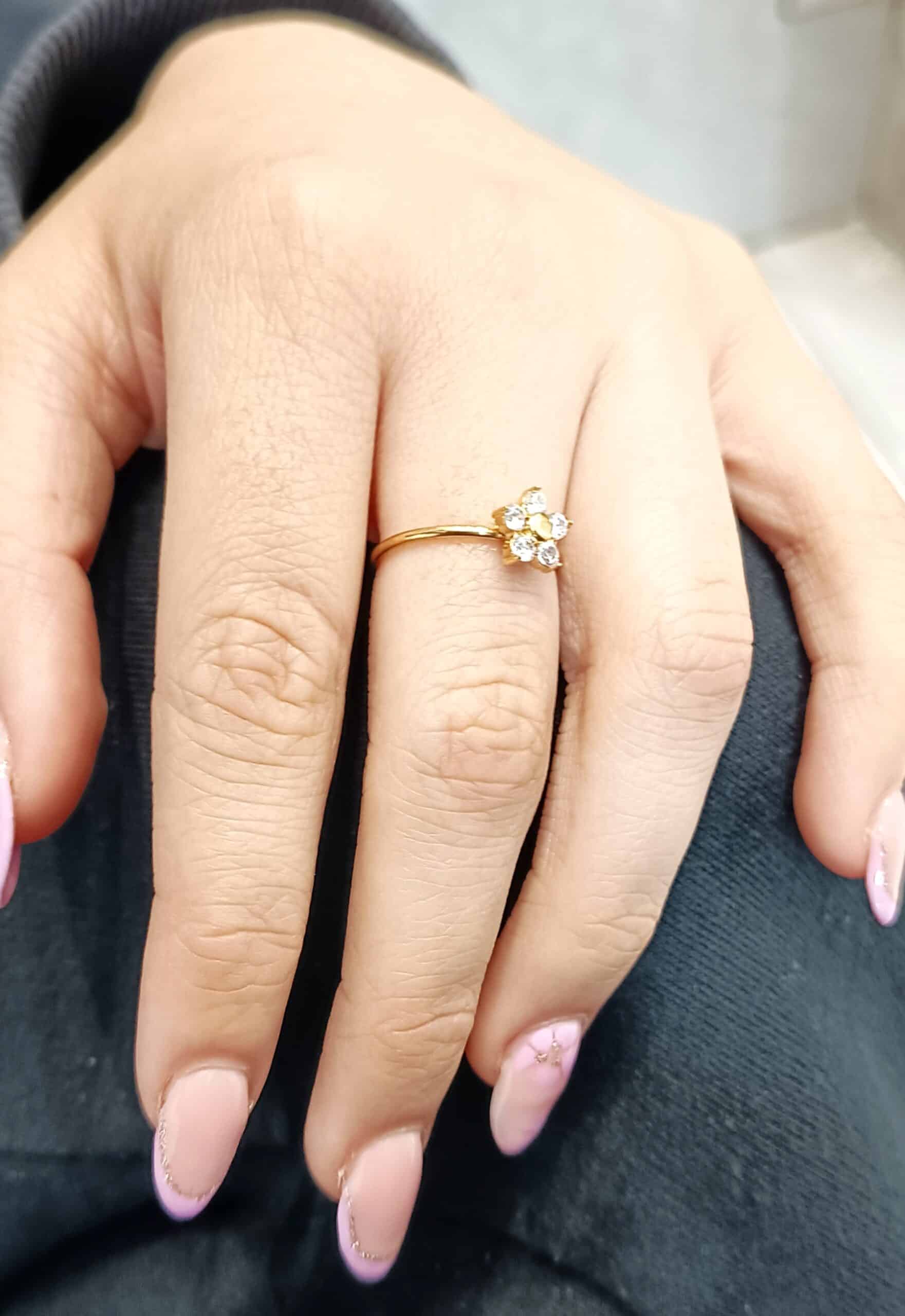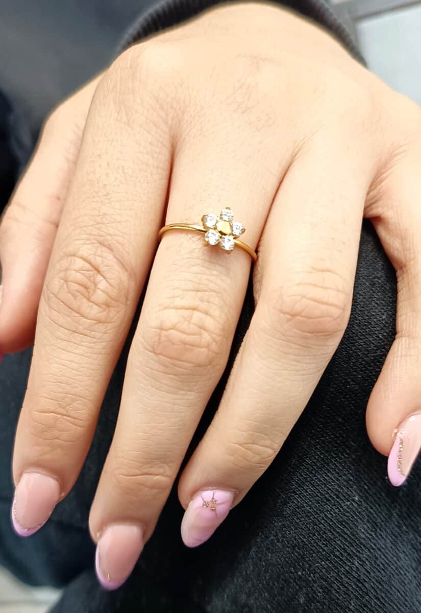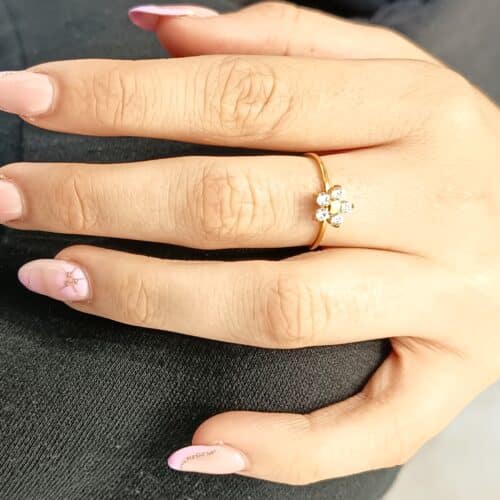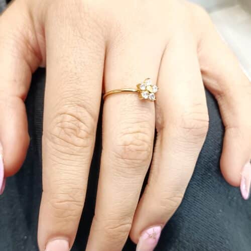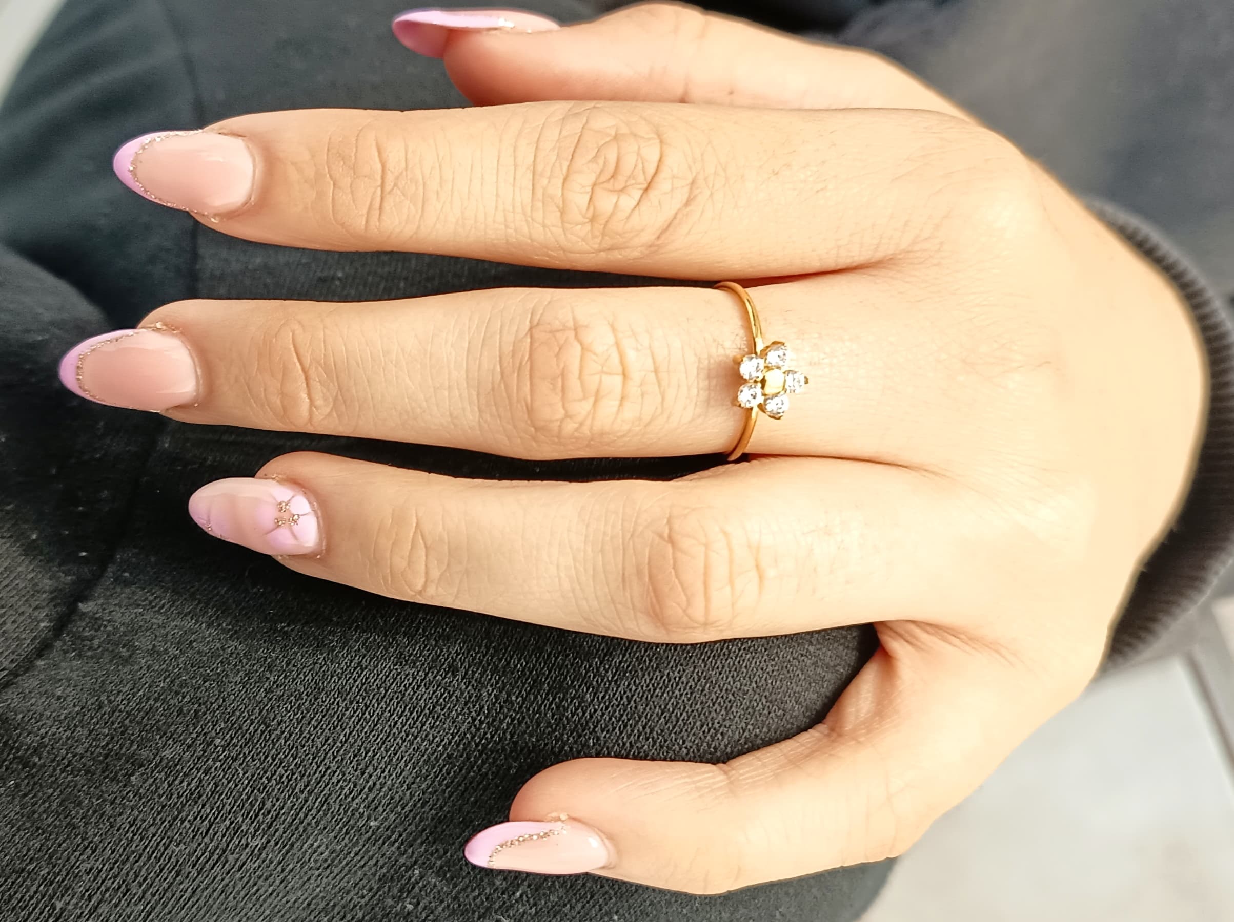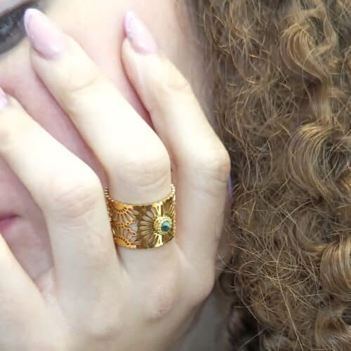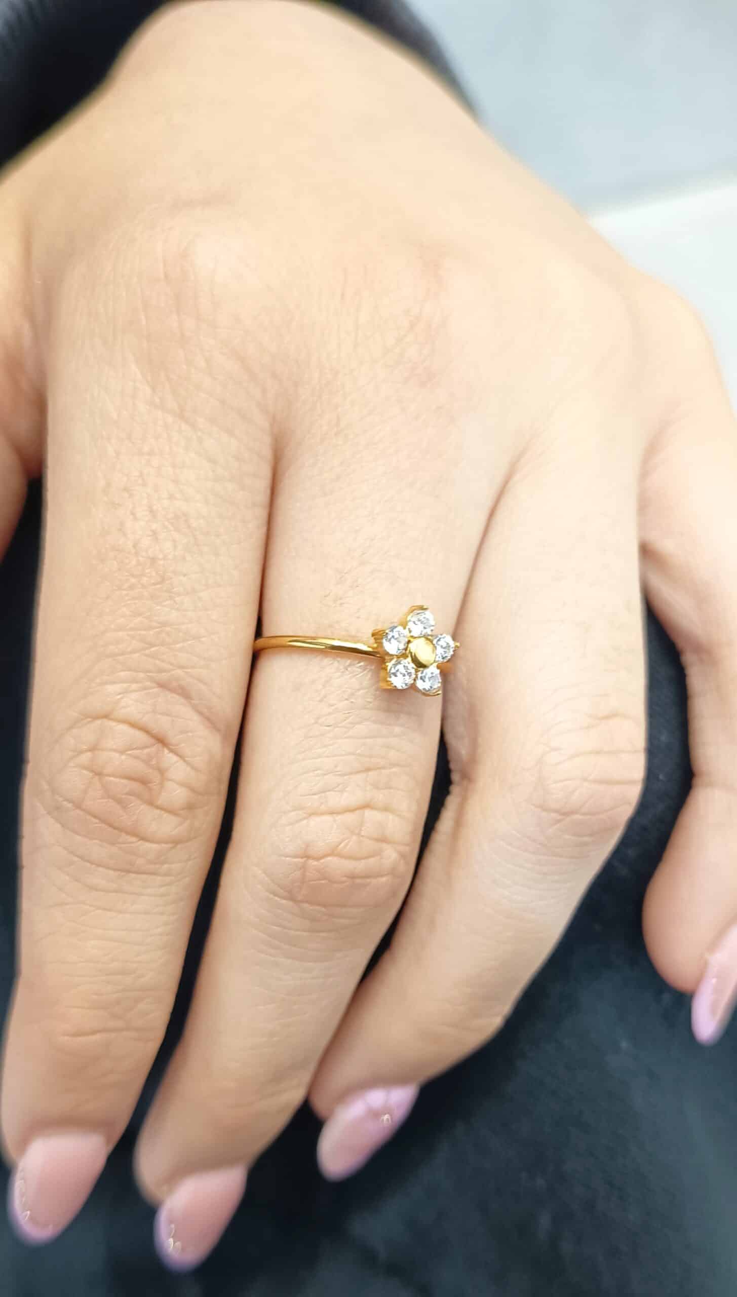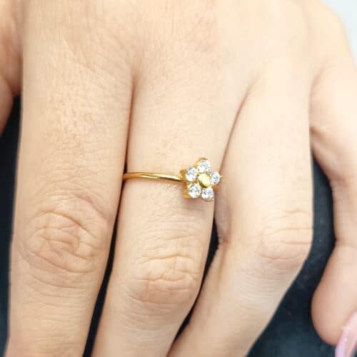 Jolie bague en acier inoxydable doré, surmontée d’une petite fleur en ornée de strass blanc transparent.
