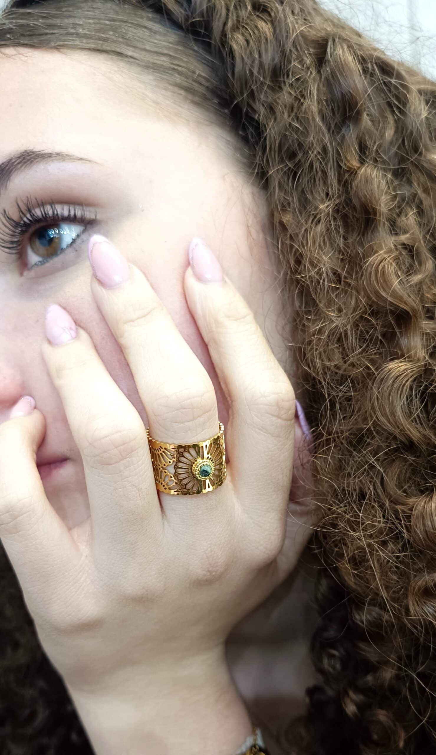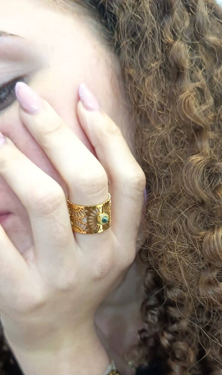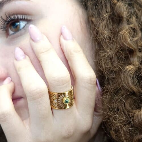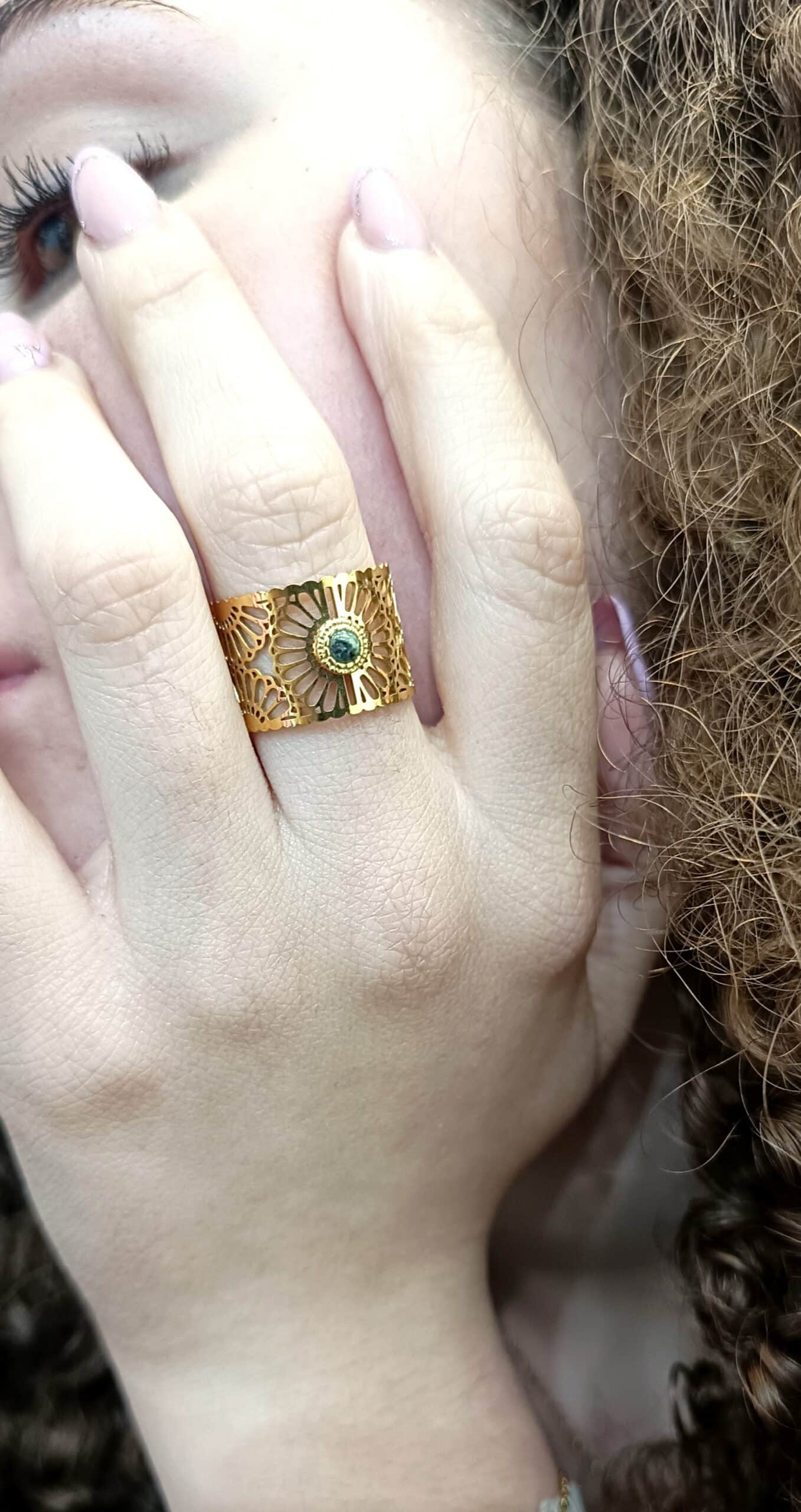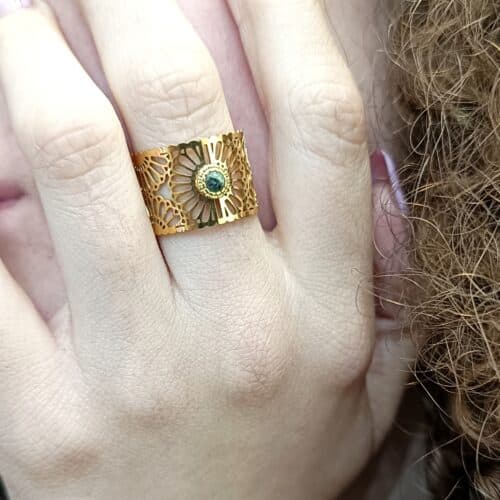 Bague en acier inoxydable doré, ajourée en forme de petites fleurs, avec une petite pierre turquoise africaine.