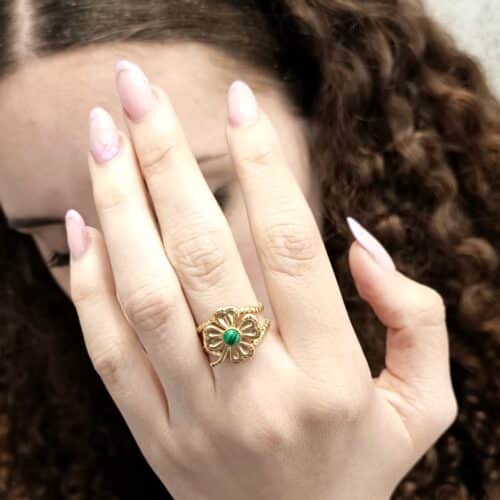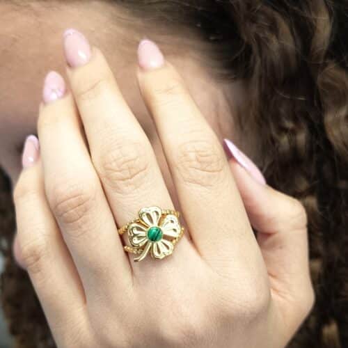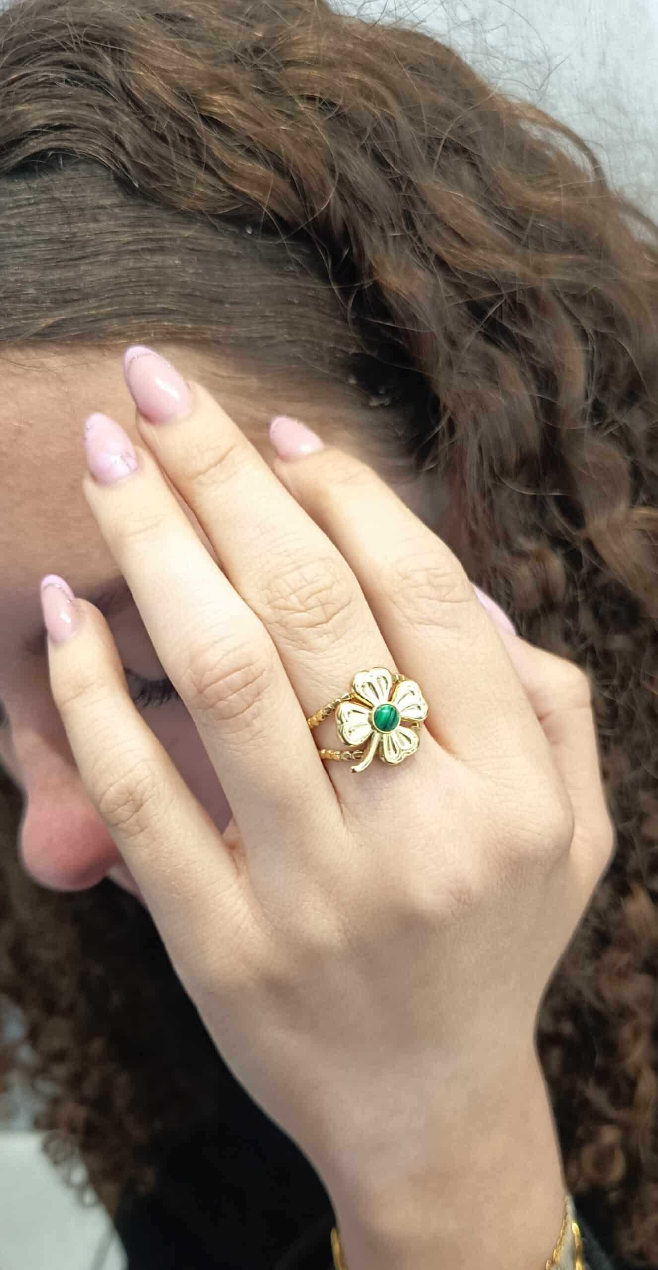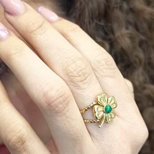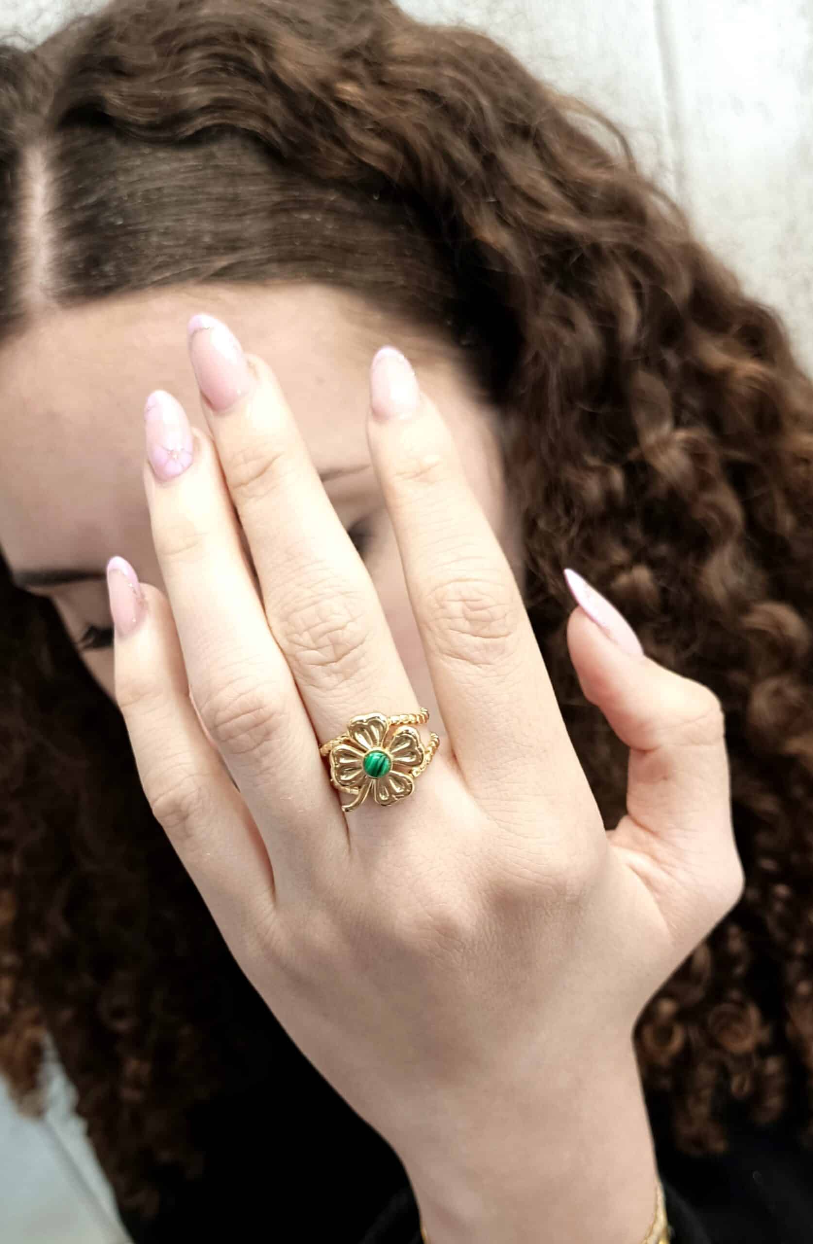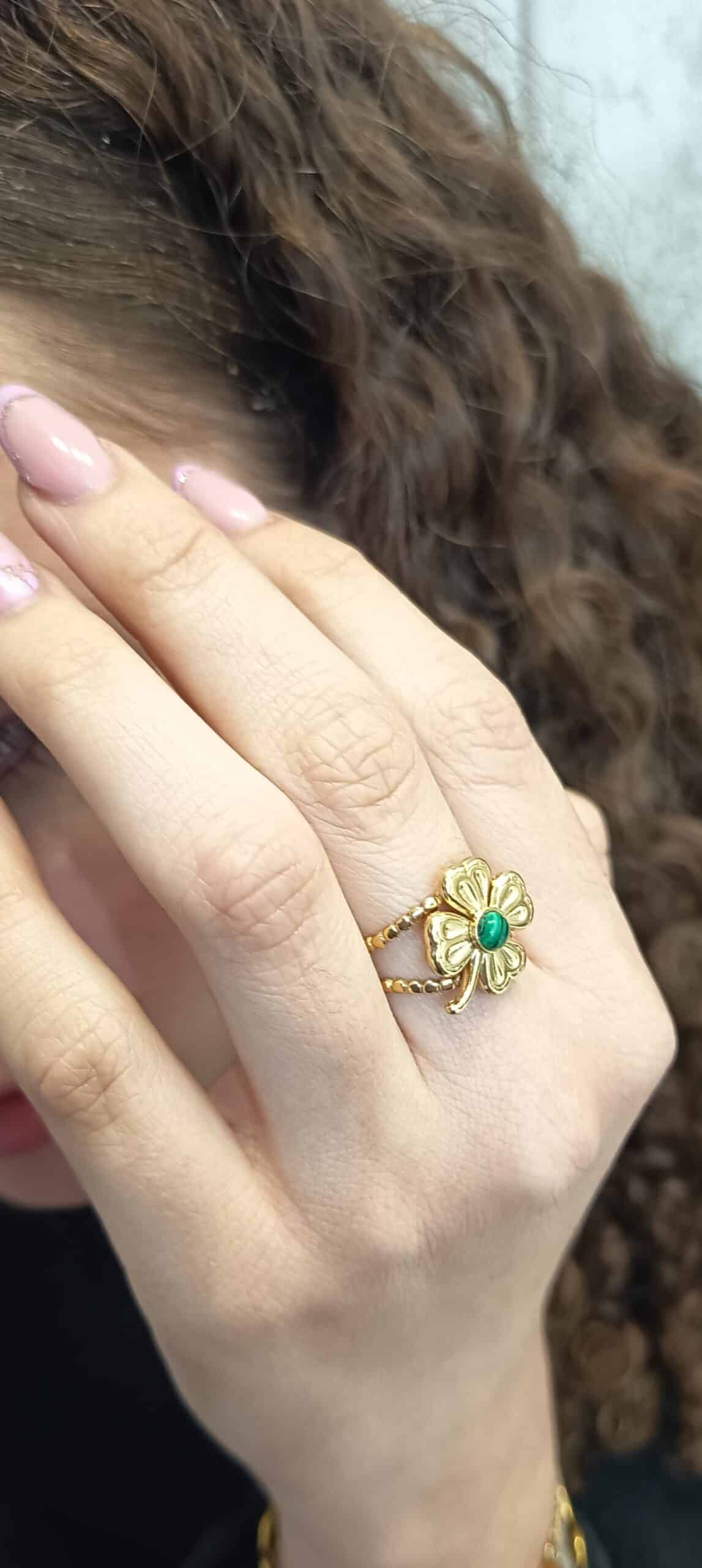 Jolie bague en acier inoxydable doré en forme de trèfle à 4 feuilles avec une petite pierre verte malachite.