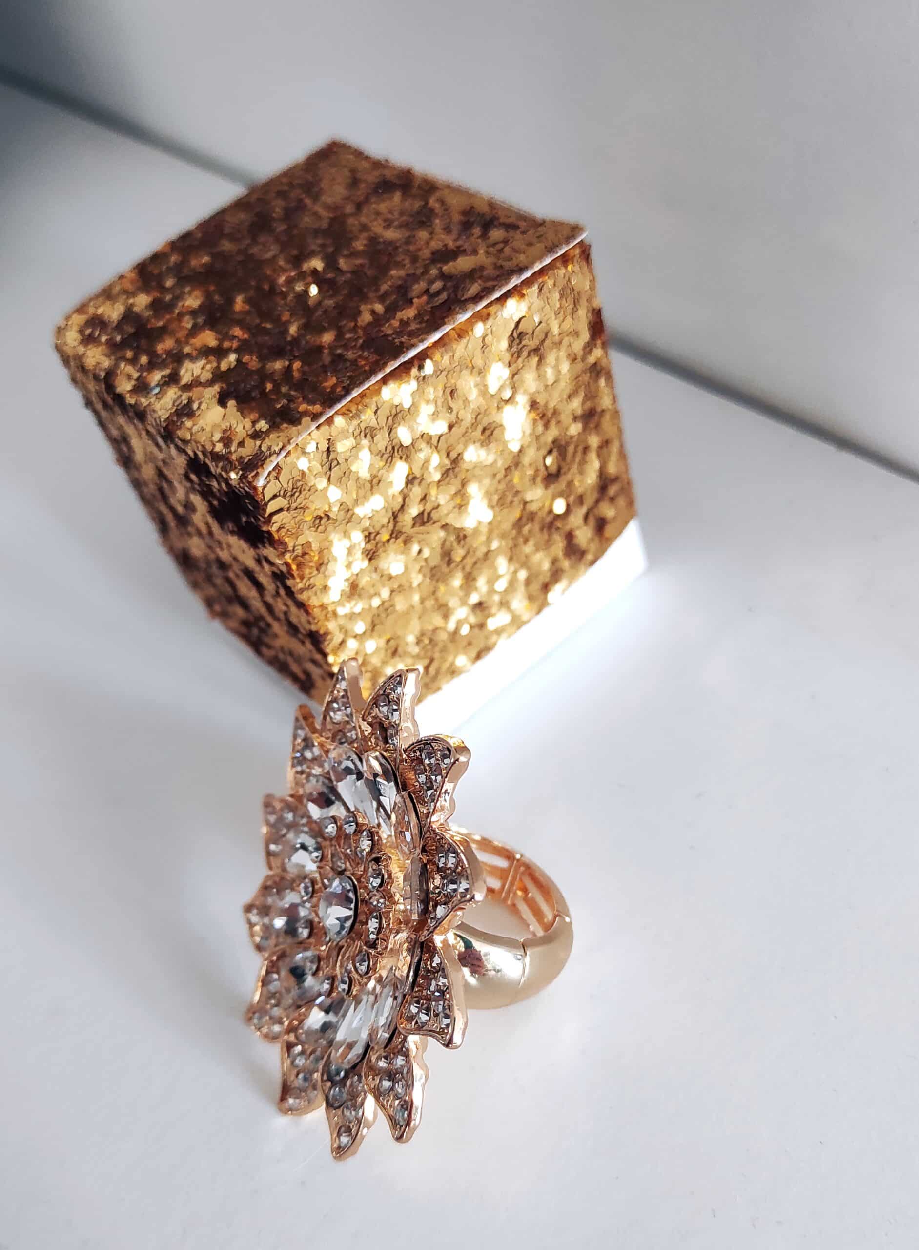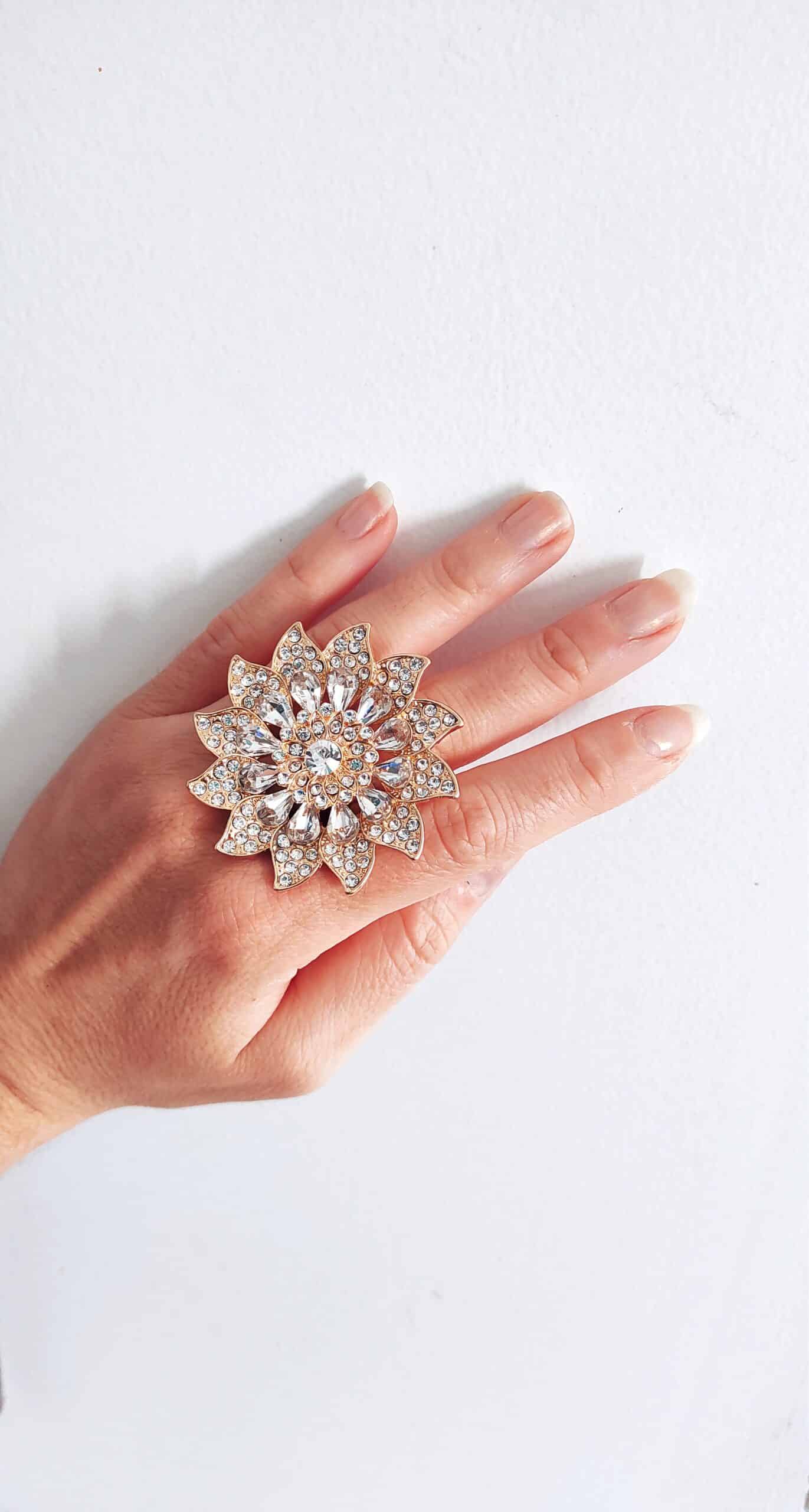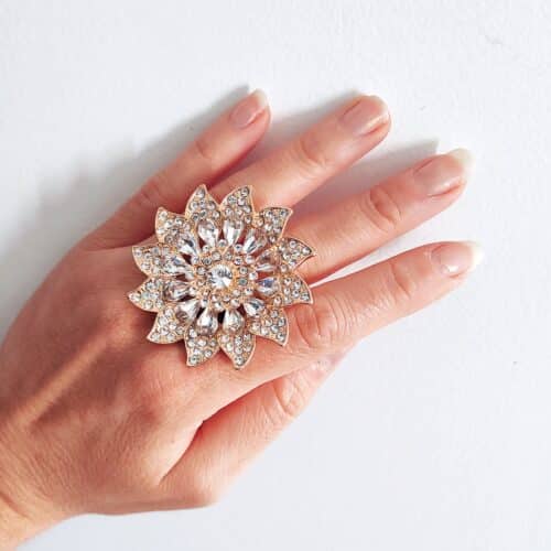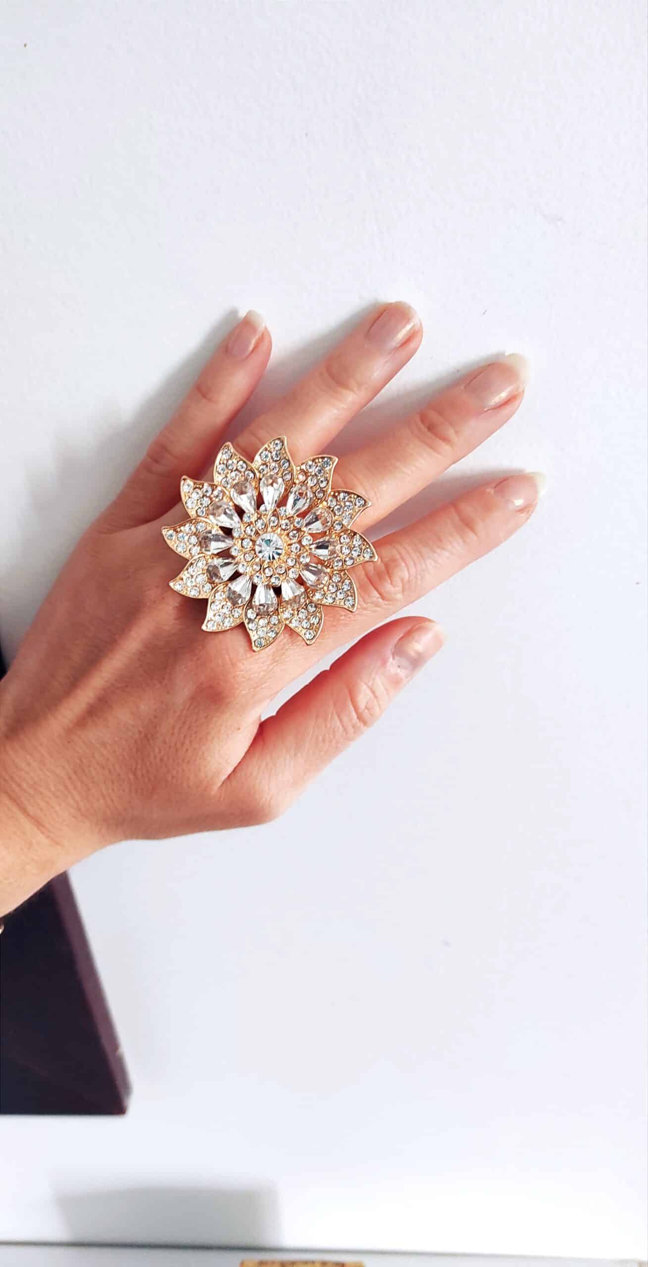Subliment bague fantaisie en métal doré en forme de grosse fleur strassée. Bague « élastique » pouvant s’adapter à votre doigt facilement.