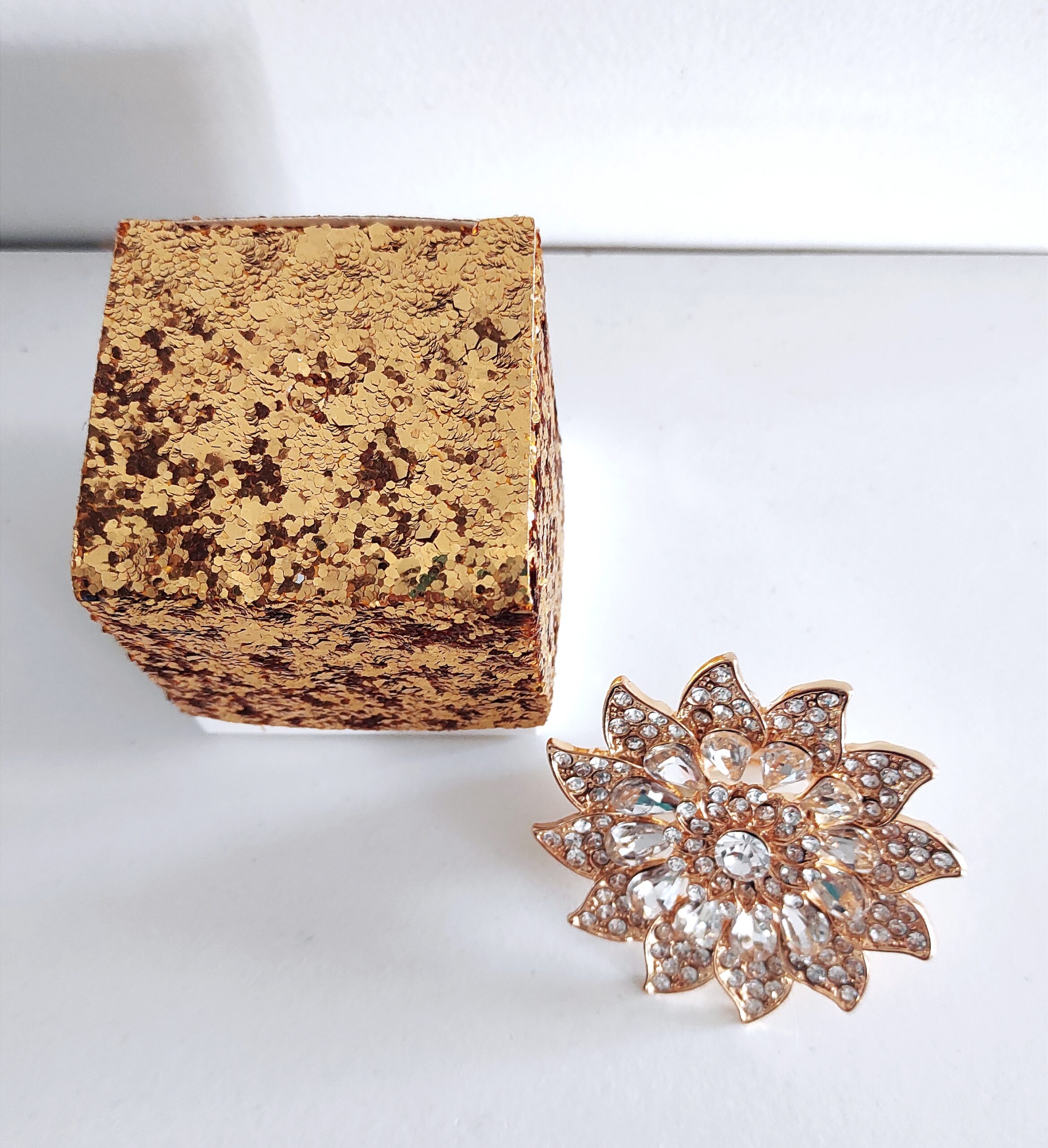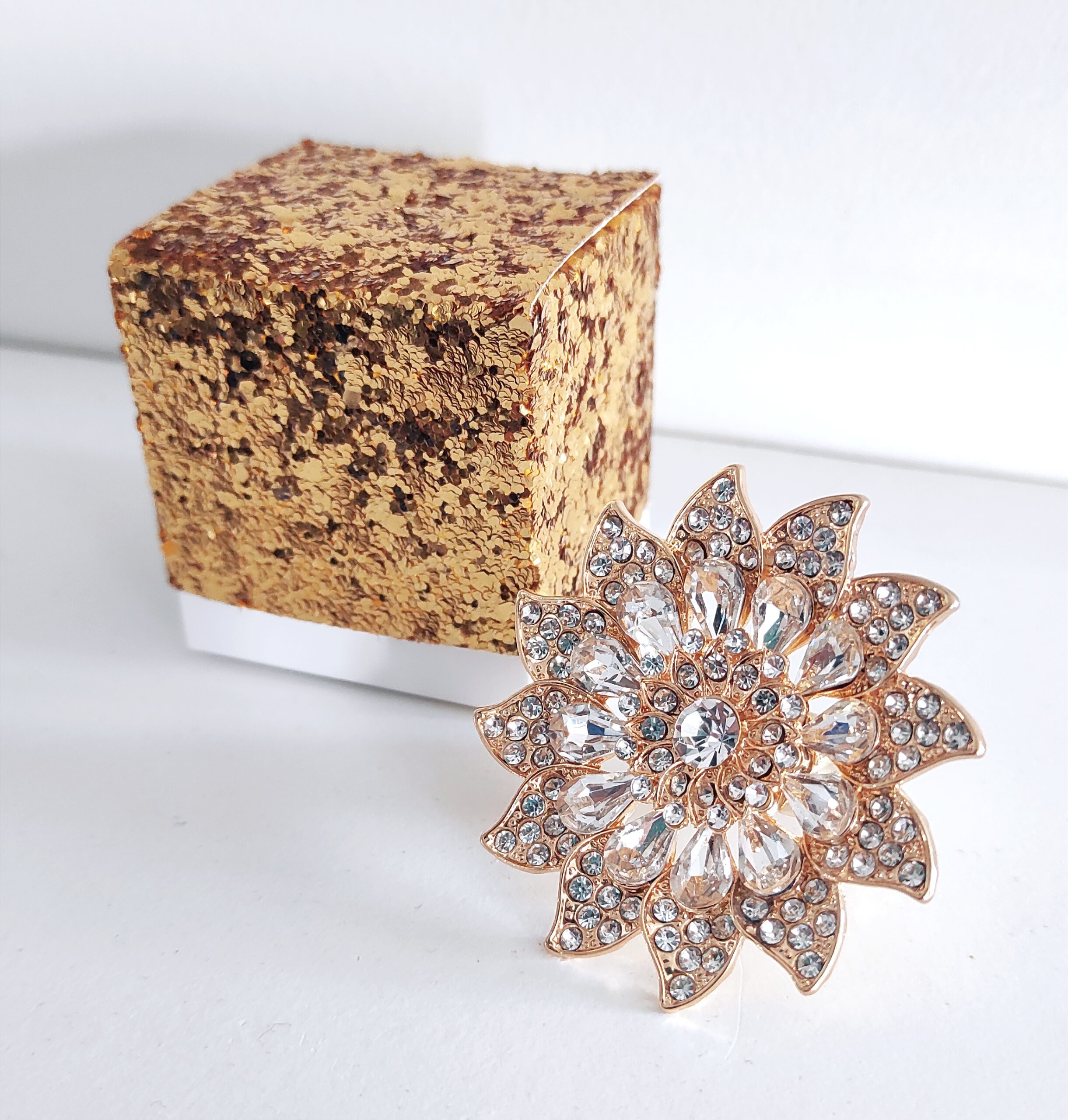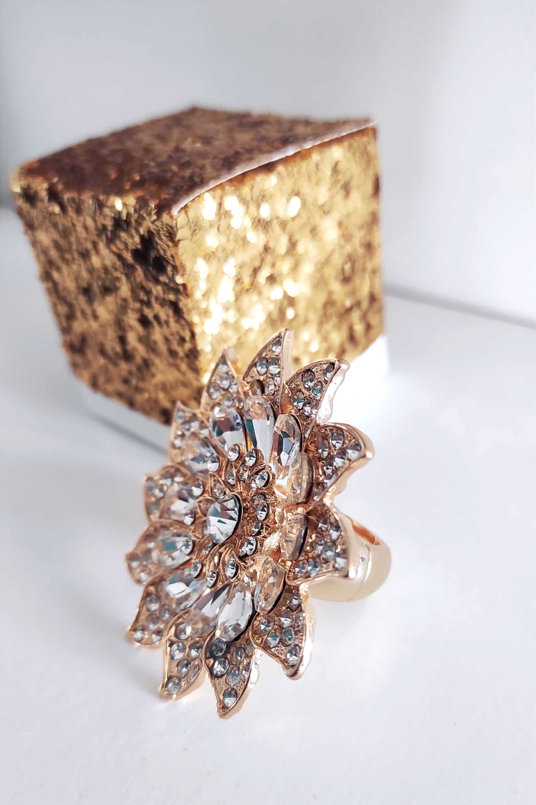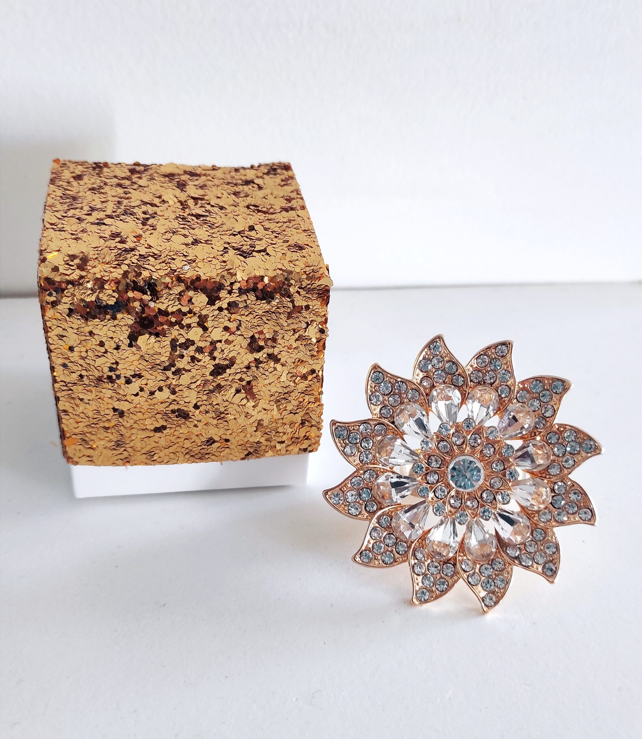 Subliment bague fantaisie en métal doré en forme de grosse fleur strassée. Bague « élastique » pouvant s’adapter à votre doigt facilement.