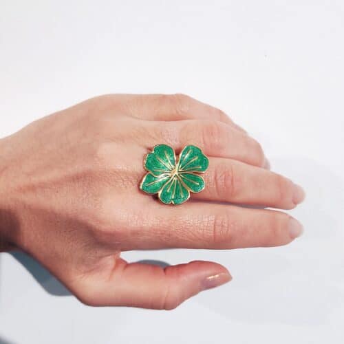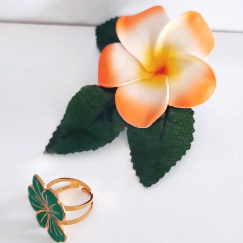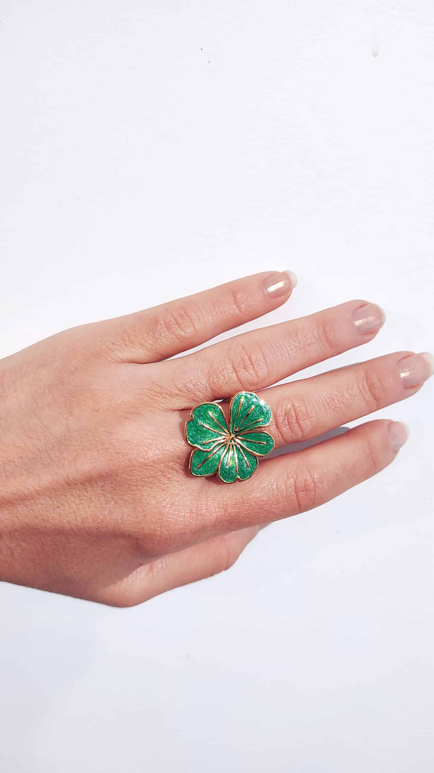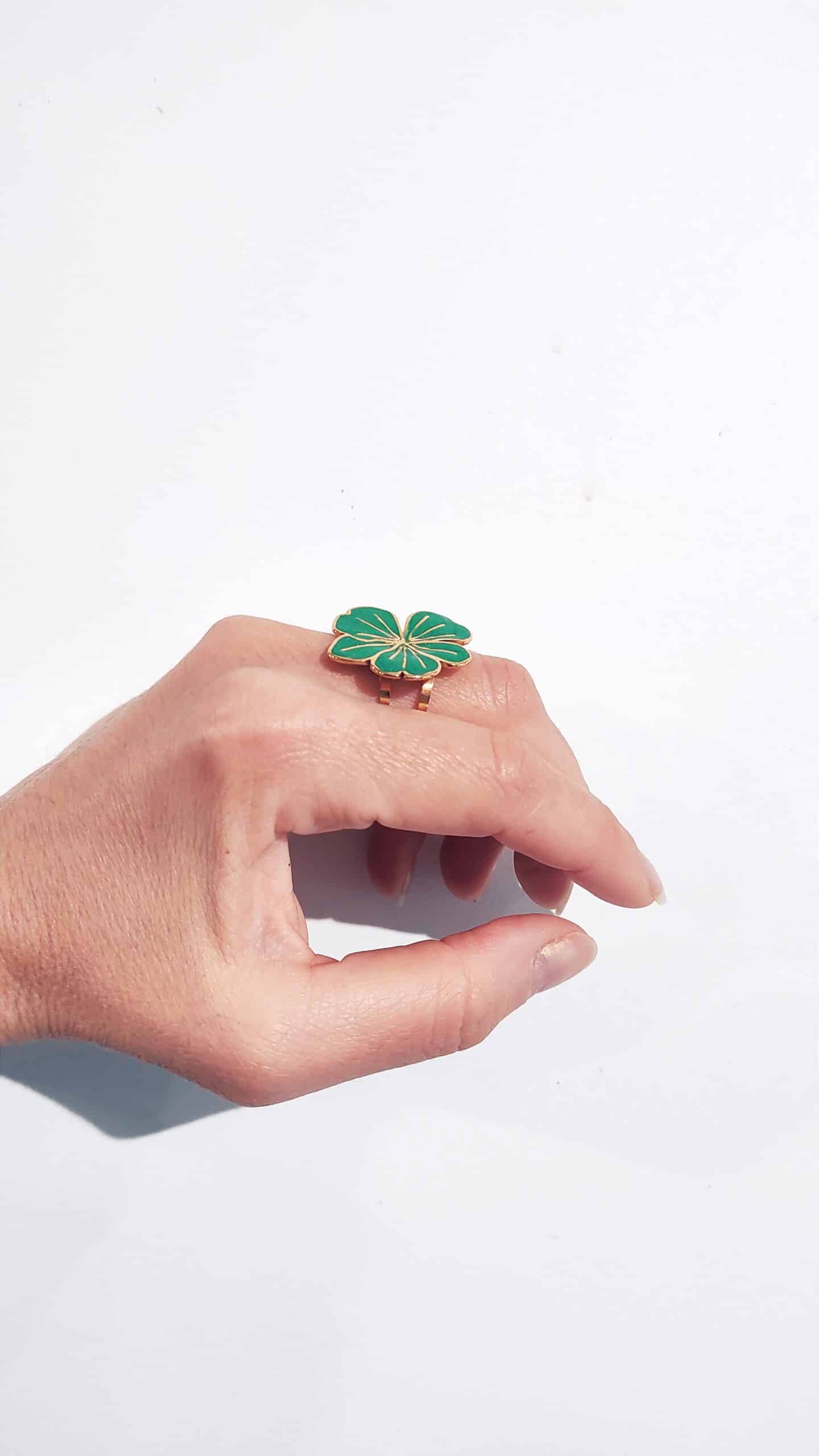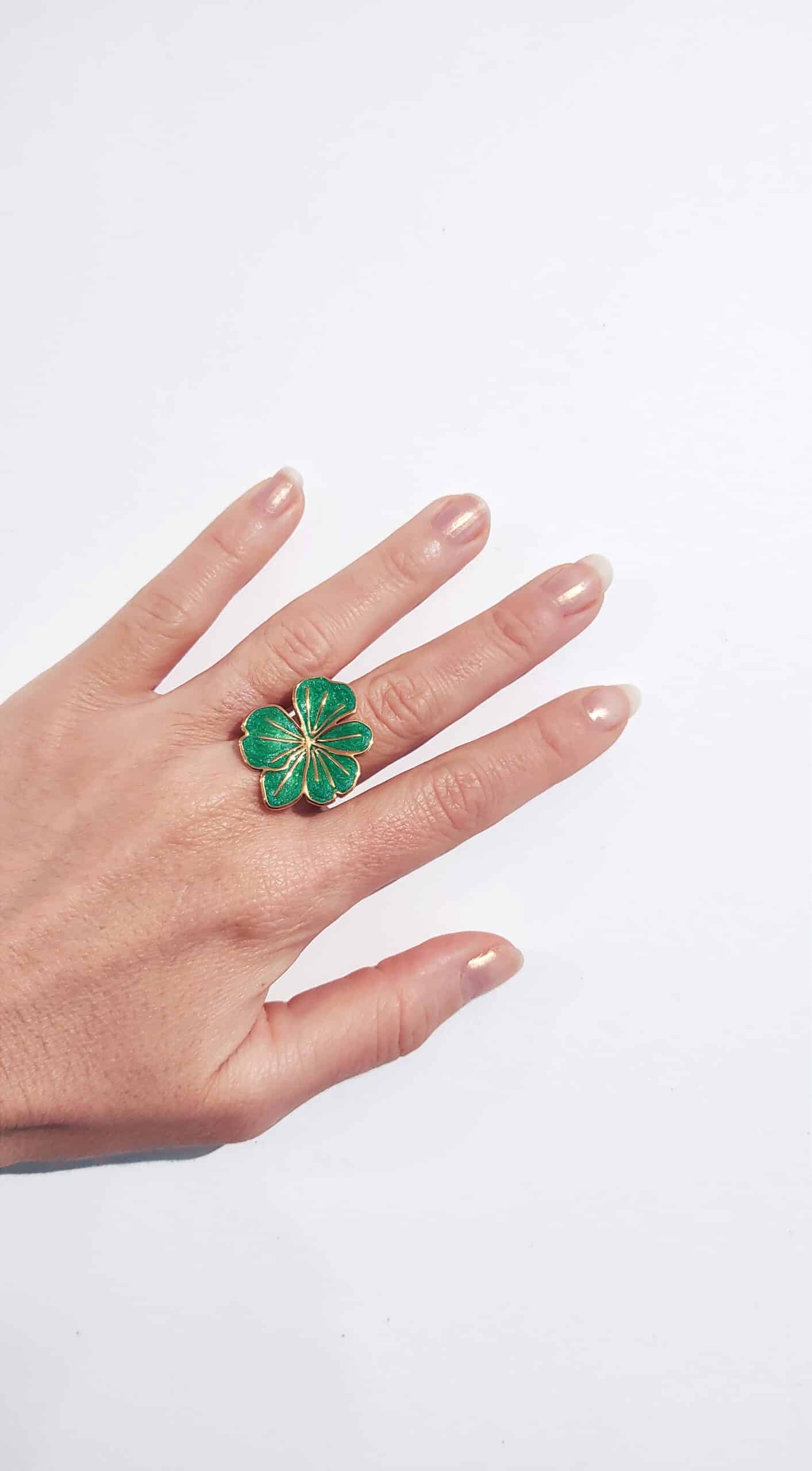 Magnifique bague en acier inoxydable doré en forme de fleur type magnolia de couleur verte.