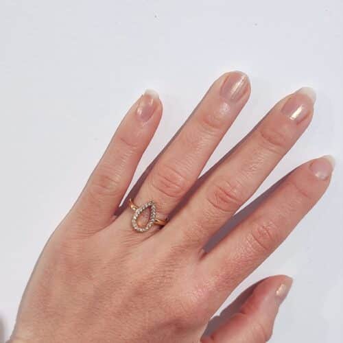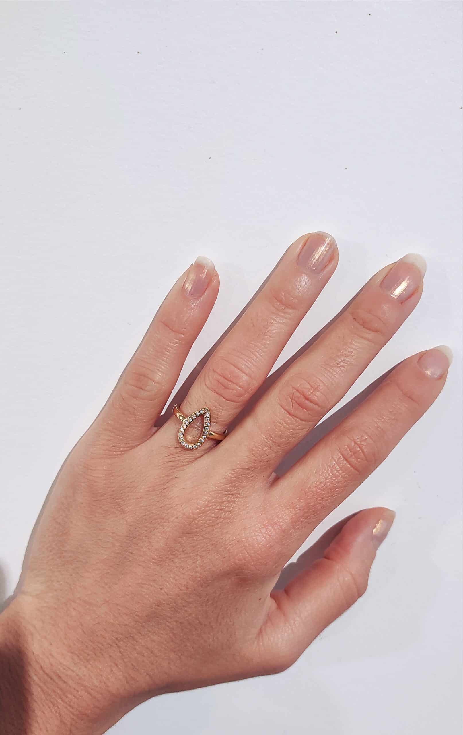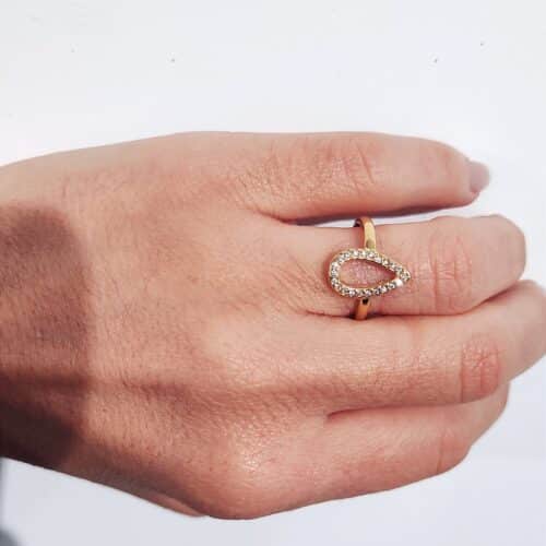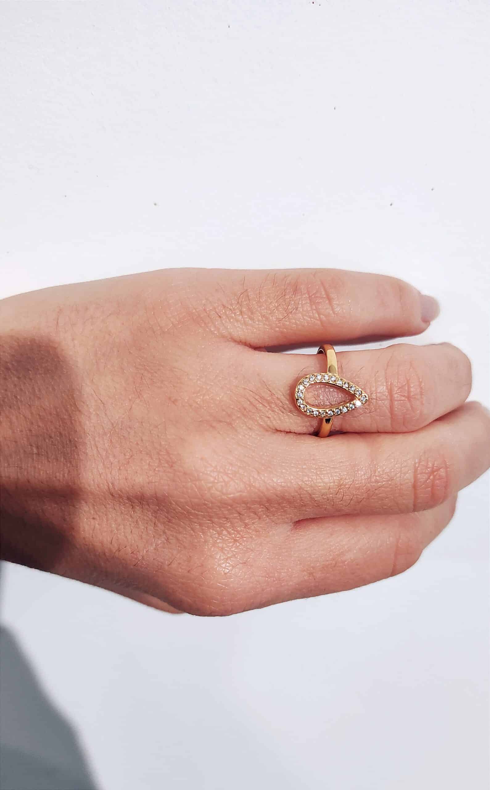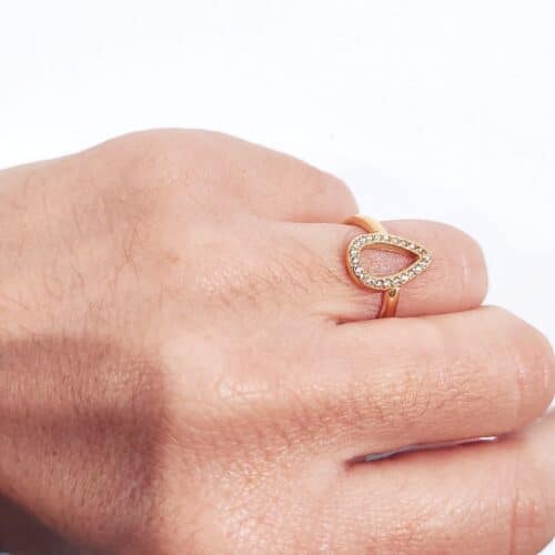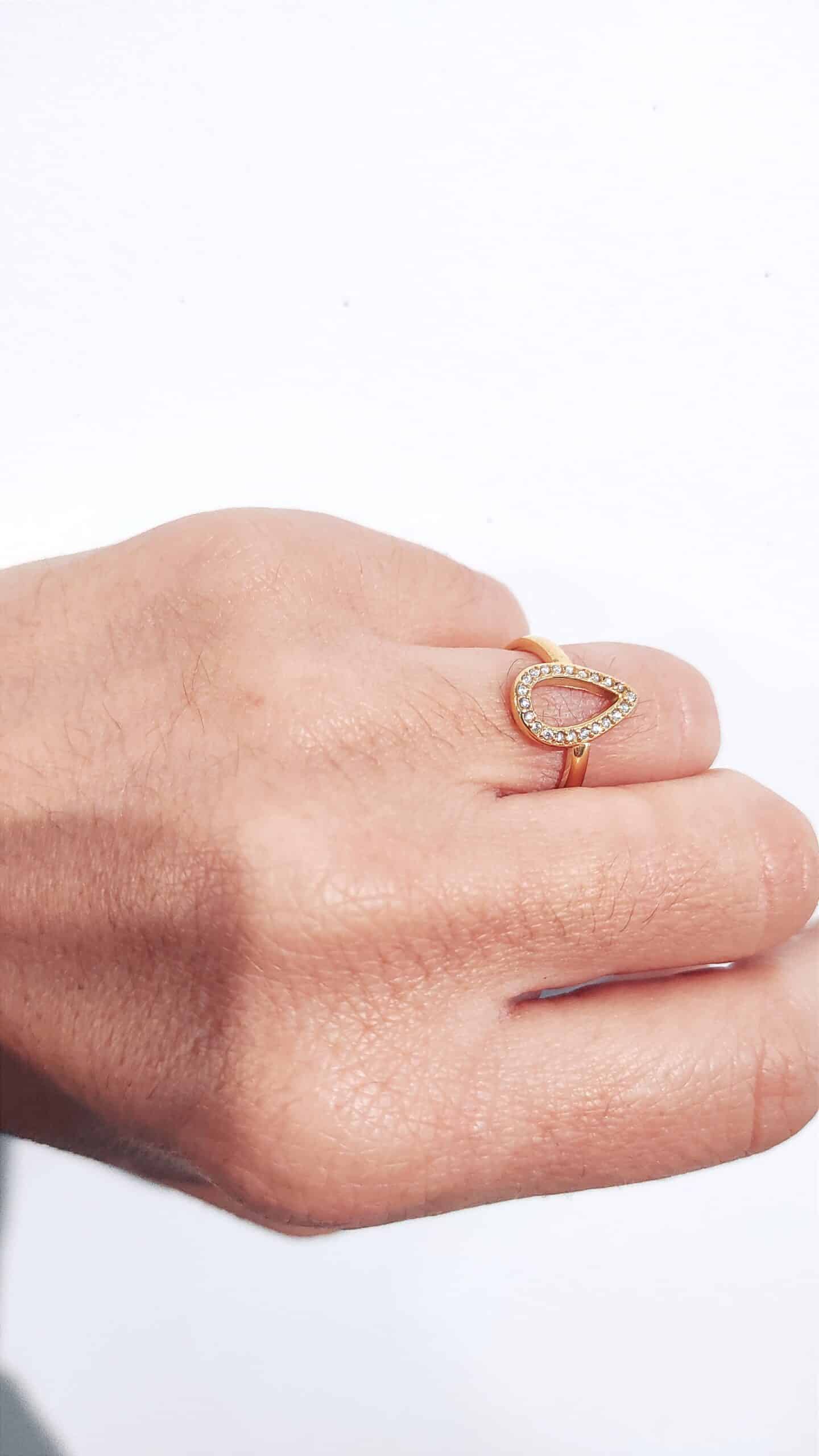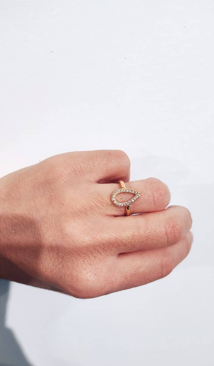 Bague en acier inoxydable doré en forme de goutte ornée de strass. Bague raffiné et moderne en même temps. La goutte mesure 1,5cm de hauteur et 0,9cm de largeur, avec un diamètre de 1,7cm.