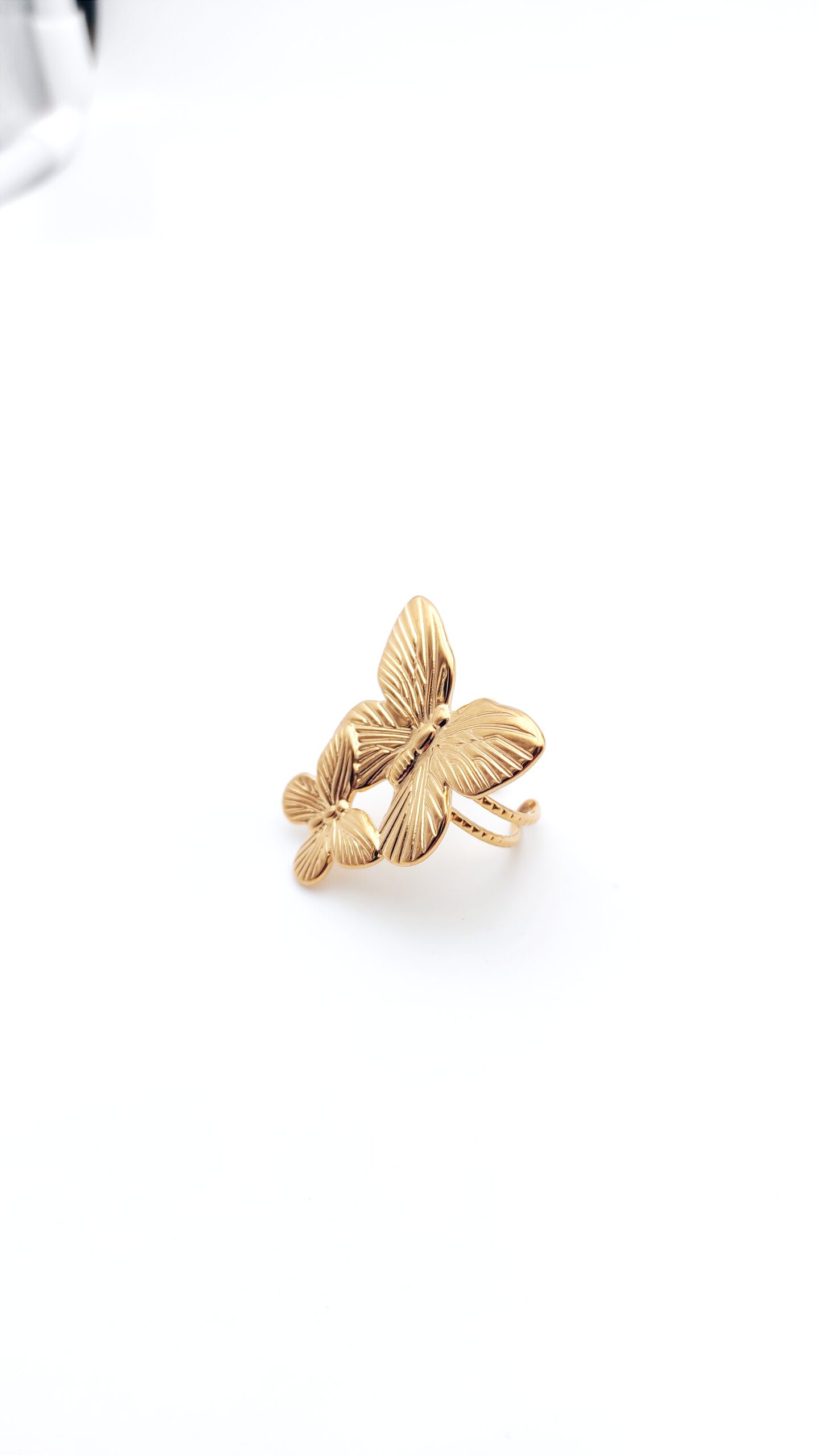 Bague en acier inoxydable doré de marque Mile Mila. Bague ajustable avec deux papillons, un plus gros que l’autre comme alignés prêts à s’envoler 🦋 Distingué et chic.
