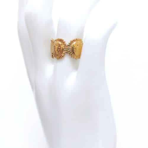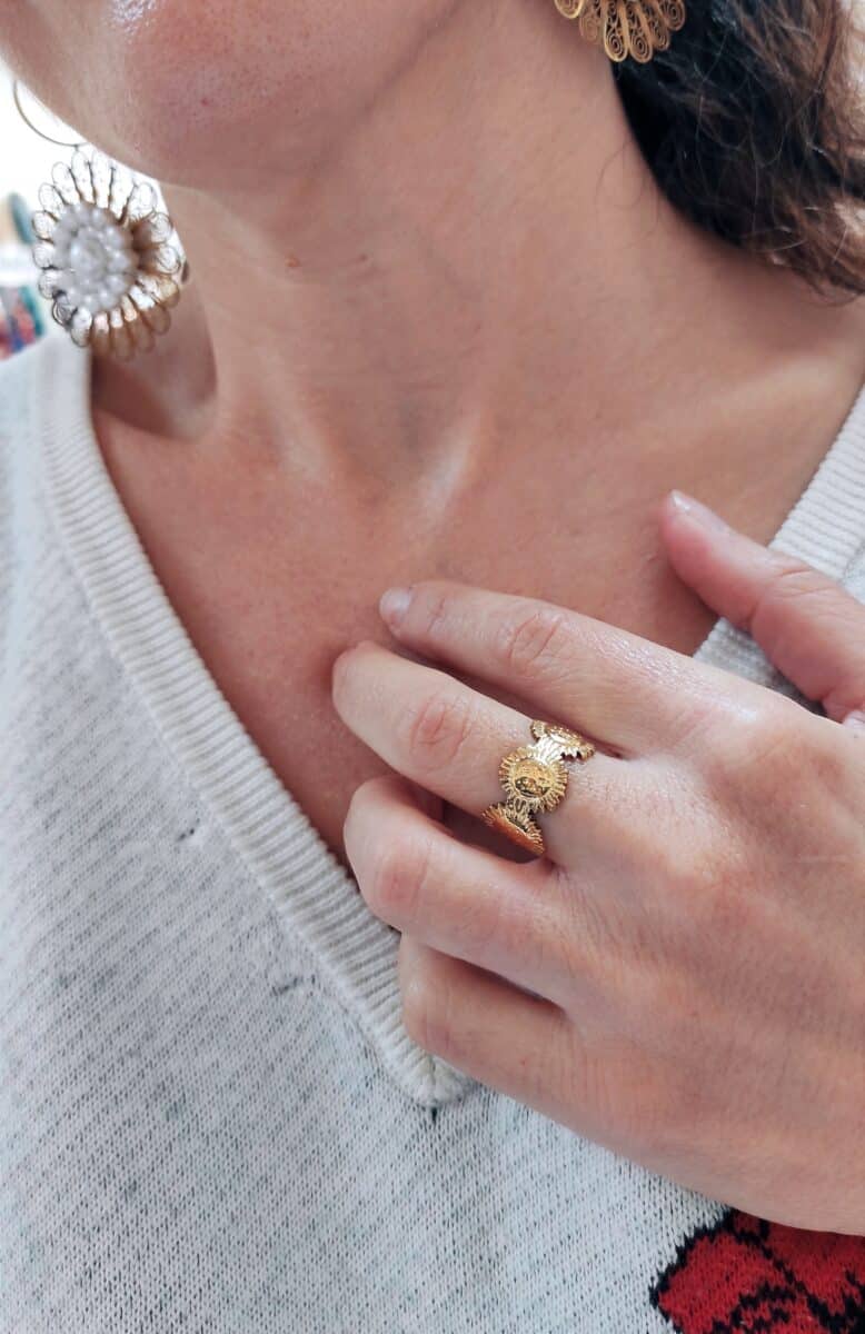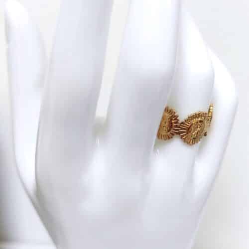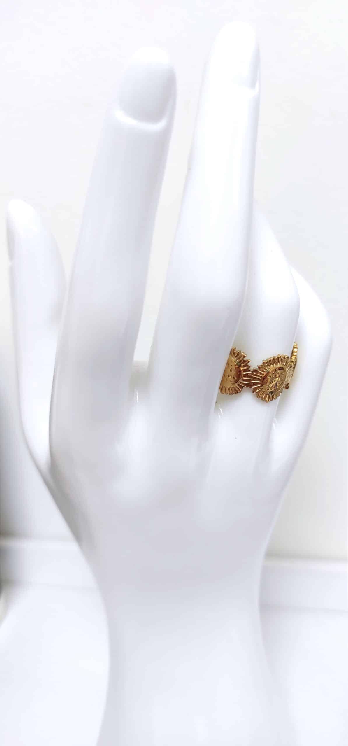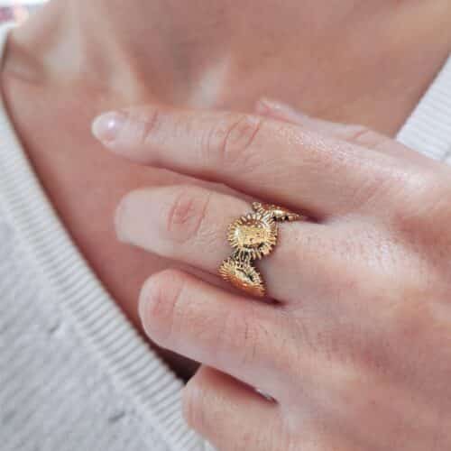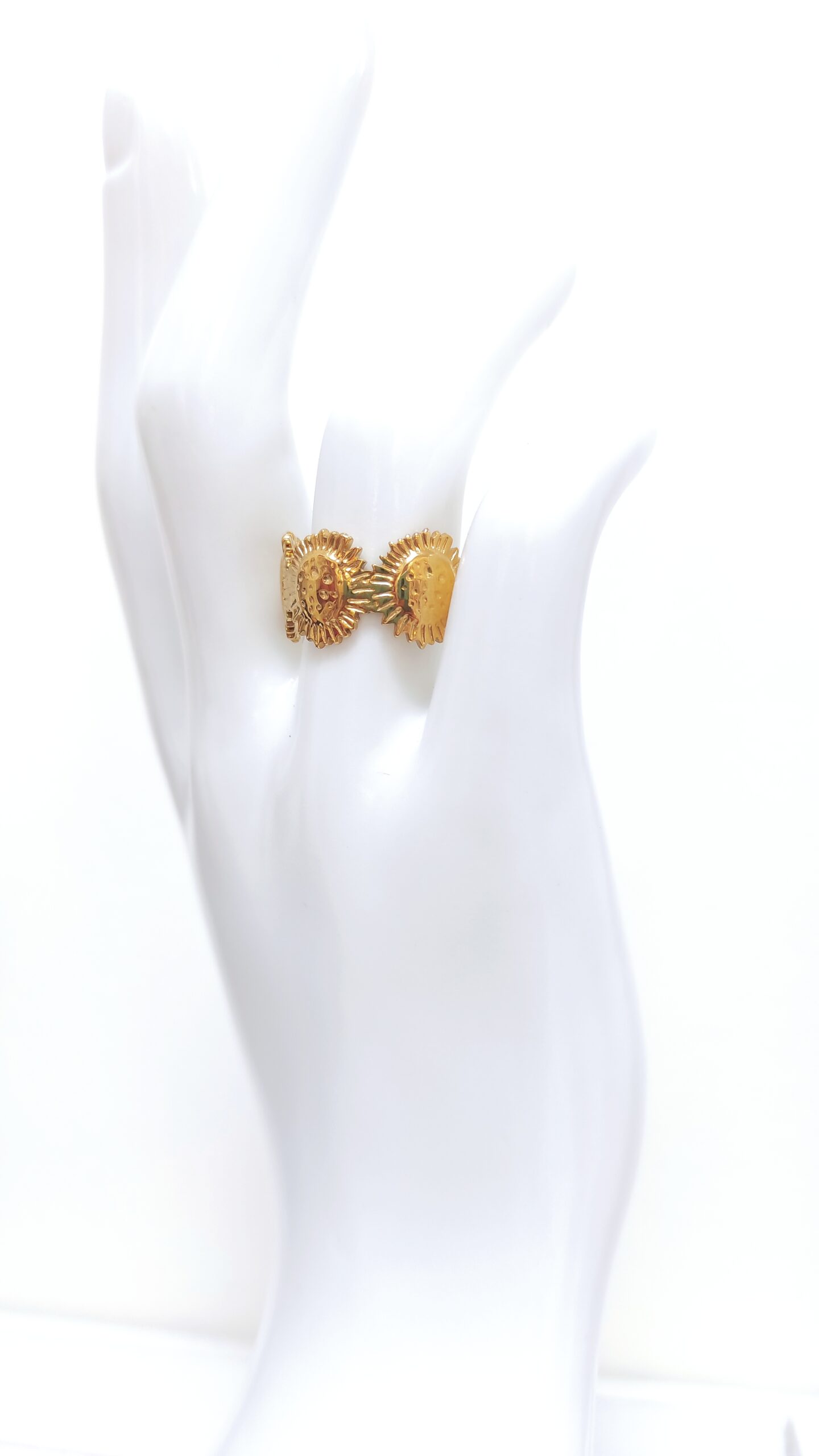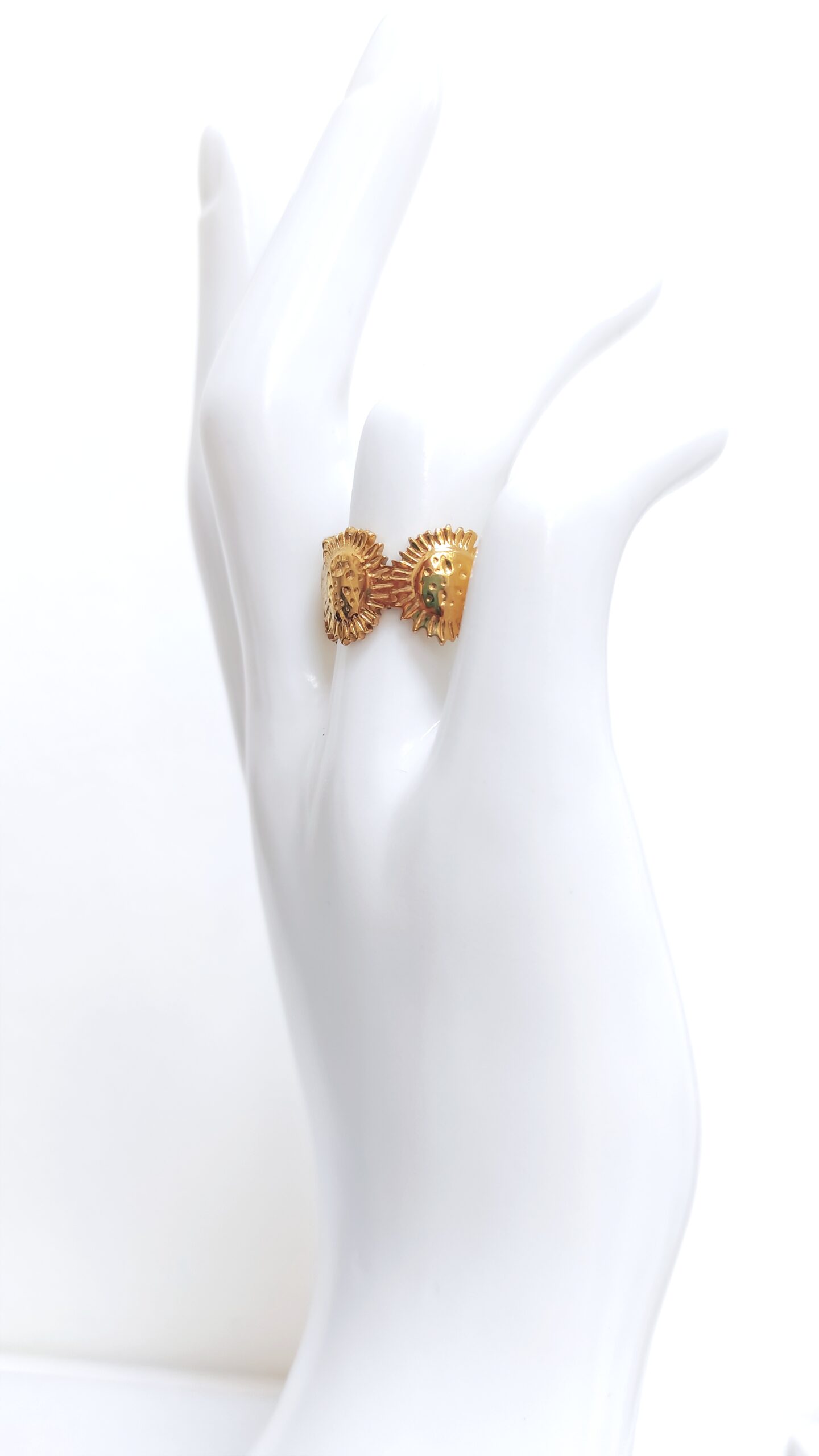 Bague en acier inoxydable doré de marque Mile Mila. Bague ajustable mesurant environ 1,8cm de diamètre et pouvant bien évidemment se régler à votre doigt. Les soleils mesurent 1cm de largeur. Bijoux pouvant facilement se porter quotidiennement. Le soleil est un joli symbole positif de la vie et de l’énergie. Cadeau touchant ☀️🎁