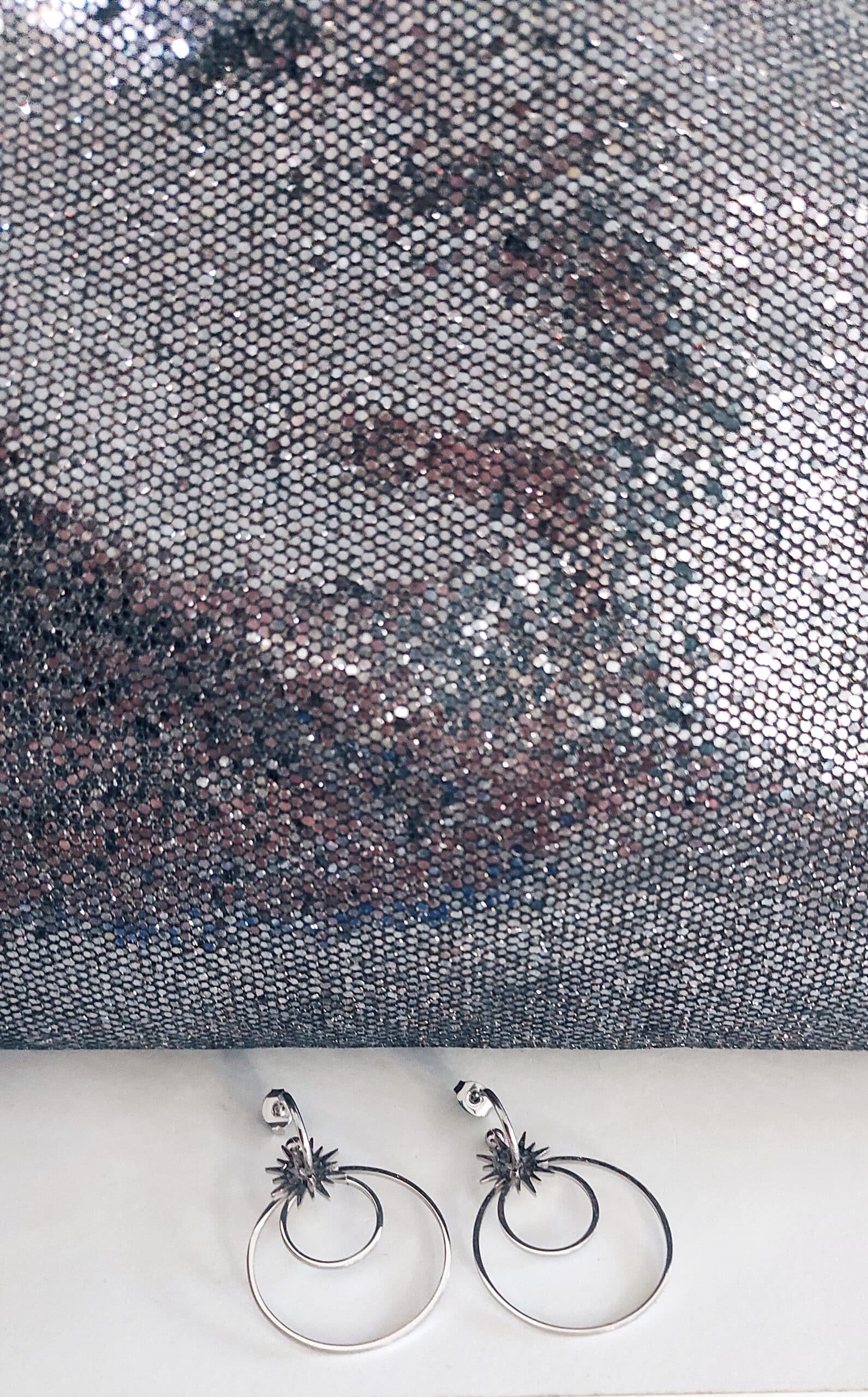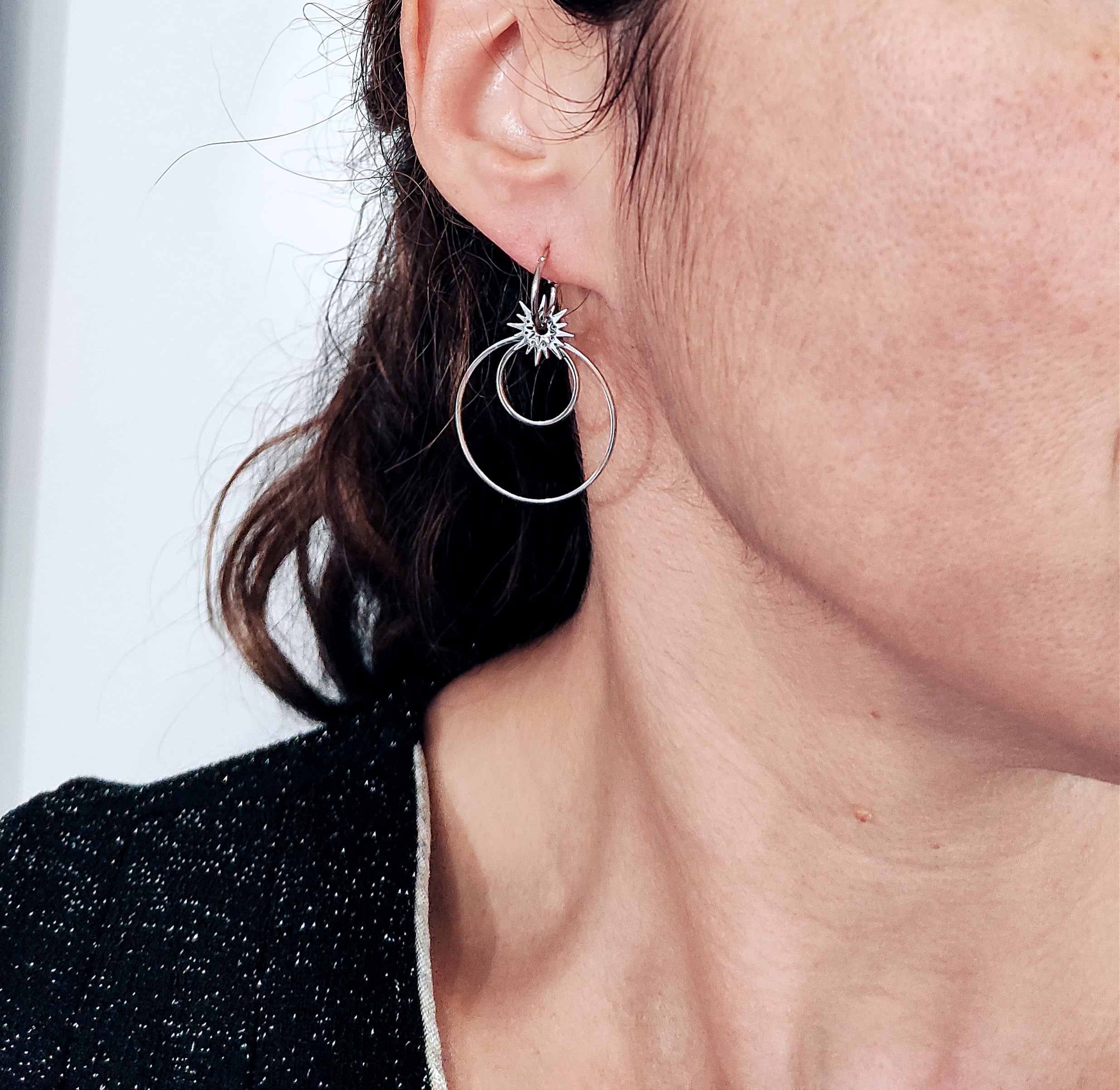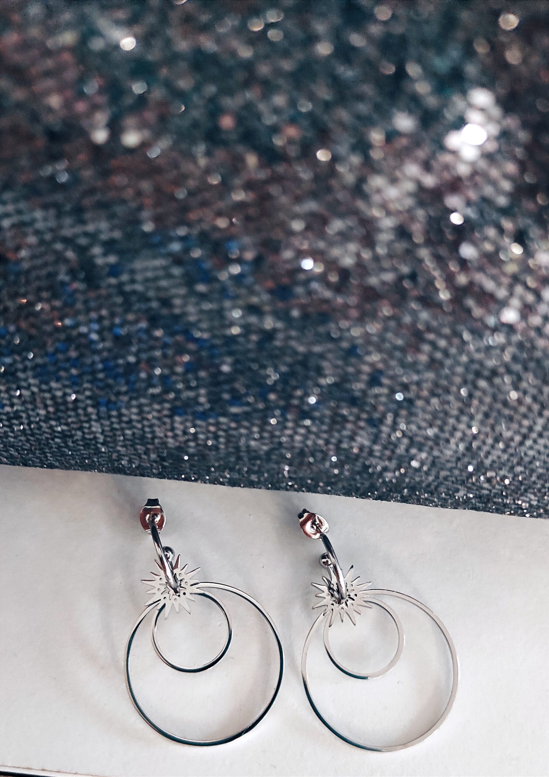 Boucles d’oreilles en acier inoxydable de forme doubles anneaux avec une petite breloque en étoile, le tout monté sur une créole, se fermant avec un fermoir.