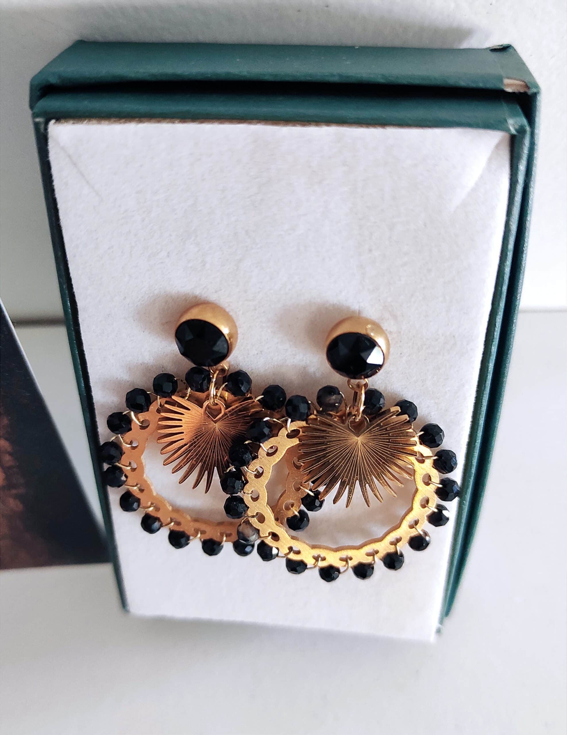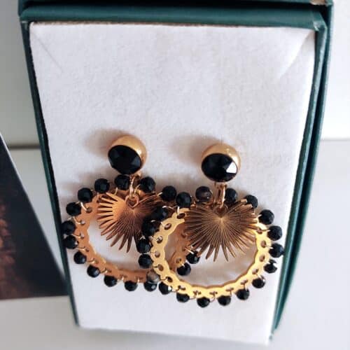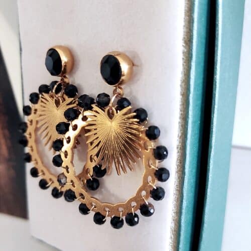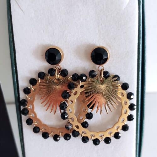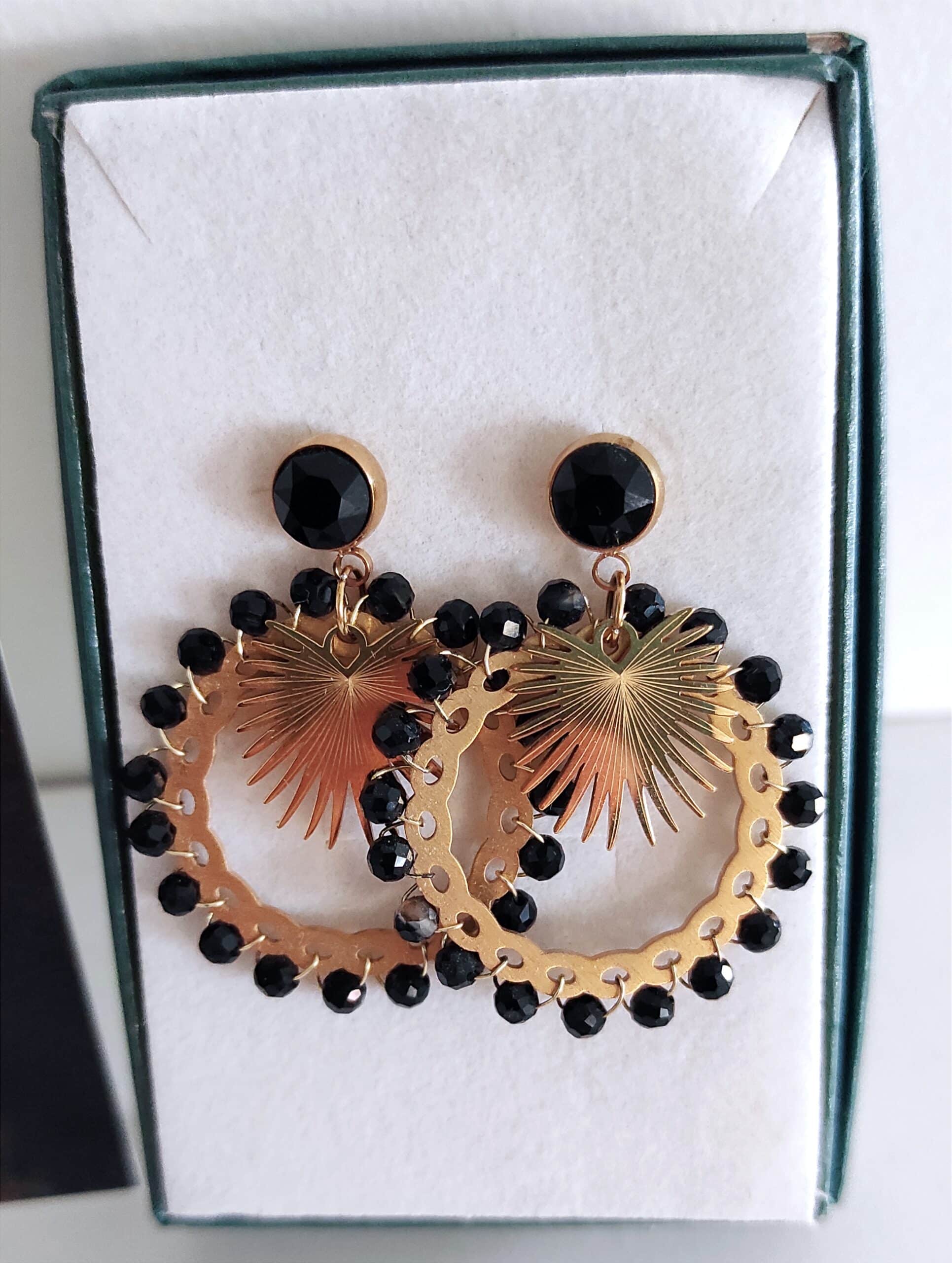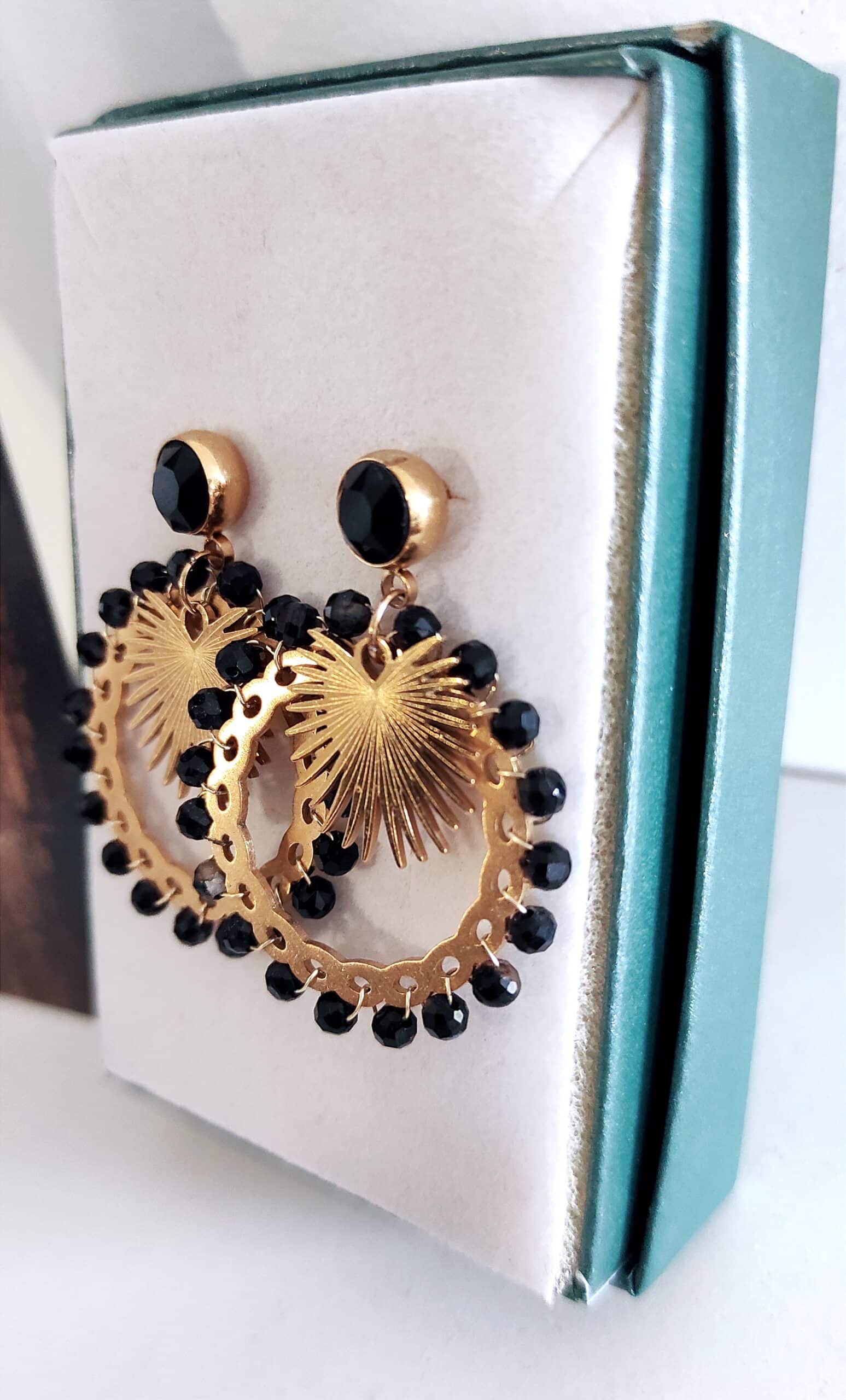 Belles boucles d’oreilles de forme ronde en acier inoxydable doré de marque Habaha. Elles sont ornées de petites perles en agate noire et une plus grosse pierre noire en onyx.