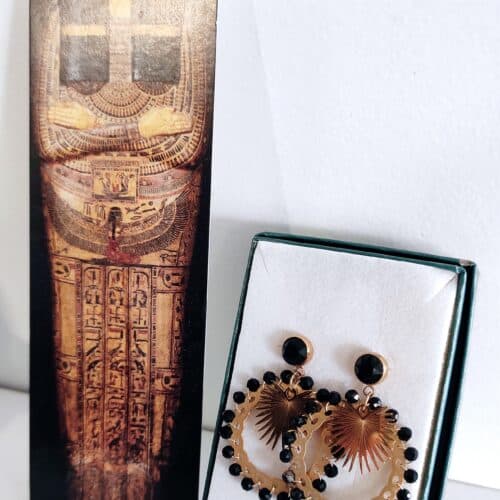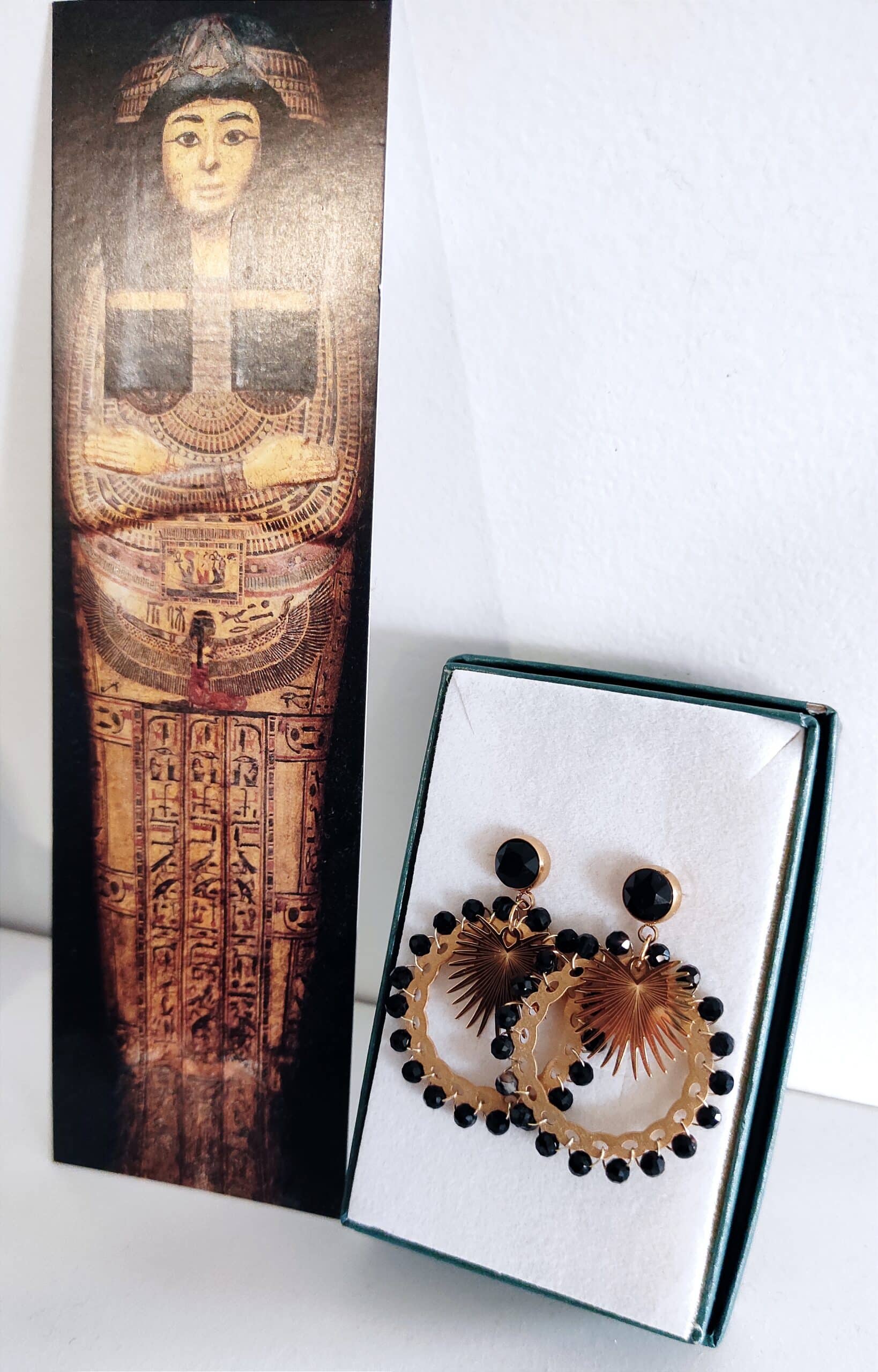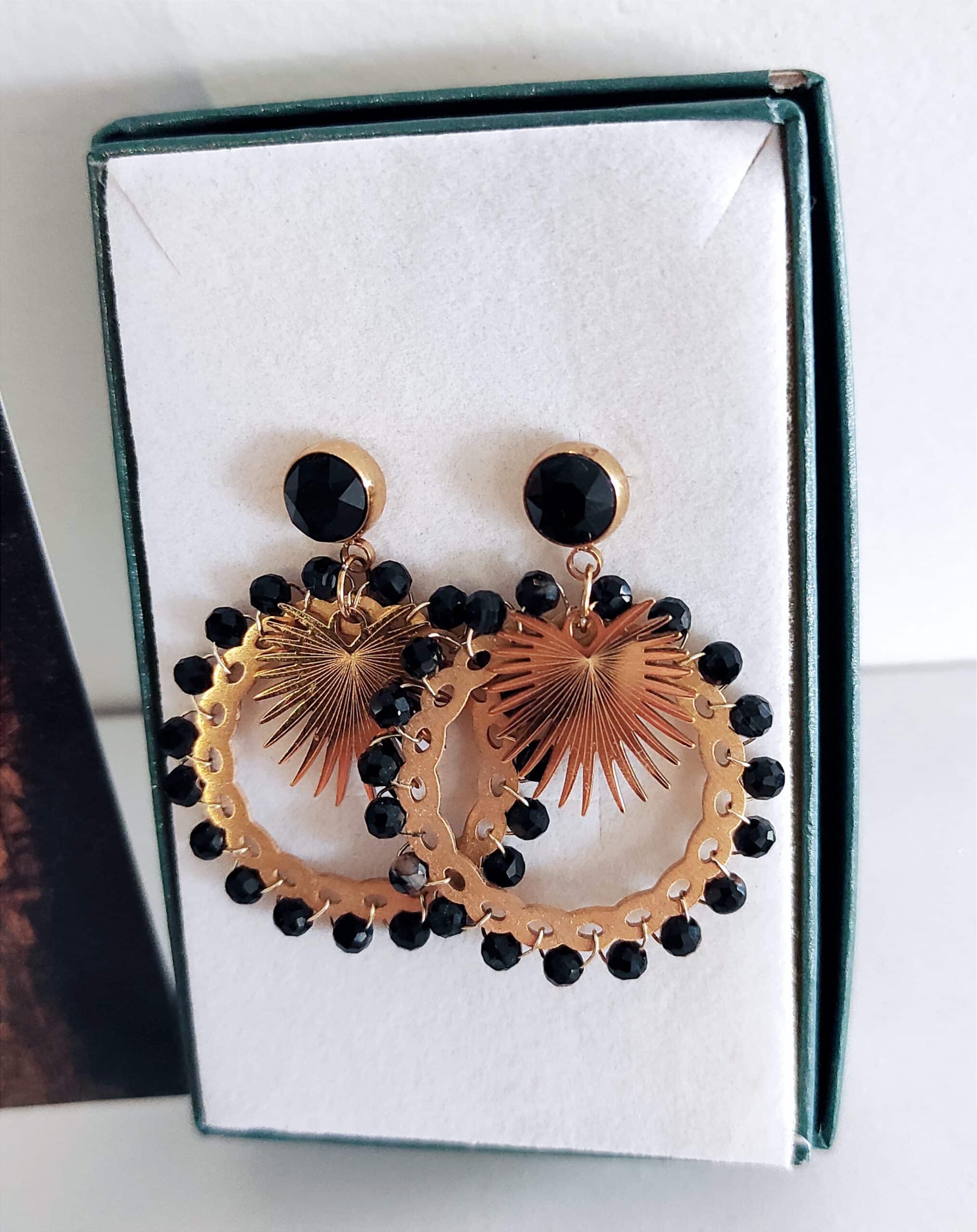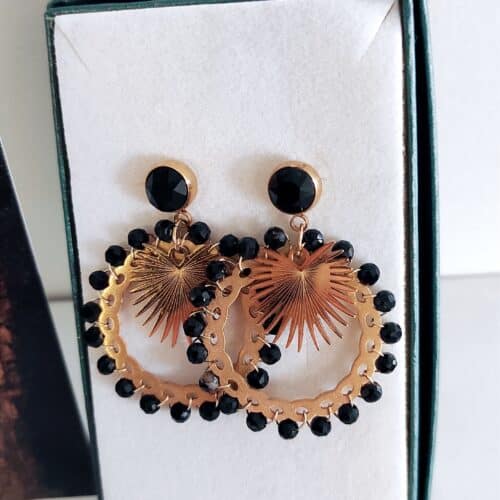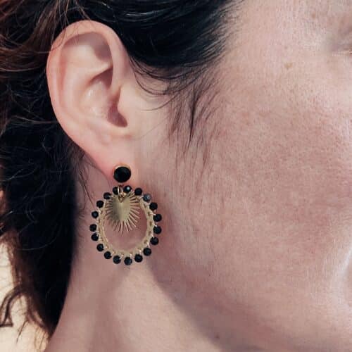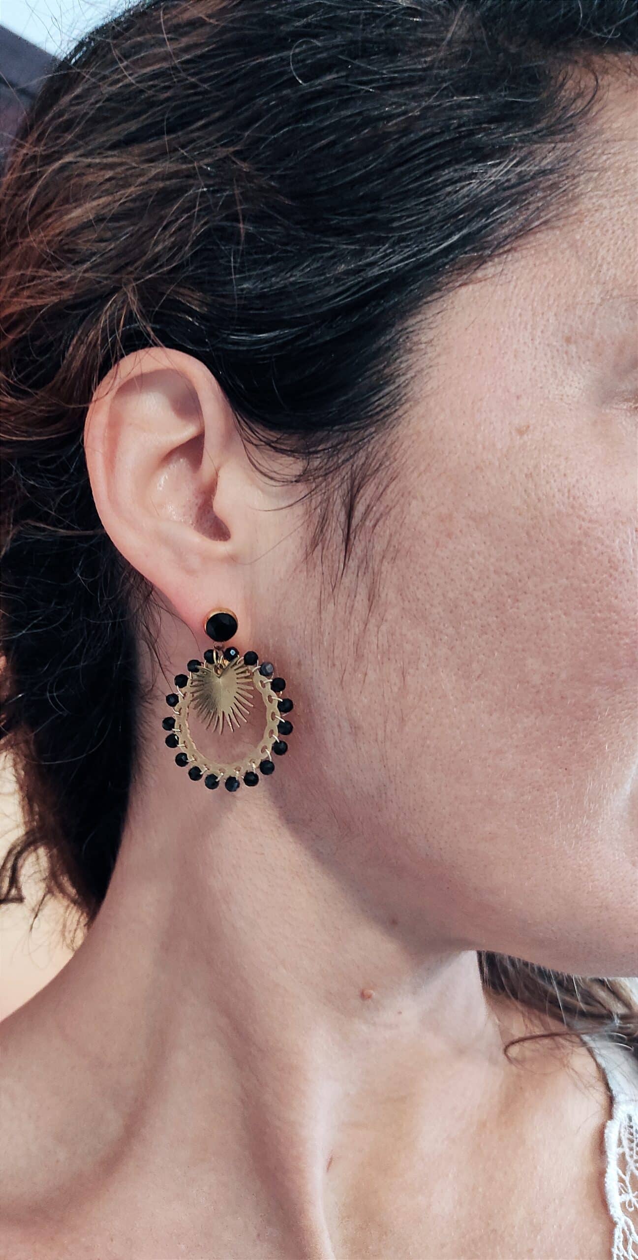 Belles boucles d’oreilles de forme ronde en acier inoxydable doré de marque Habaha. Elles sont ornées de petites perles en agate noire et une plus grosse pierre noire en onyx.