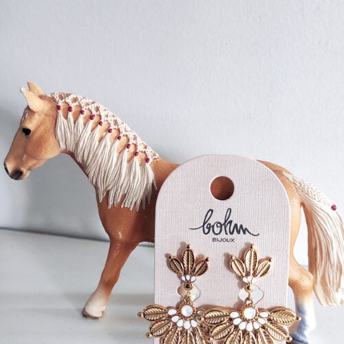 Boucles d’oreilles de marque Mile Mila en acier inoxydable doré. Boucles d’oreilles se terminant par des petites feuilles avec émail de différentes teintes de bleu. Boucles légères et mesurant 5cm de hauteur jusqu’à 3,7cm de largeur. Boucles classes et distinguées 👌