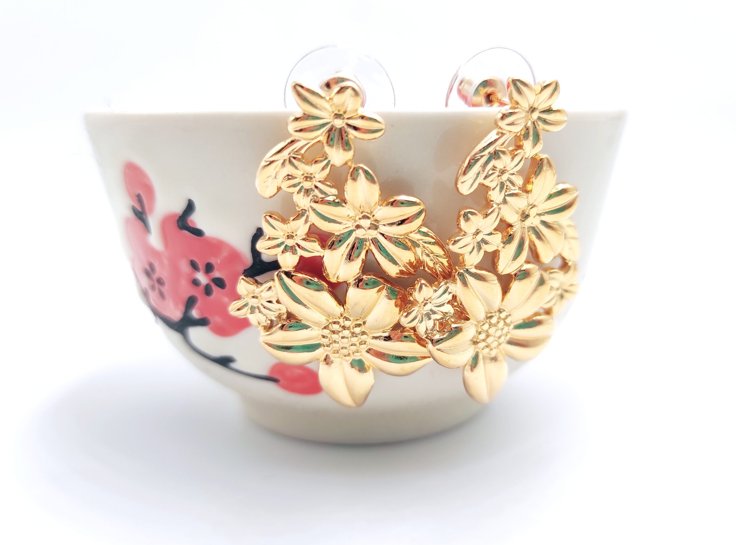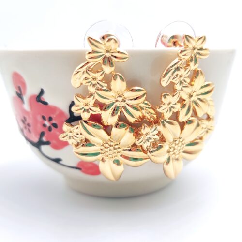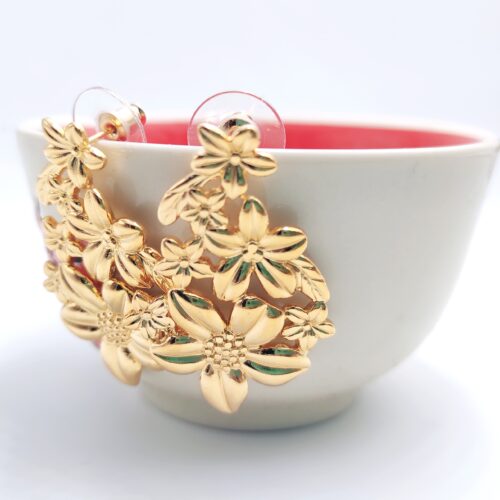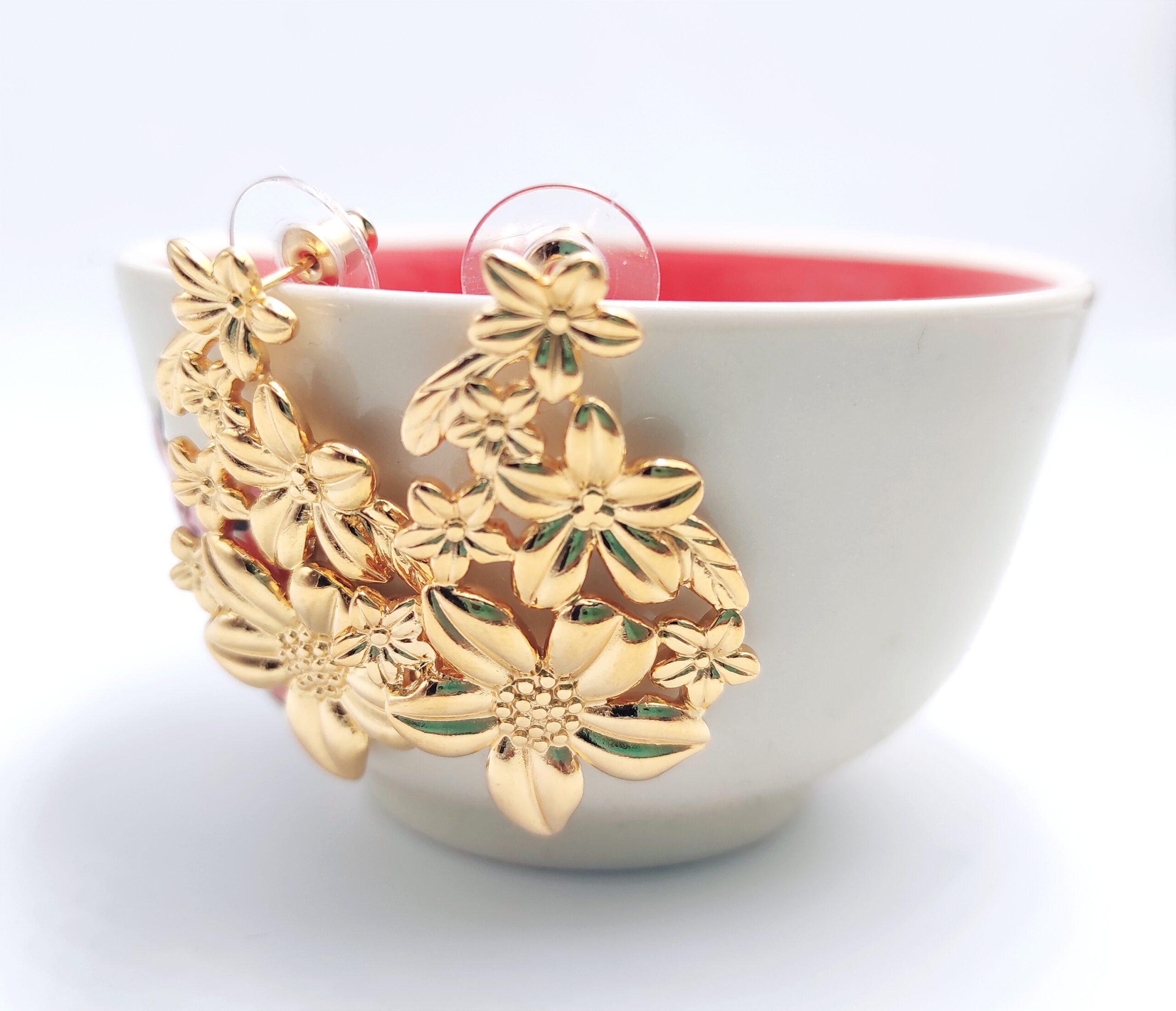 Boucles d’oreilles en acier inoxydable doré avec plusieurs fleurs faisant une forme un peu de losange. Bijoux élégant et distingué de hauteur de 4 cm et jusqu’à 2,6cm de largeur. Boucles de taille moyenne pouvant convenir pour la plupart des morphologies et mettant en valeur vos tenues 😍👌