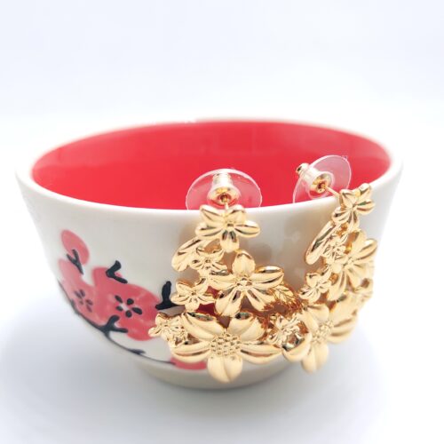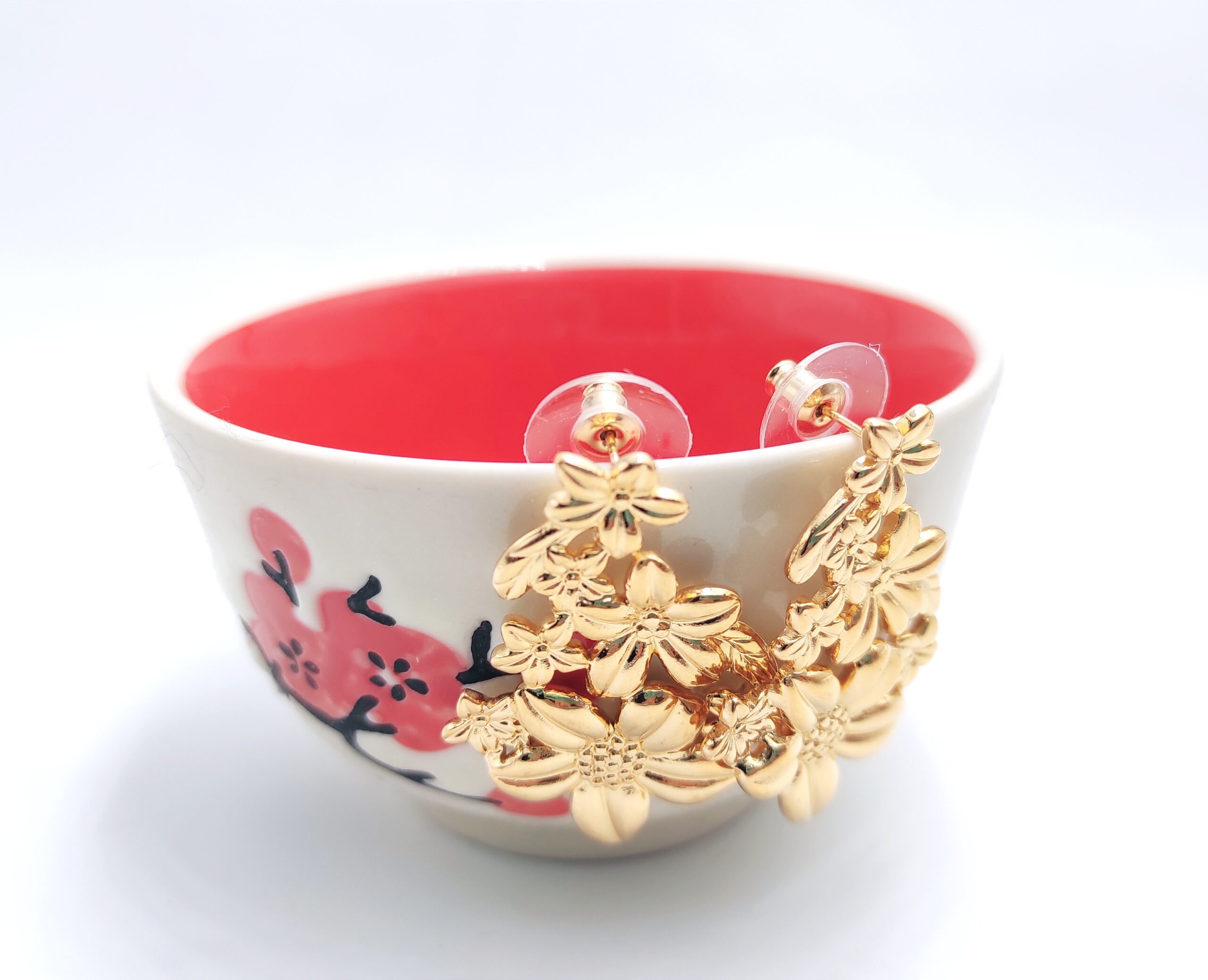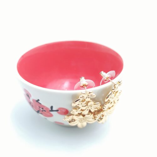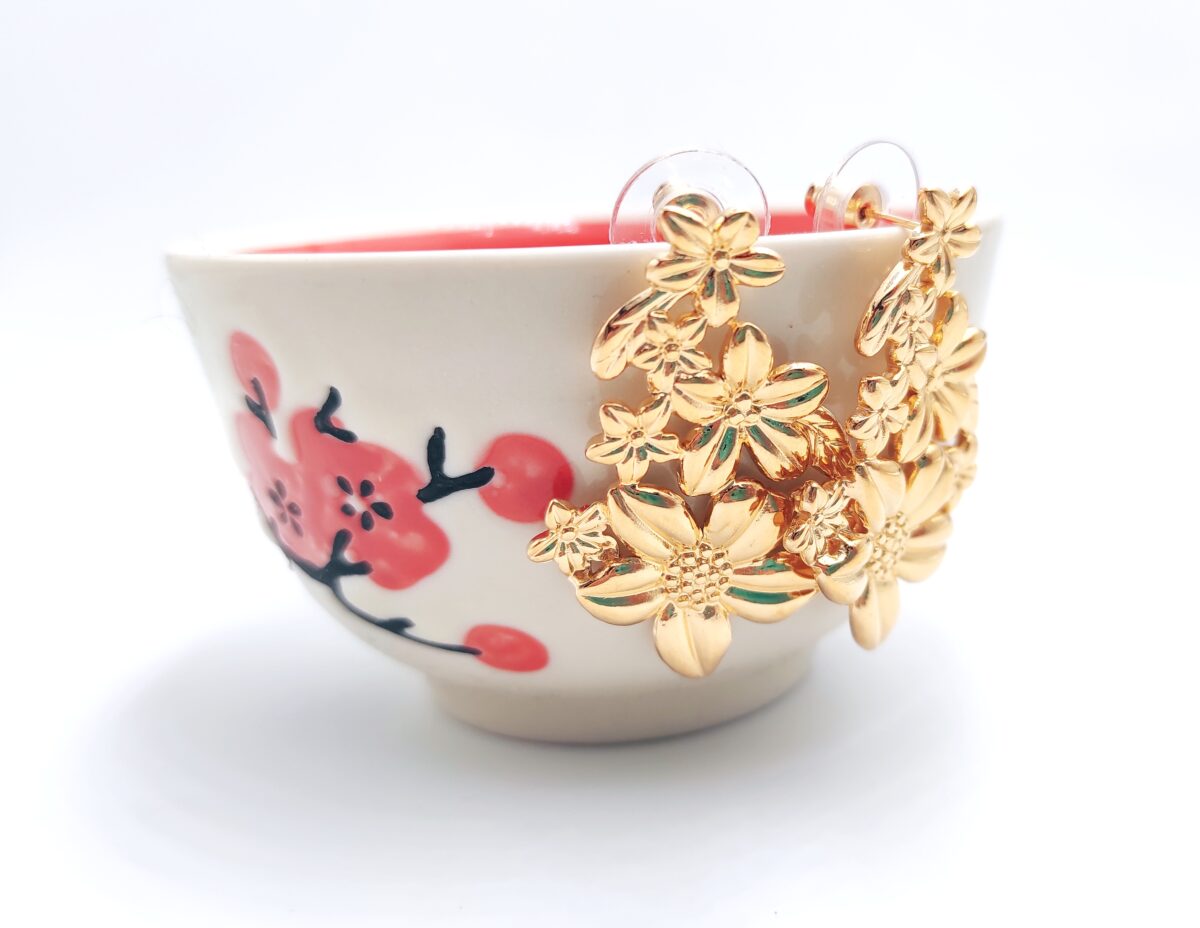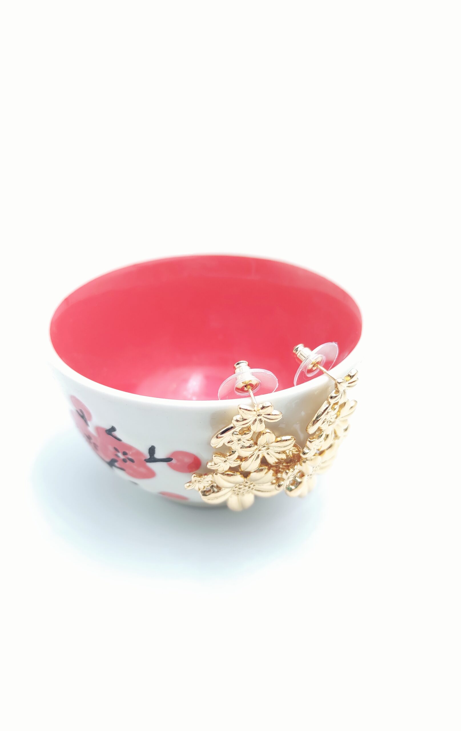 Boucles d’oreilles en acier inoxydable doré avec plusieurs fleurs faisant une forme un peu de losange. Bijoux élégant et distingué de hauteur de 4 cm et jusqu’à 2,6cm de largeur. Boucles de taille moyenne pouvant convenir pour la plupart des morphologies et mettant en valeur vos tenues 😍👌