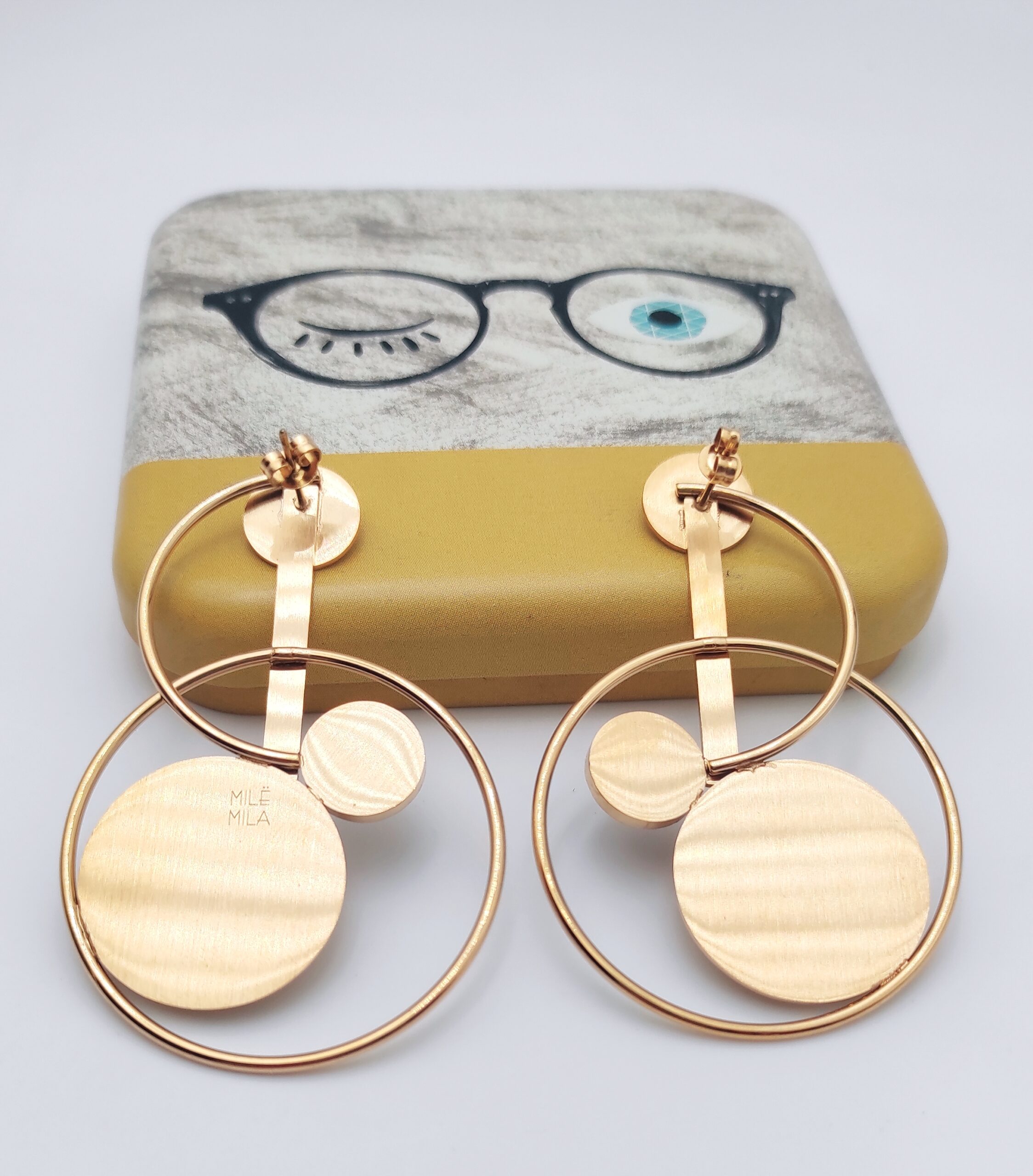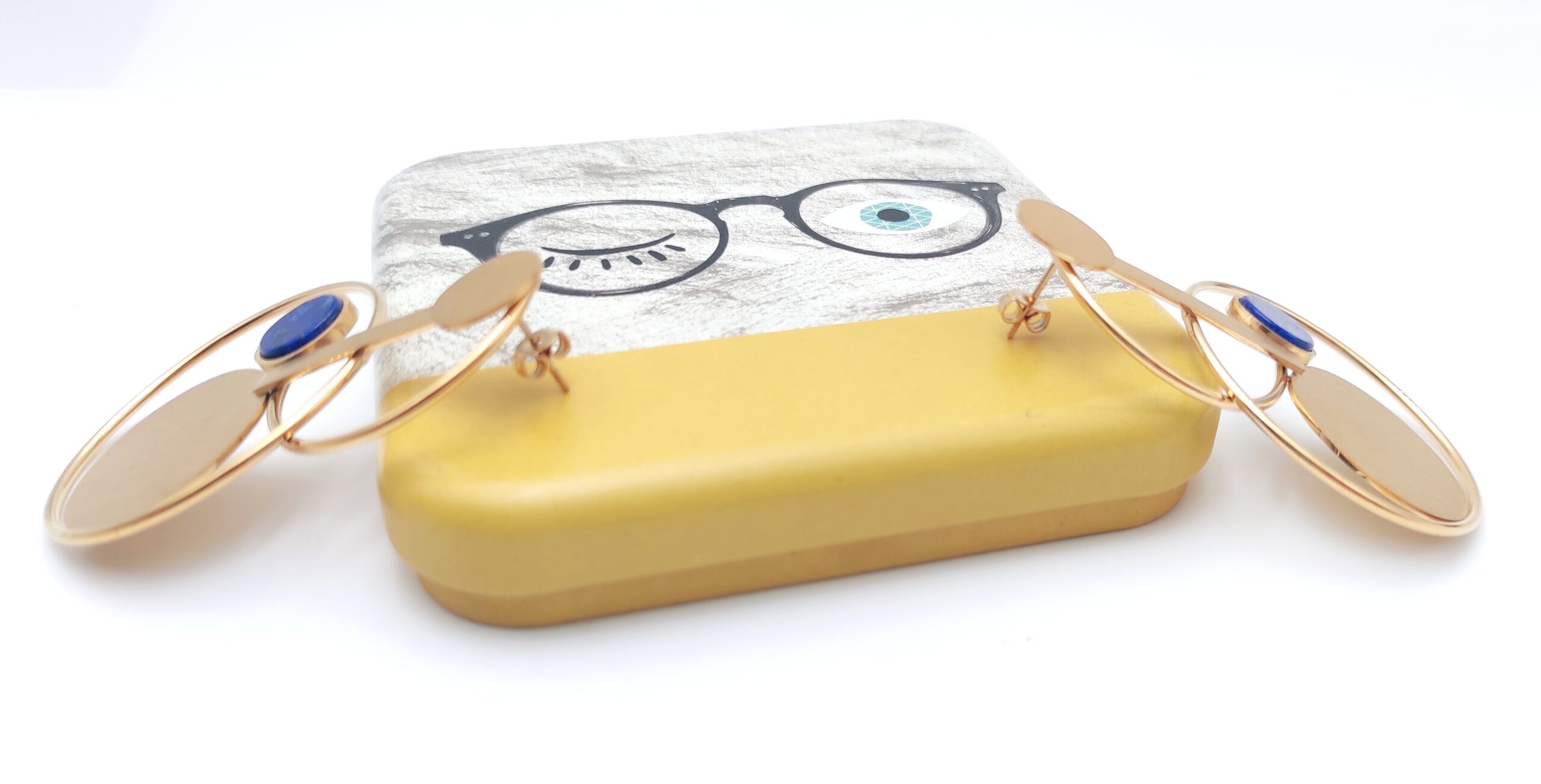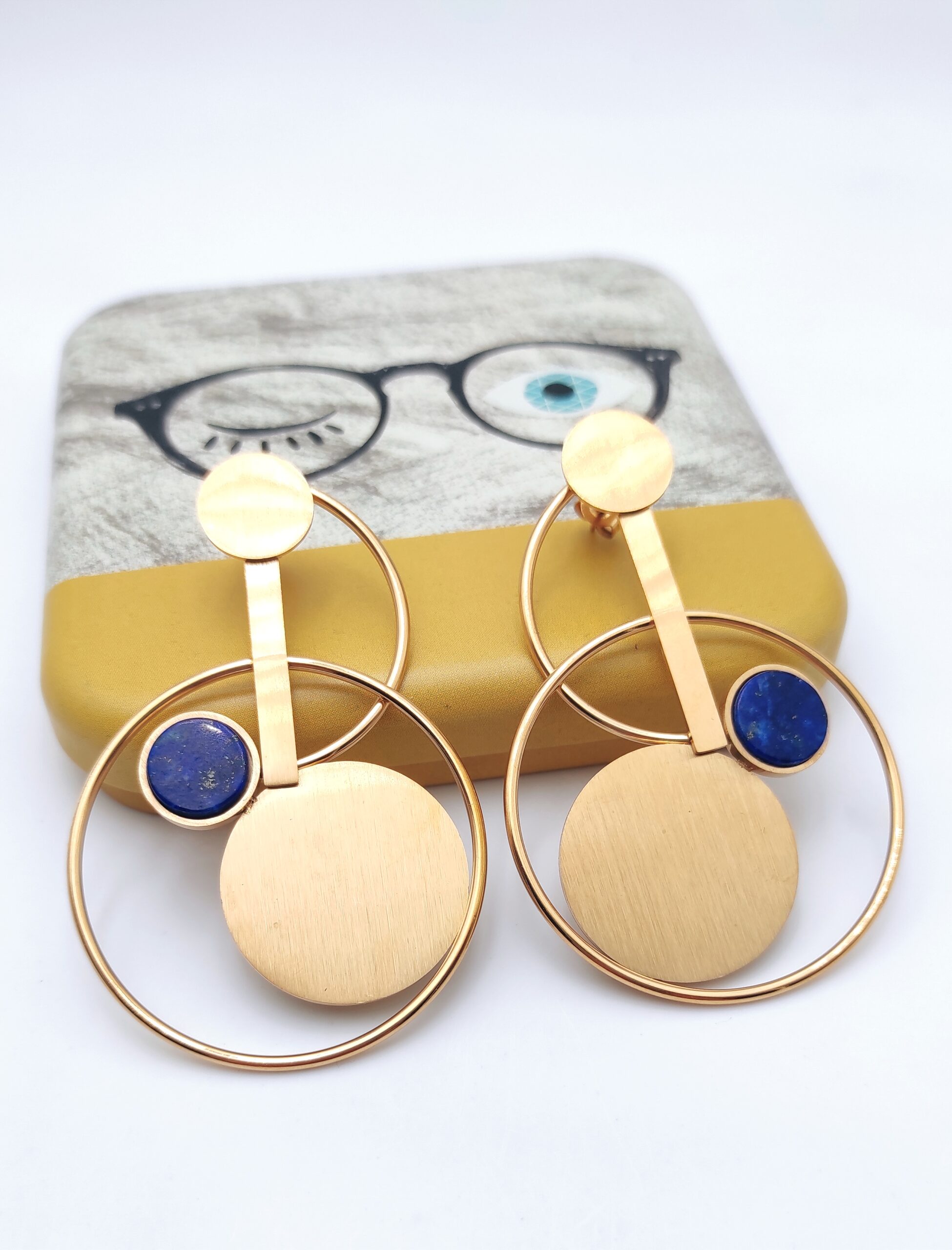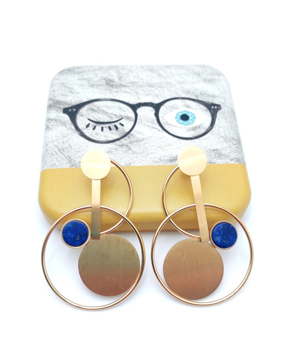 Superbes boucles d’oreilles en acier inoxydable doré de marque Mile Mila avec une pierre ronde Lapis Lazuli de taille 1cm. Les boucles d’oreilles sont de formes géométriques avec plusieurs anneaux fixes. Elles mesurent 6,2cm de hauteur jusqu’à 4cm de largeur. Elles se ferment avec un fermoir. Ajourées, elles vous mettront en valeur sans alourdir votre visage 👌👍