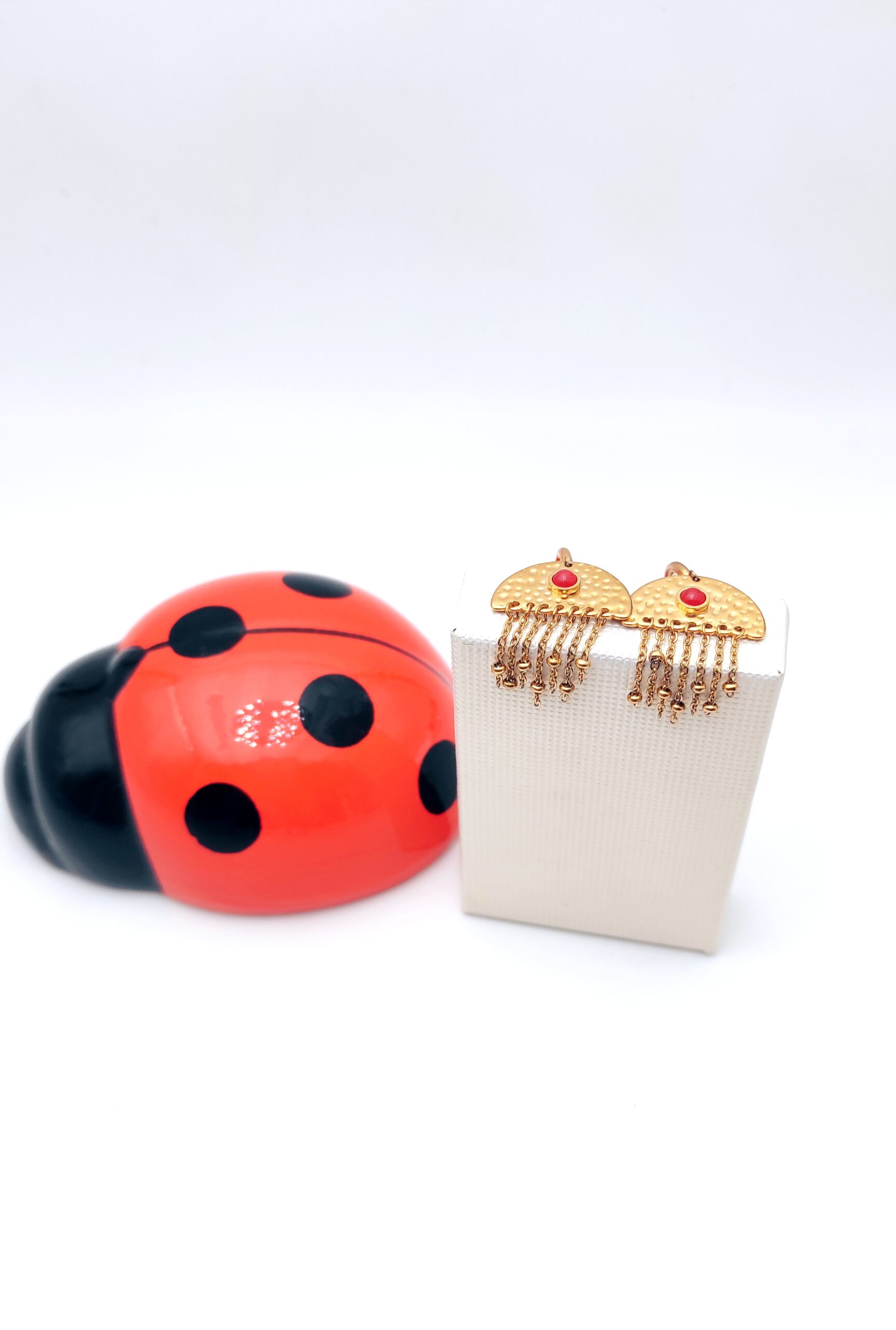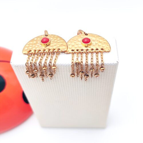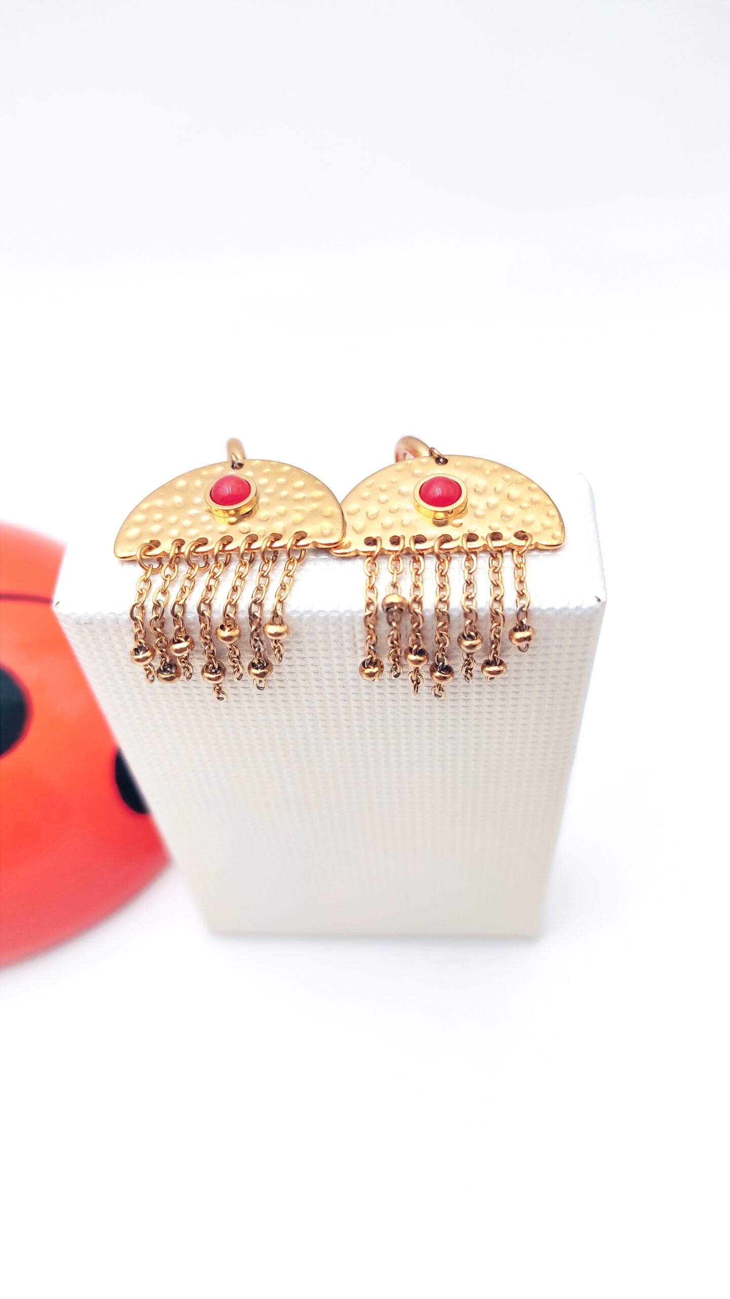 Boucles d’oreilles de forme géométrique en acier inoxydable doré avec une pierre naturelle rouge (cornaline) et des petites chaînettes pour ajouter de la légèreté au bijoux.