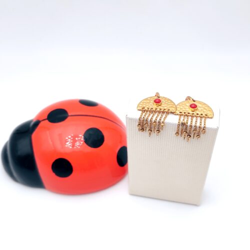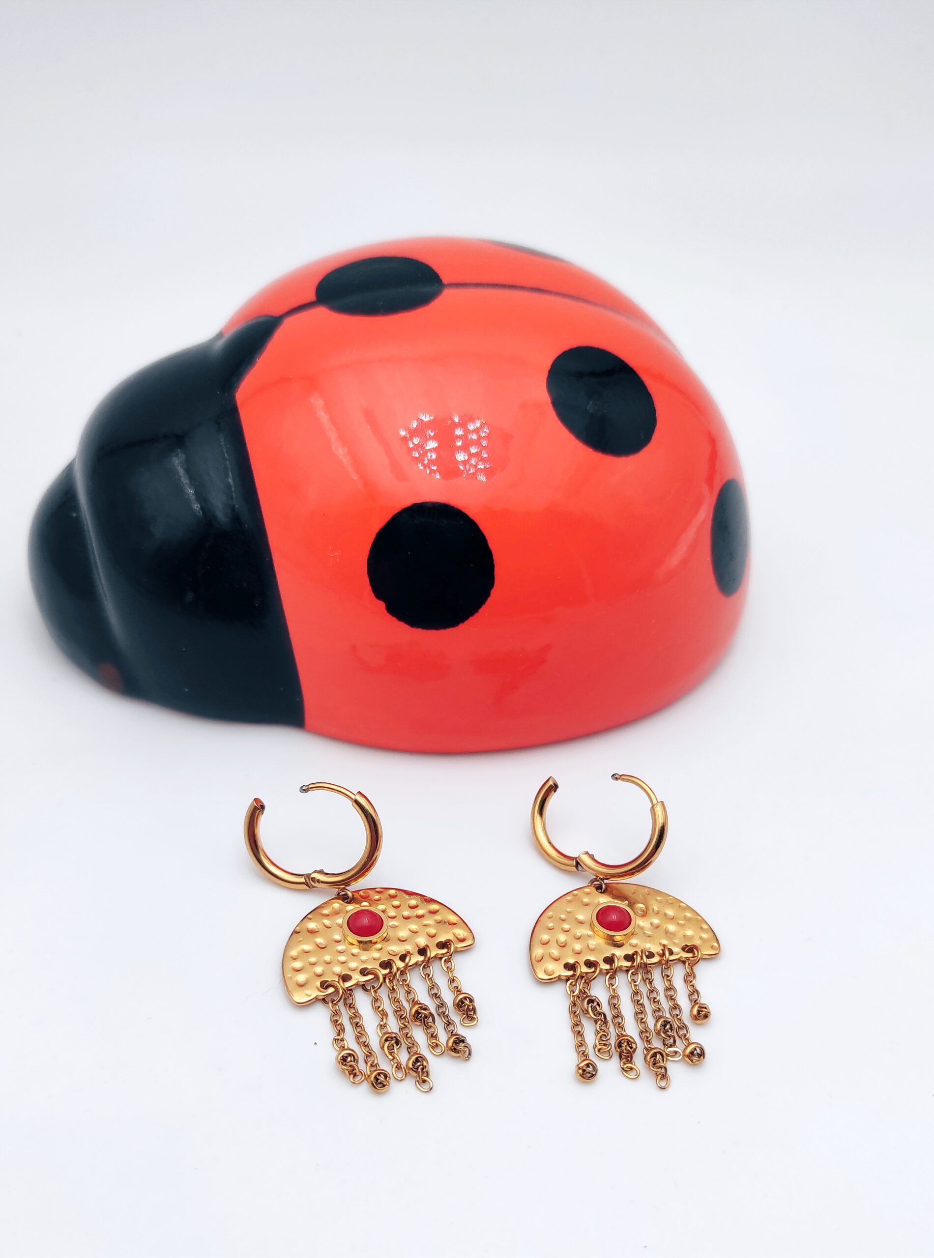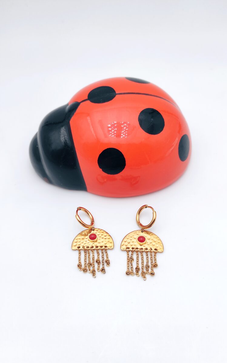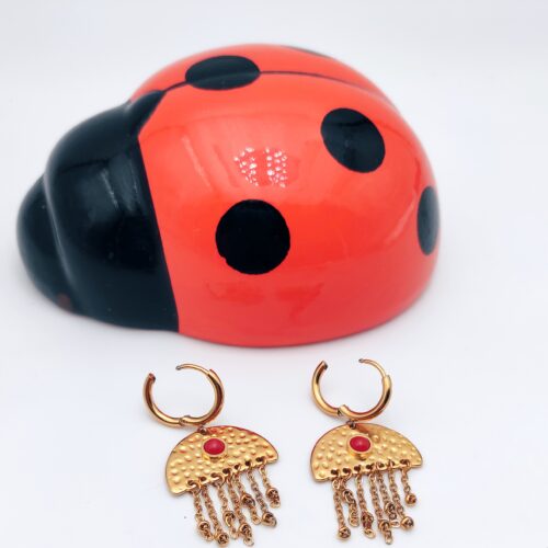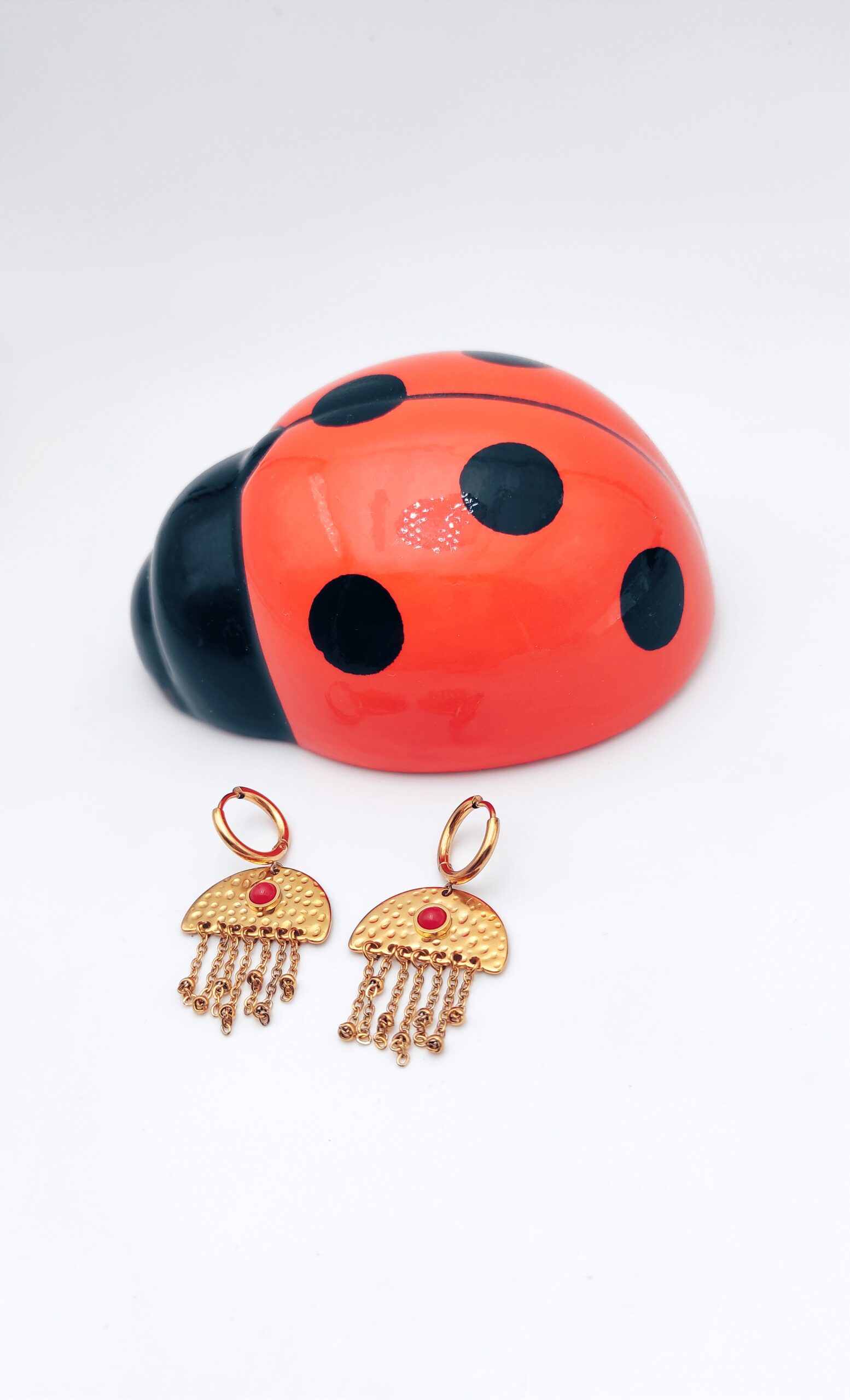 Boucles d’oreilles de forme géométrique en acier inoxydable doré avec une pierre naturelle rouge (cornaline) et des petites chaînettes pour ajouter de la légèreté au bijoux.