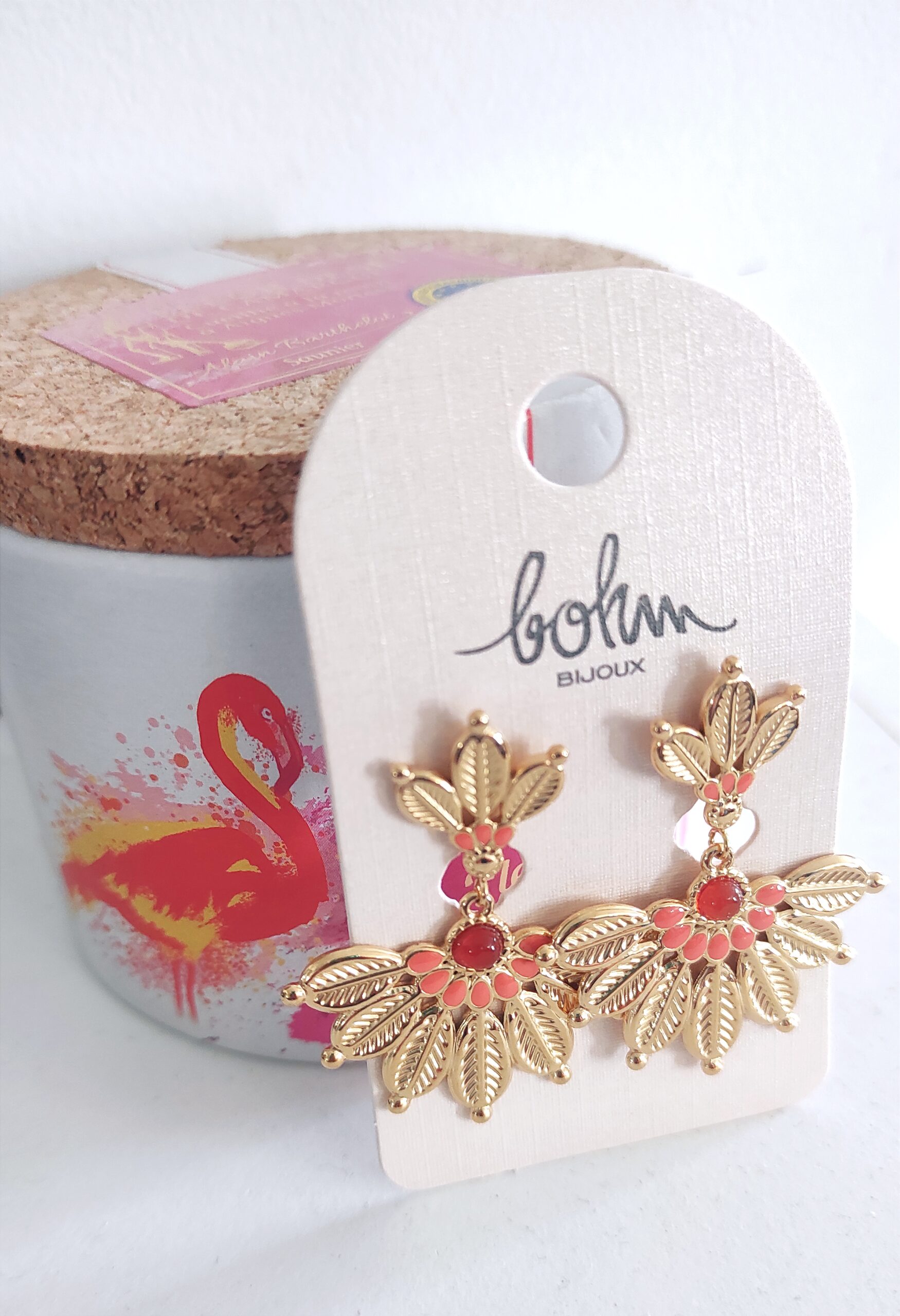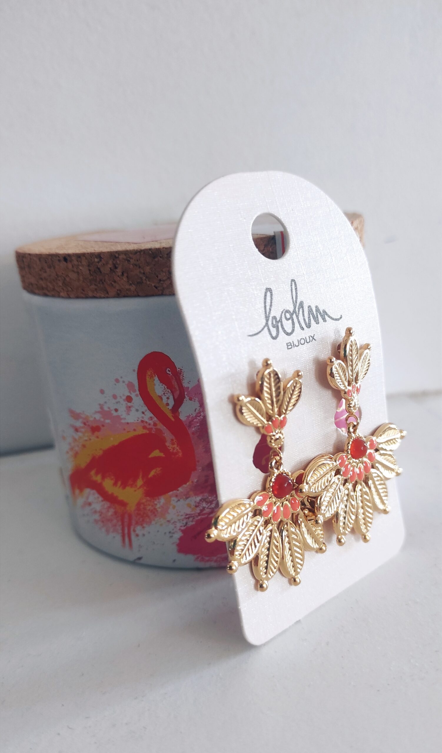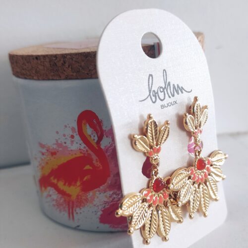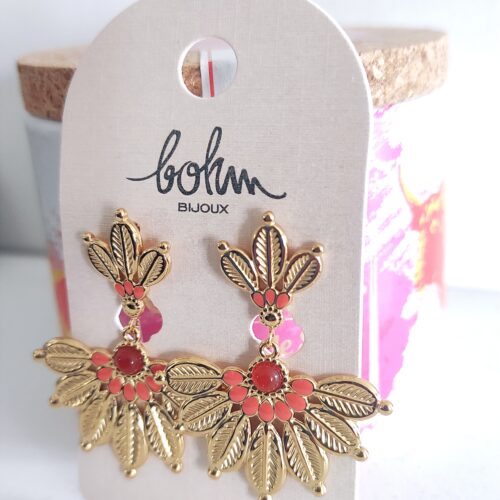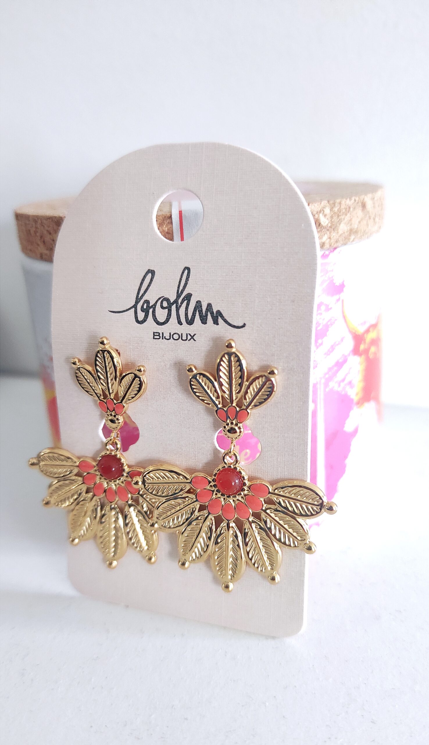Boucles d’oreilles de marque Bohm en acier inoxydable doré en forme de feuilles déployées en éventail avec une petite pierre naturelle cornaline et émail de couleur corail. Les boucles mesurent 4,2cm de hauteur jusqu’à 3,4cm de largeur. Bijoux distingué, il égayera votre visage et vos tenues avec élégance et singularité 👌