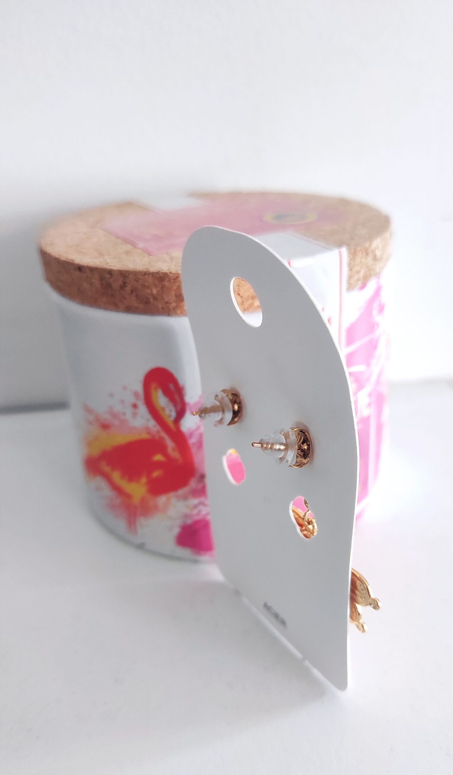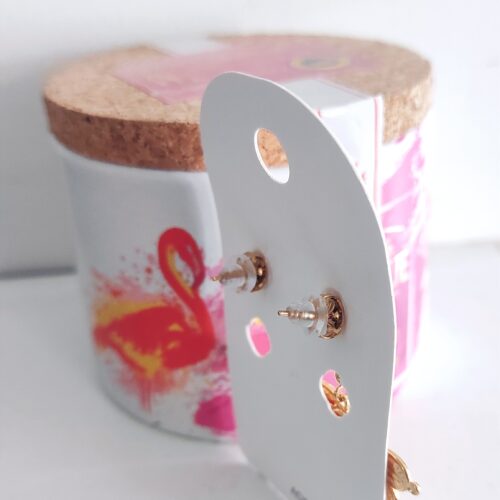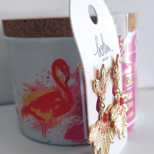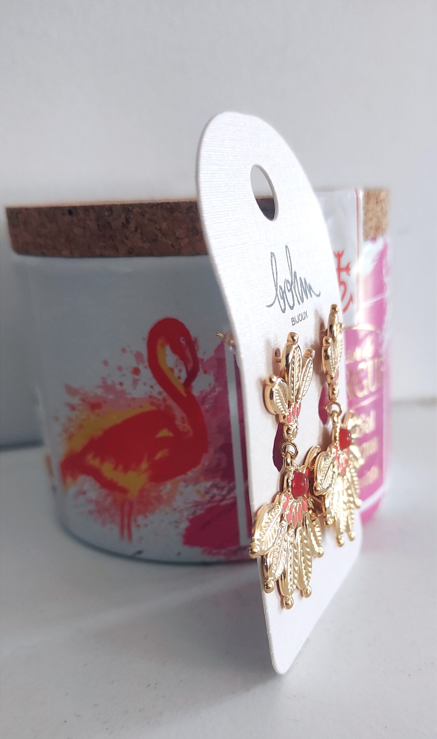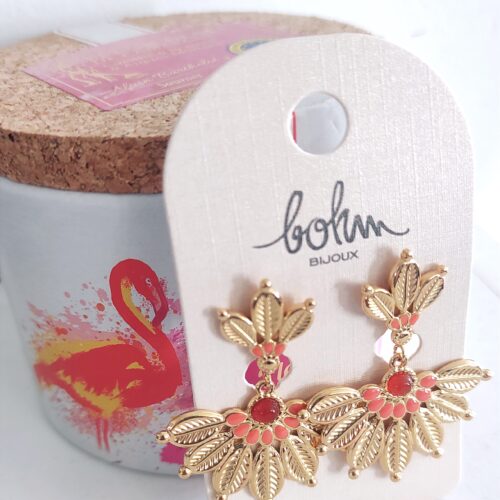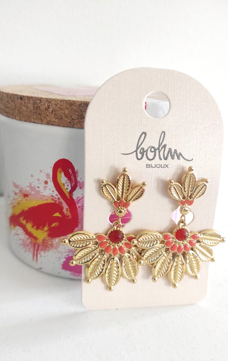 Boucles d’oreilles de marque Bohm en acier inoxydable doré en forme de feuilles déployées en éventail avec une petite pierre naturelle cornaline et émail de couleur corail. Les boucles mesurent 4,2cm de hauteur jusqu’à 3,4cm de largeur. Bijoux distingué, il égayera votre visage et vos tenues avec élégance et singularité 👌
