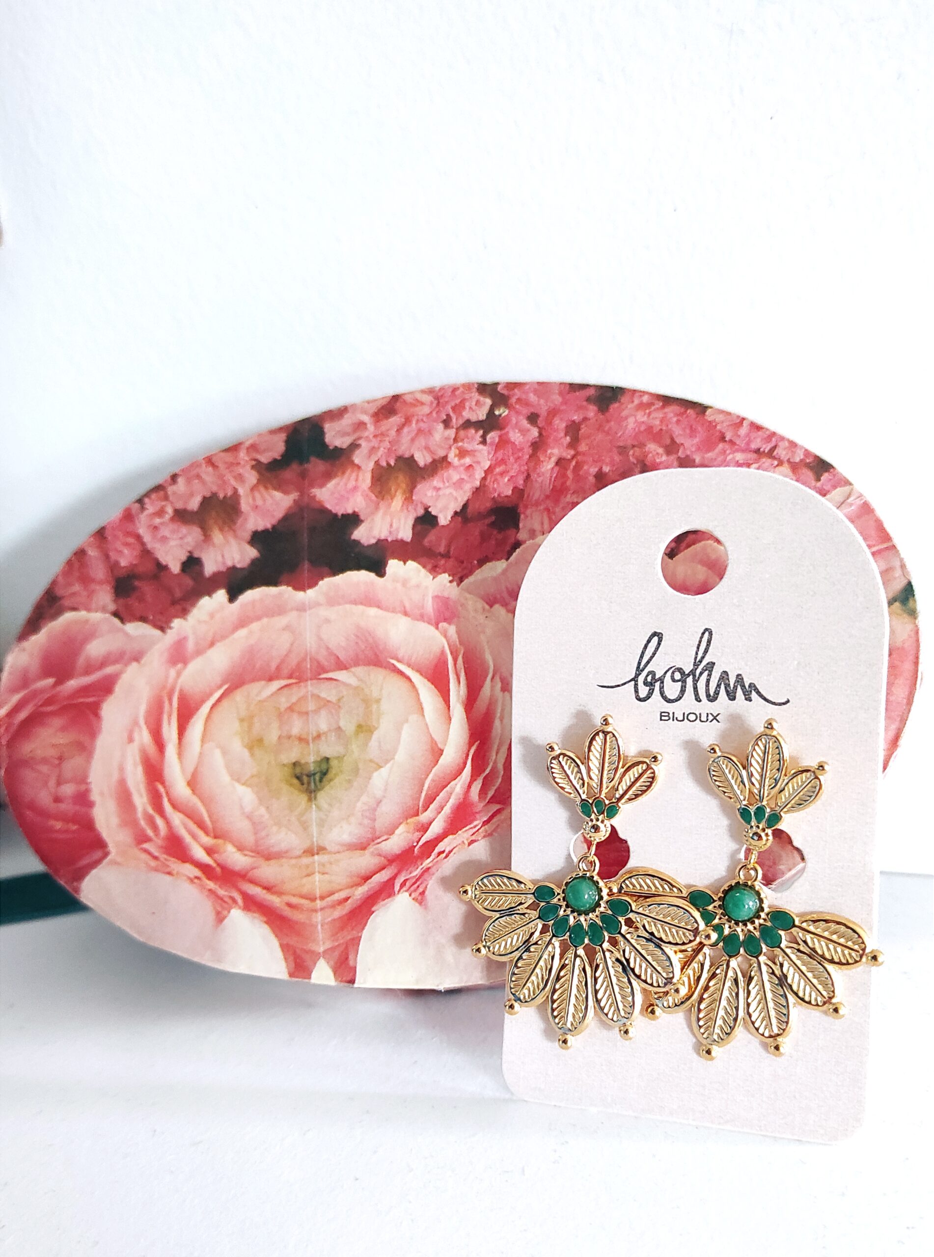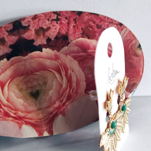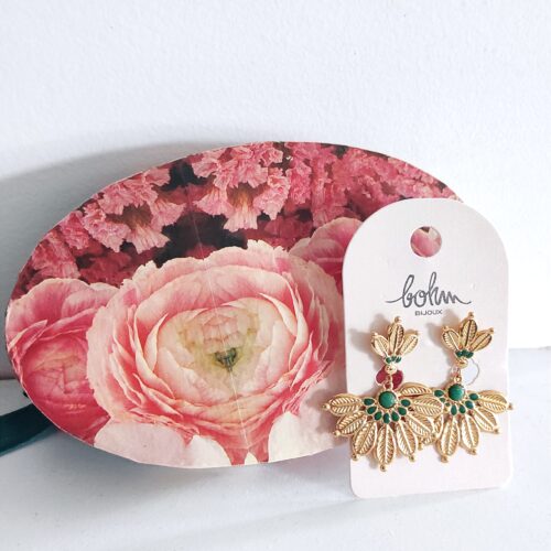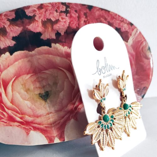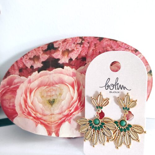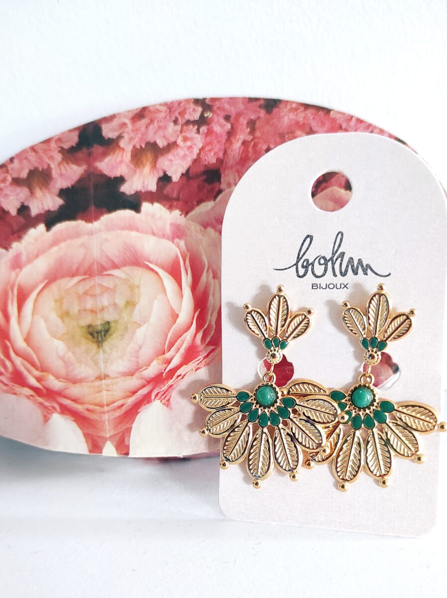Boucles d’oreilles de marque Bohm en acier inoxydable doré en forme de feuilles déployées en éventail avec une petite pierre naturelle jaspe vert et émail de couleur vert. Les boucles mesurent 4,2cm de hauteur jusqu’à 3,4cm de largeur. Bijoux distingué, il égayera votre visage et vos tenues avec élégance et singularité 👌