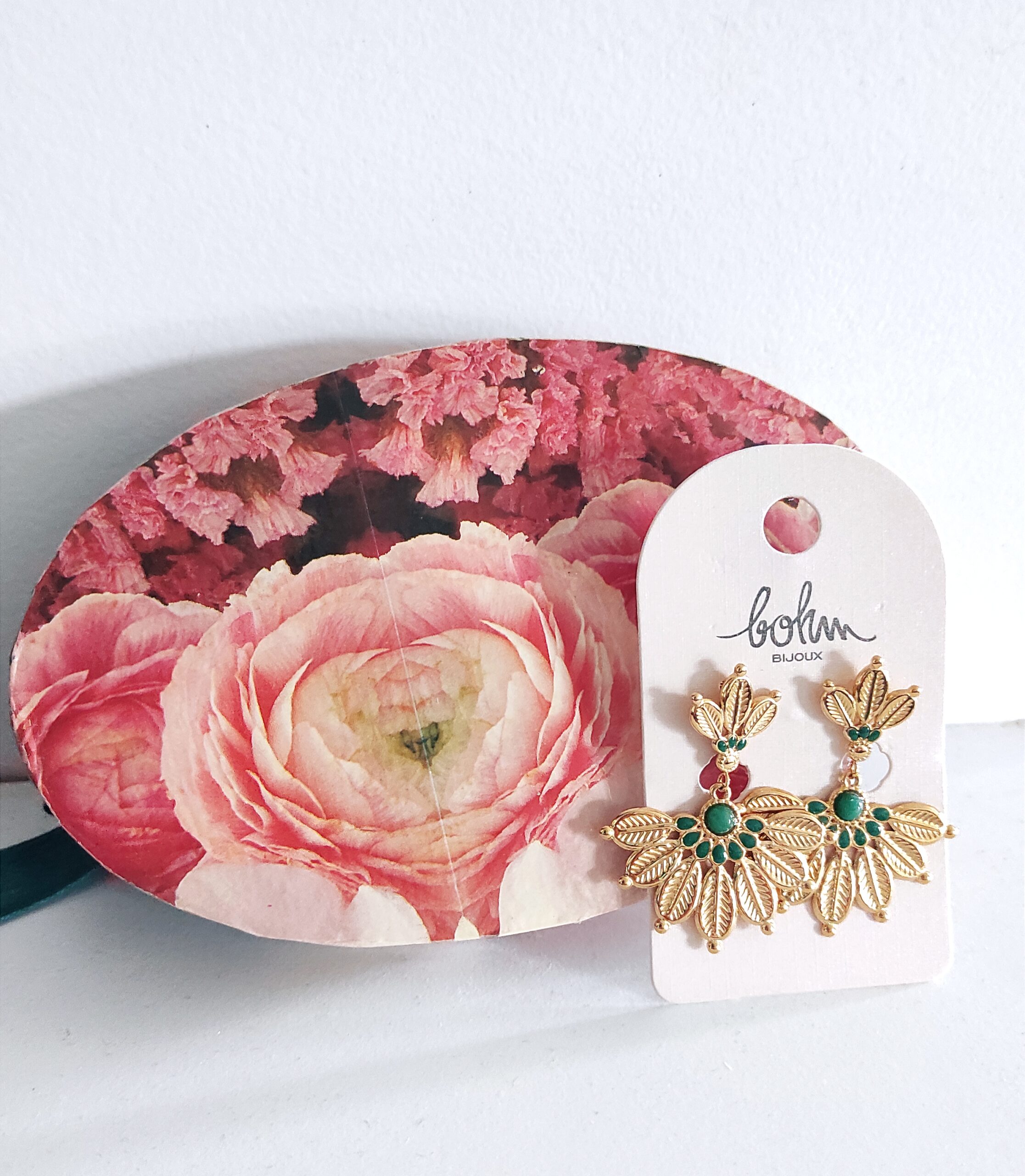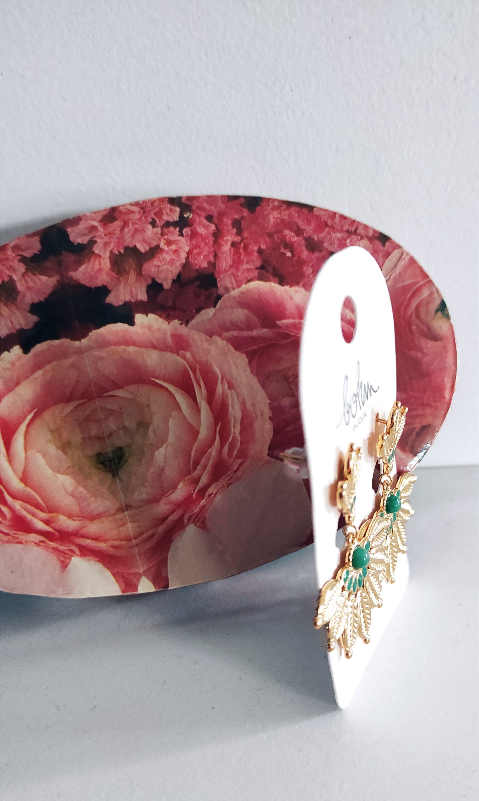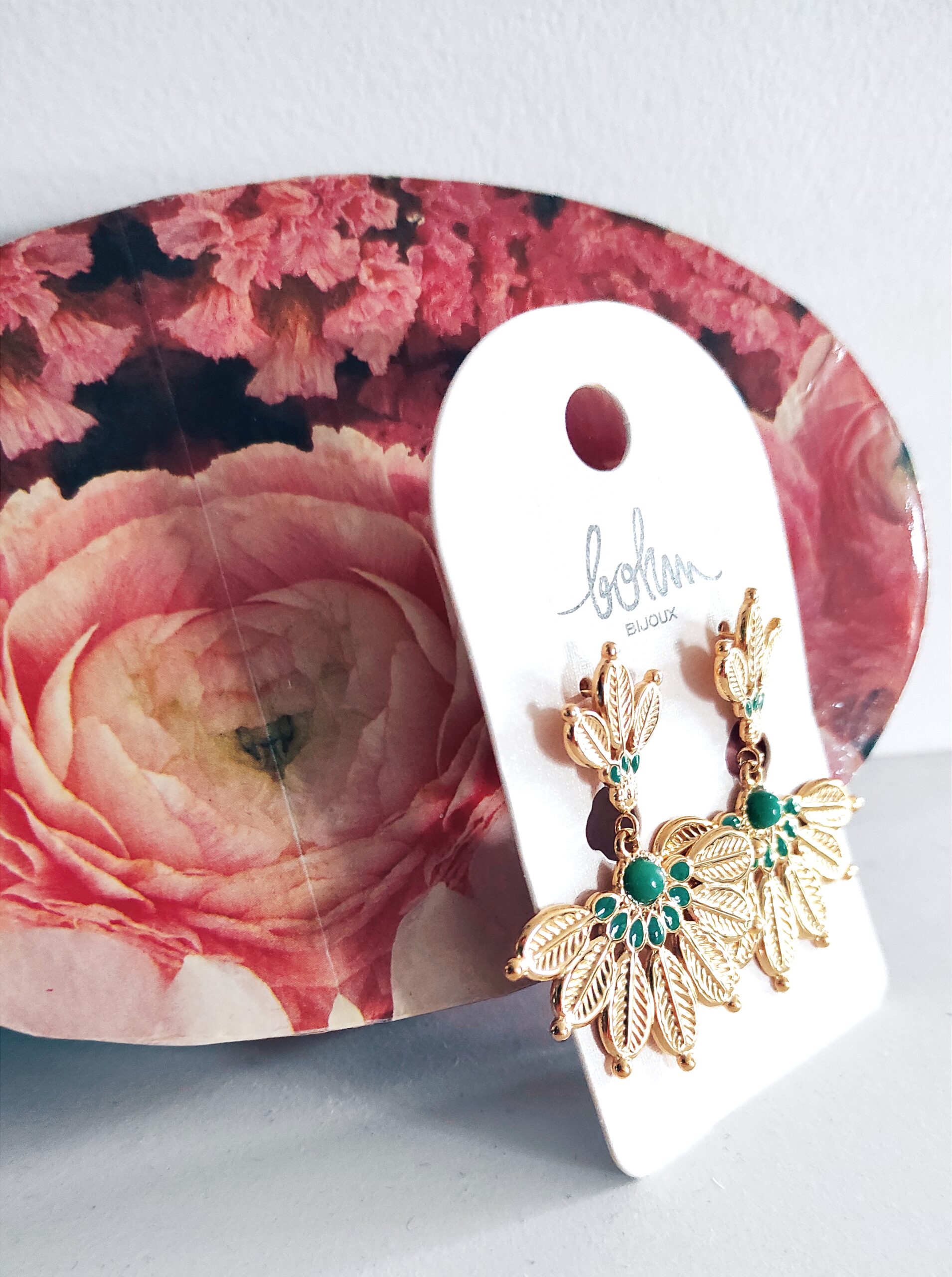 Boucles d’oreilles de marque Bohm en acier inoxydable doré en forme de feuilles déployées en éventail avec une petite pierre naturelle jaspe vert et émail de couleur vert. Les boucles mesurent 4,2cm de hauteur jusqu’à 3,4cm de largeur. Bijoux distingué, il égayera votre visage et vos tenues avec élégance et singularité 👌