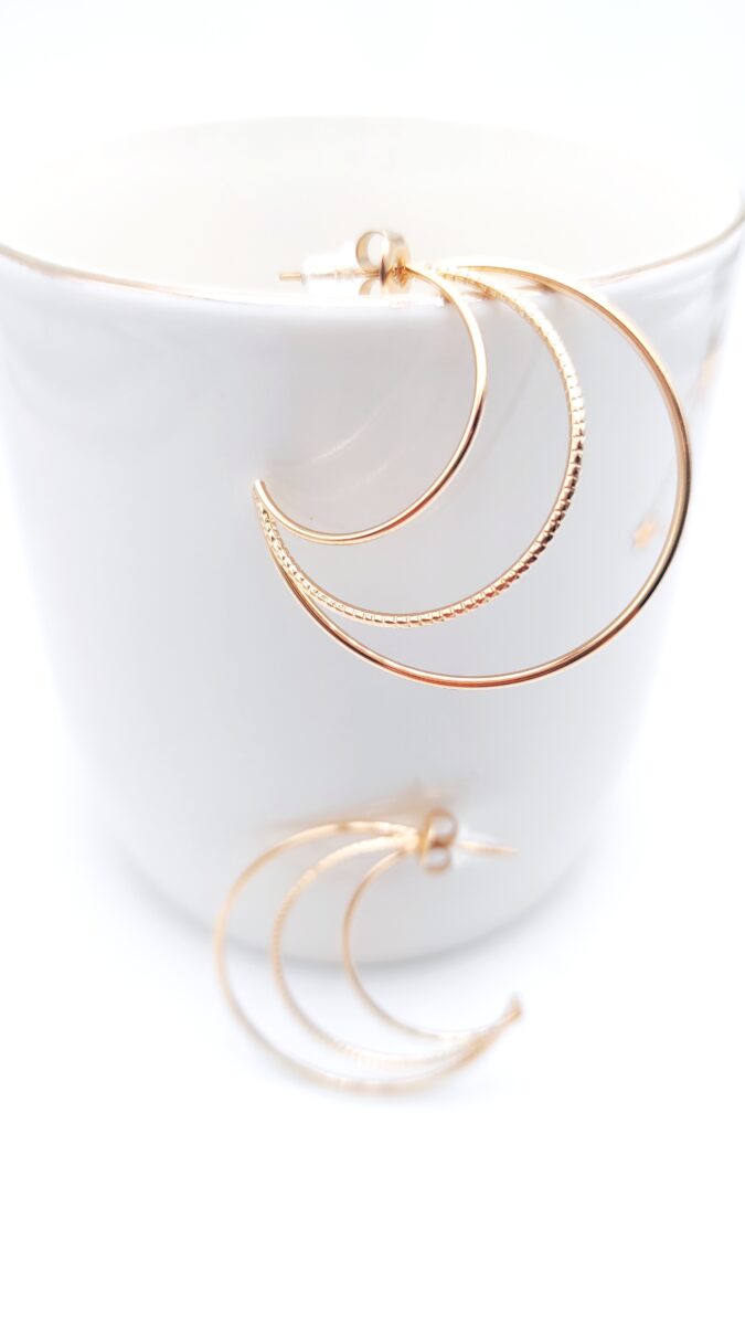 Boucles en forme de créoles avec plusieurs anneaux, deux lisses et un travaillé en pointillé au centre. Bijoux tendance, raffiné et classe 👌😍