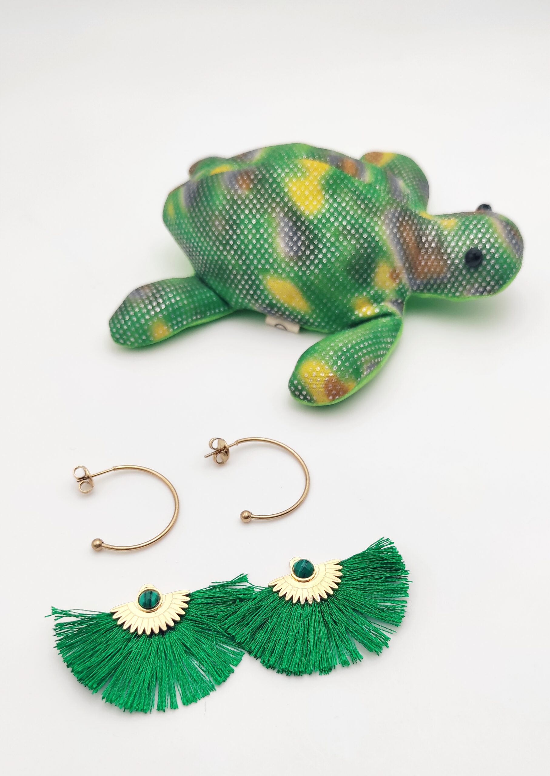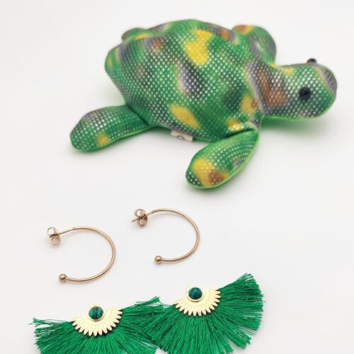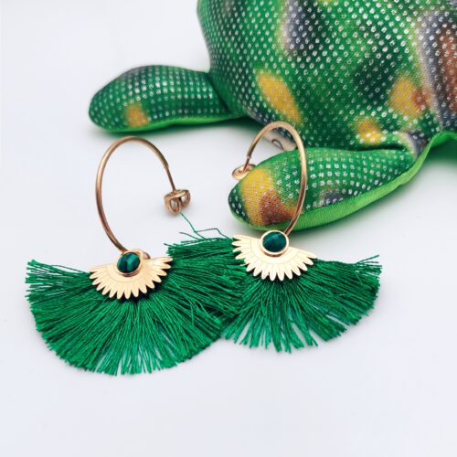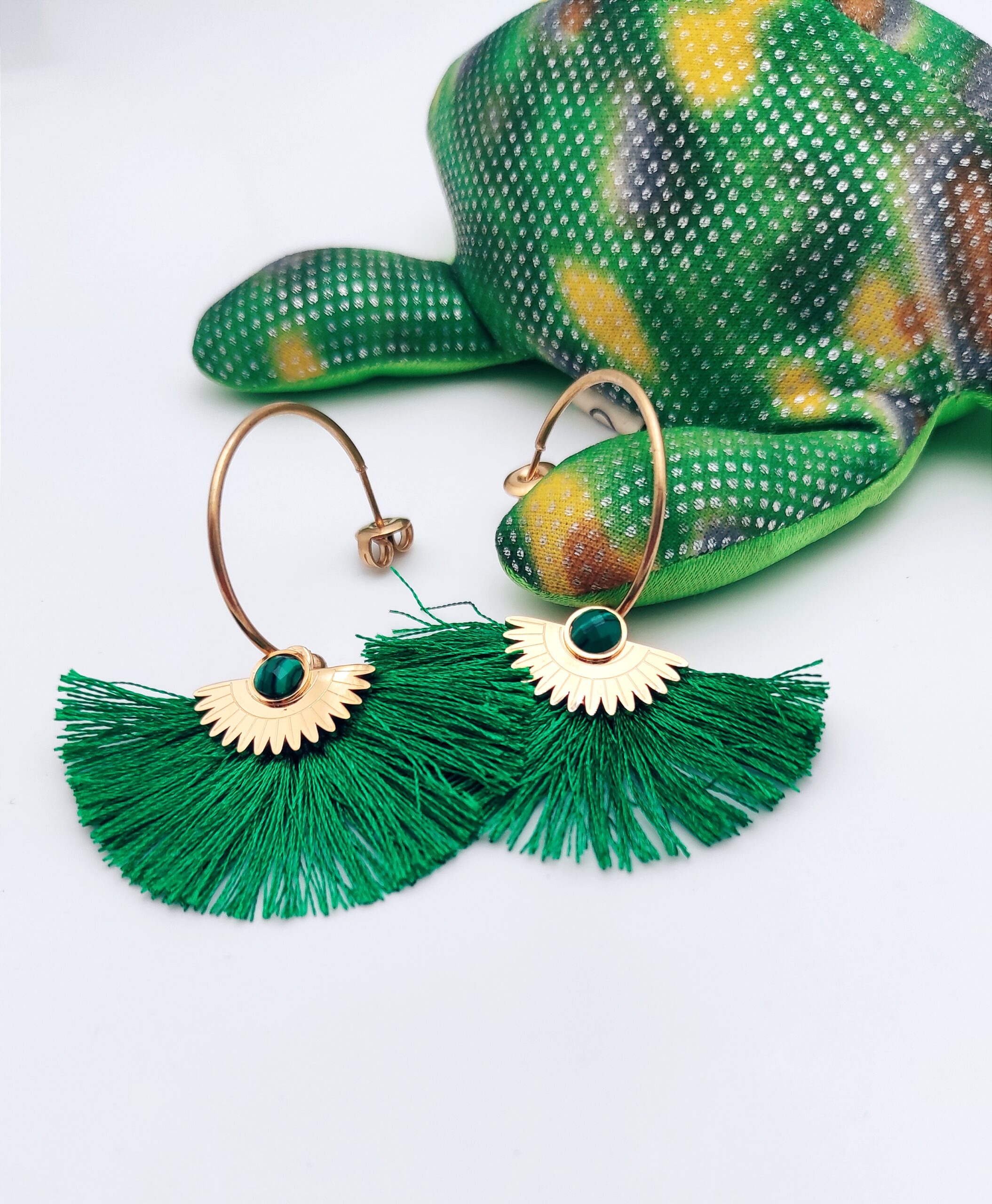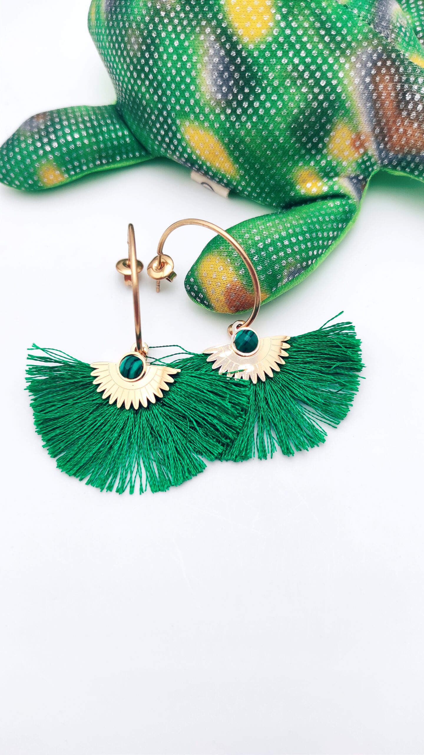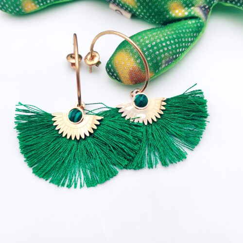 Boucles avec une pierre malachite de couleur vert. La malachite a de nombreuses vertus telles que l’apaisement, la confiance en soi, la protection et la force.