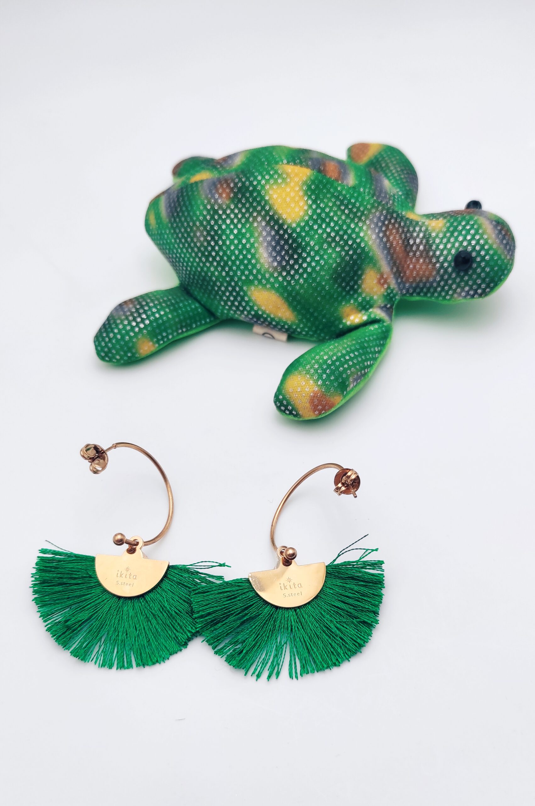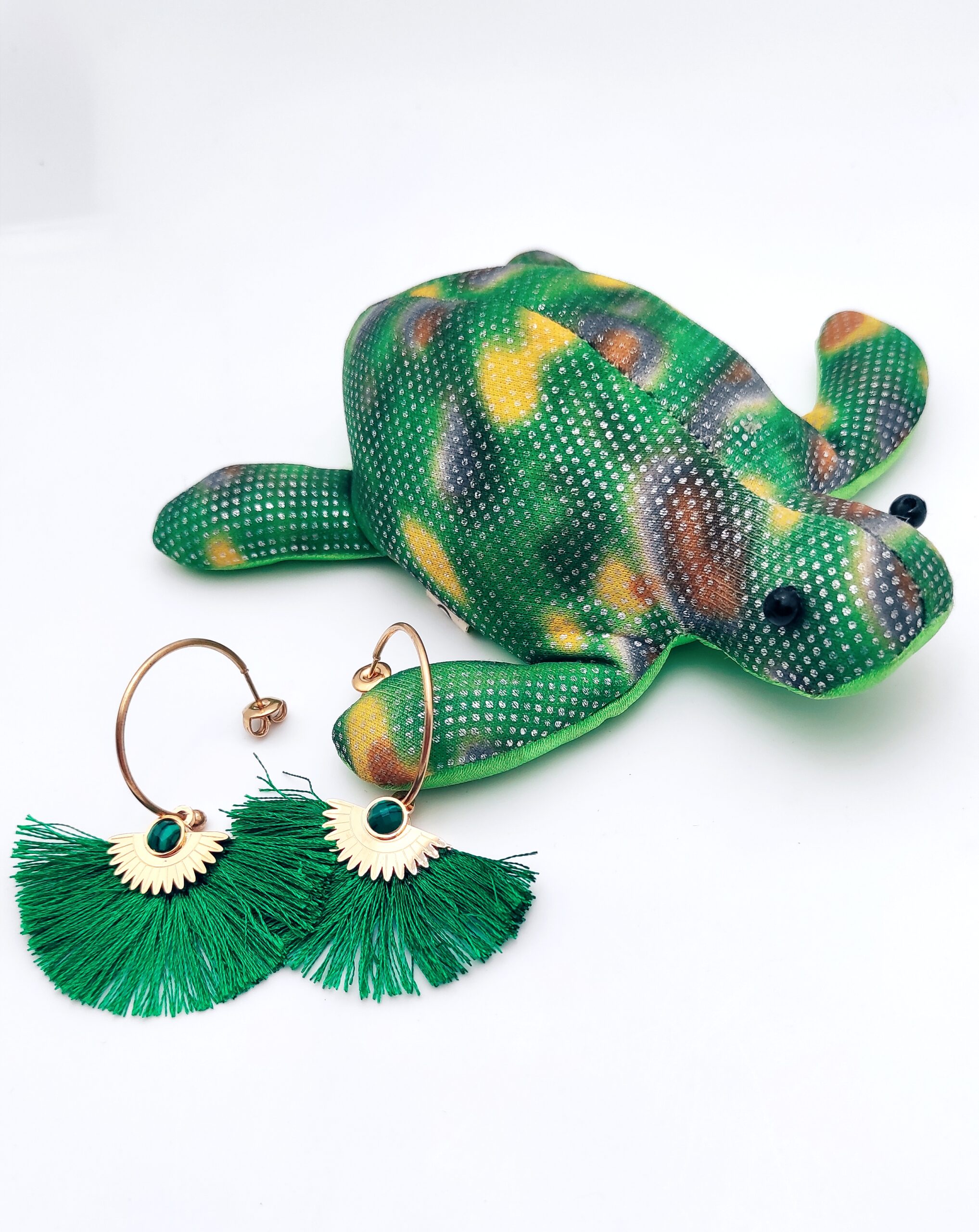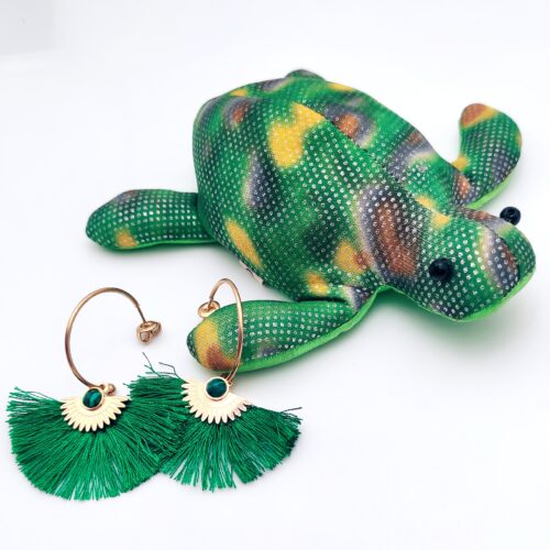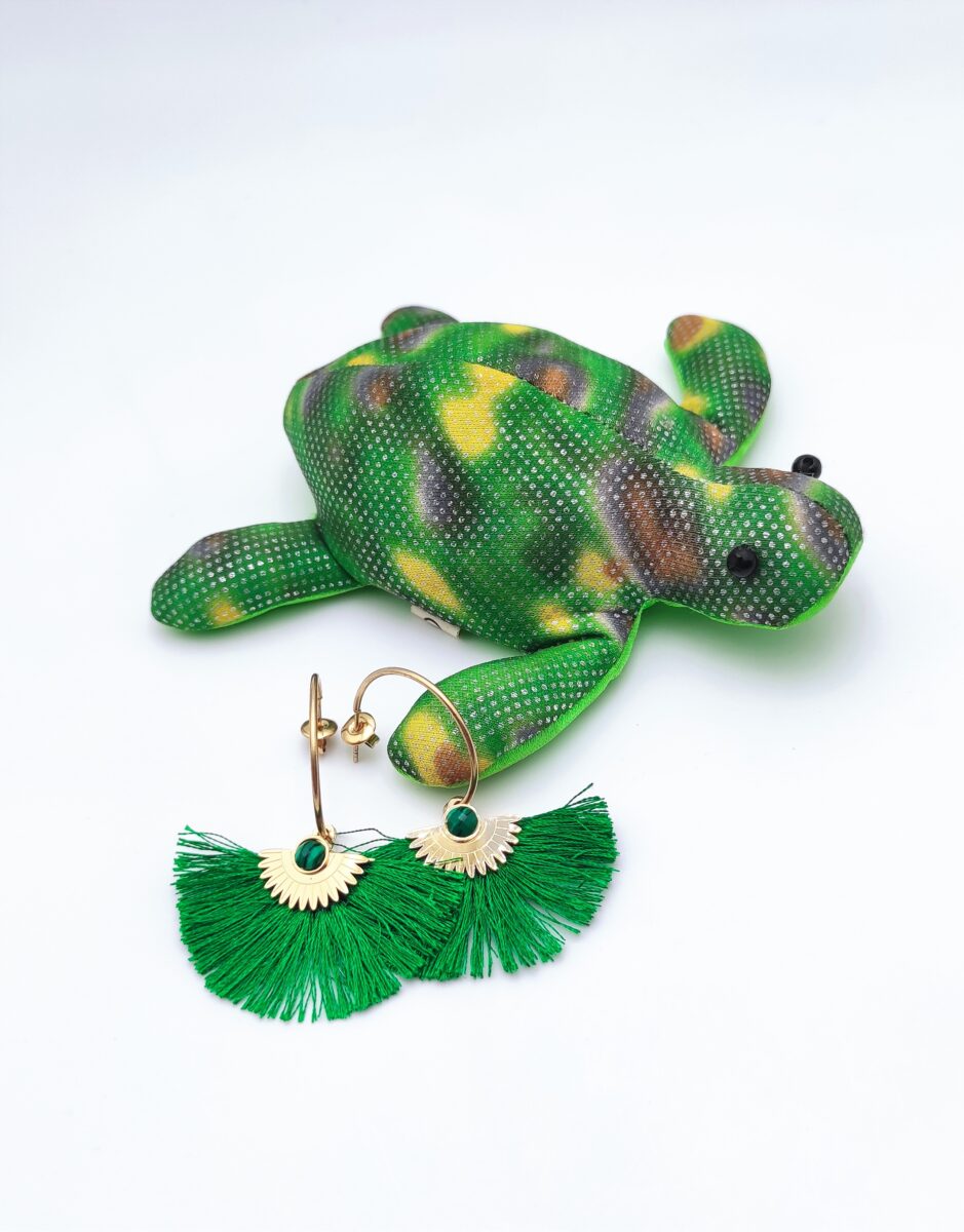 Boucles avec une pierre malachite de couleur vert. La malachite a de nombreuses vertus telles que l’apaisement, la confiance en soi, la protection et la force.
