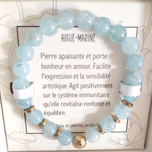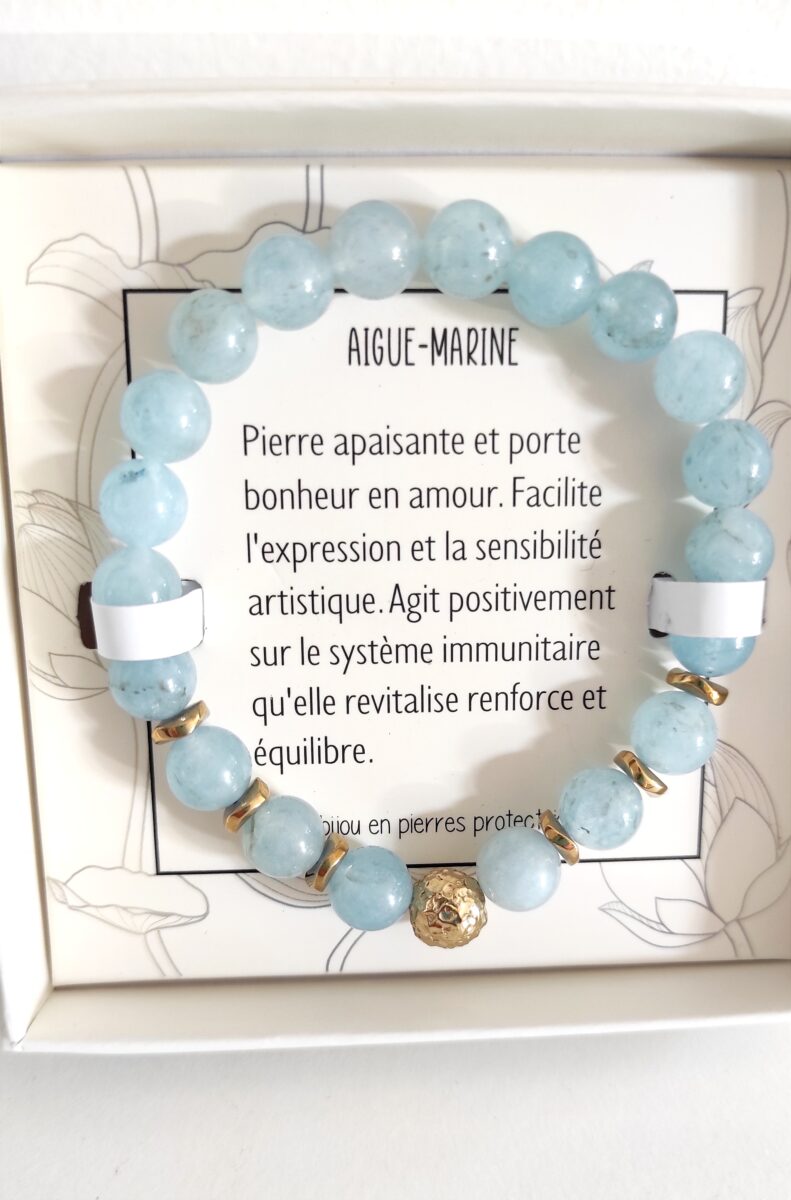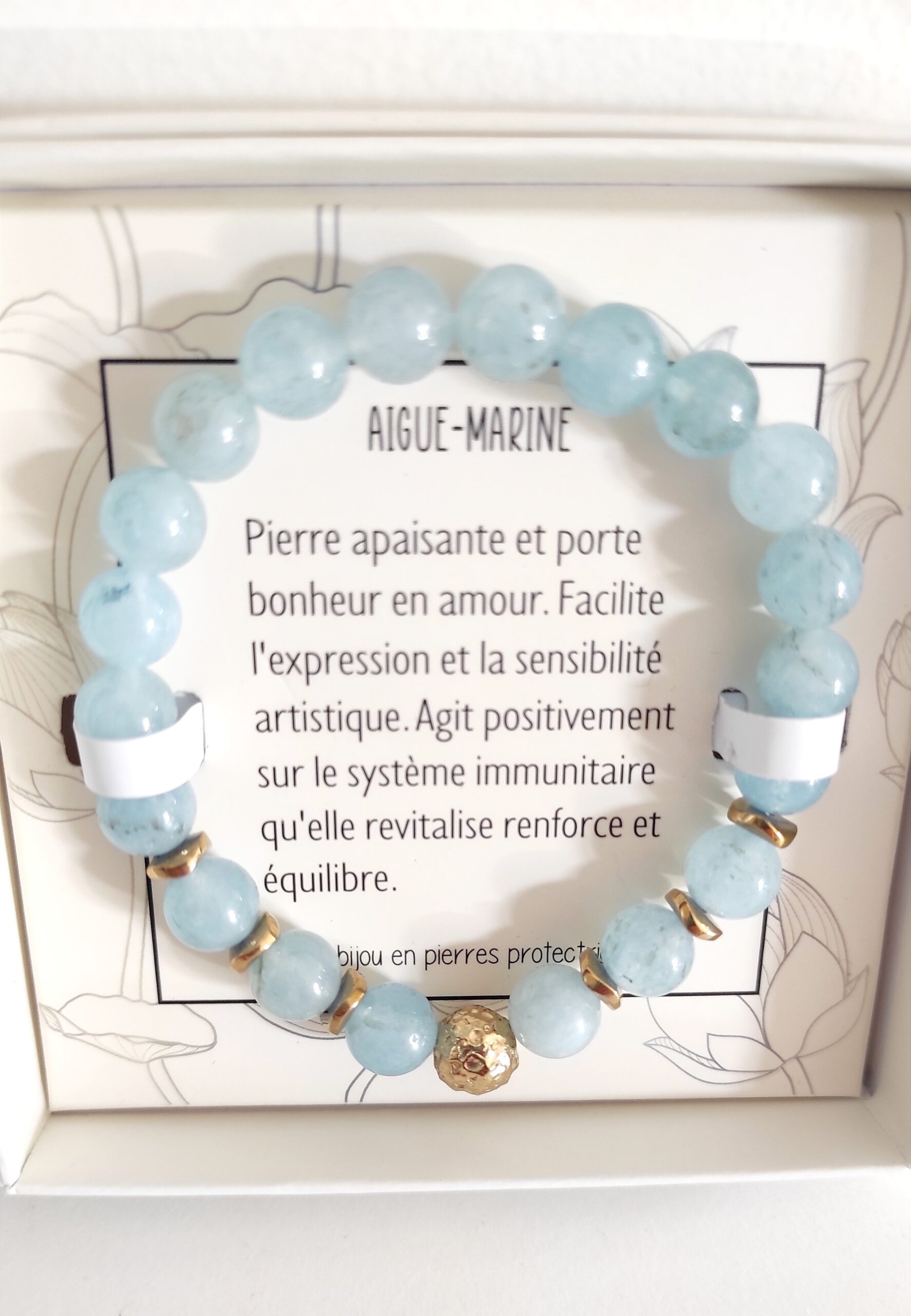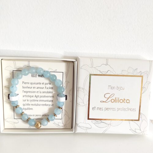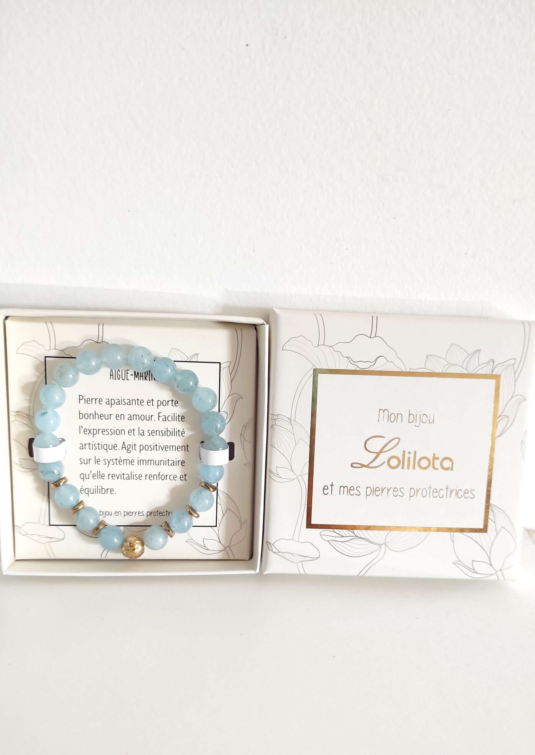 Bracelet élastique de perles en pierre naturelle Aigue Marine de marque Lolilota. Bijoux dans son coffret avec la signification de la pierre à l’intérieur de la boîte, cadeau parfait pour être offert 🎁 Les parties métalliques sont en acier inoxydable doré, la couleur ne changera pas 👍  Le diamètre du bracelet fait 5cm environ, la taille convient à la plupart des tailles de poignets moyens 👌 Bijoux tendance et parfait pour être porté au quotidien 😍