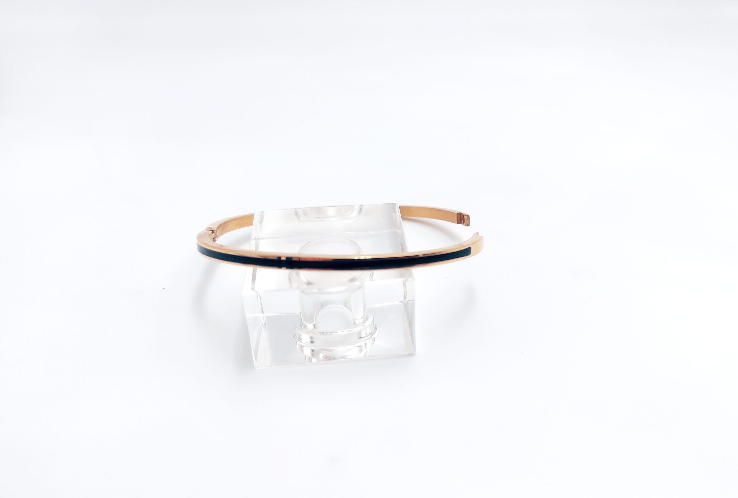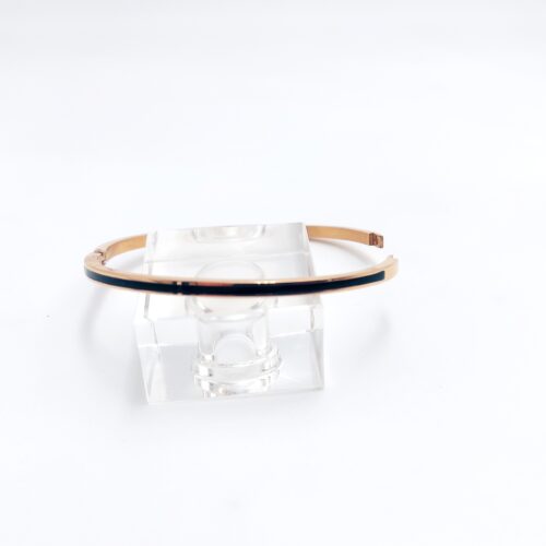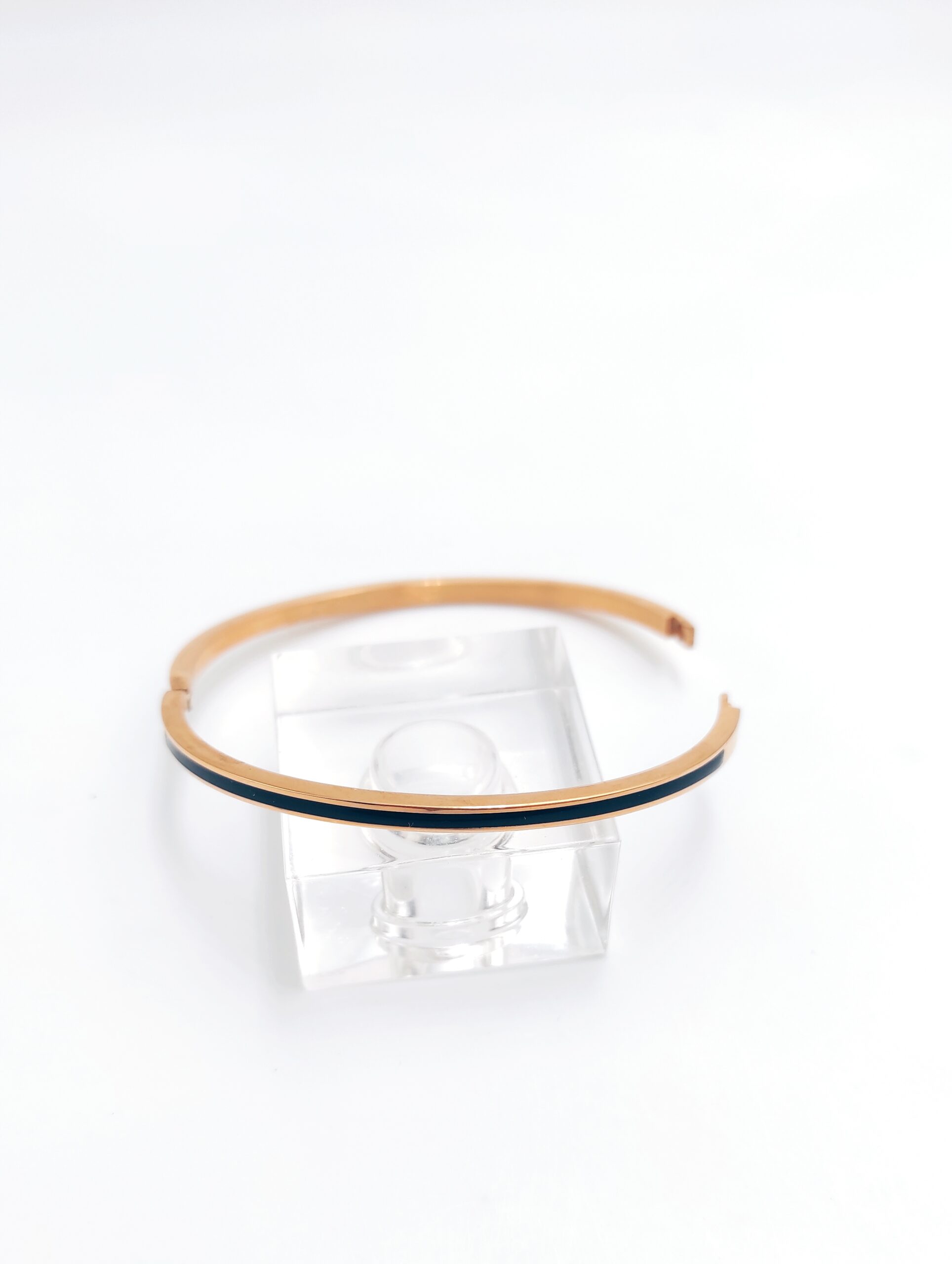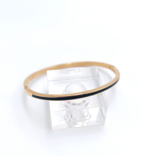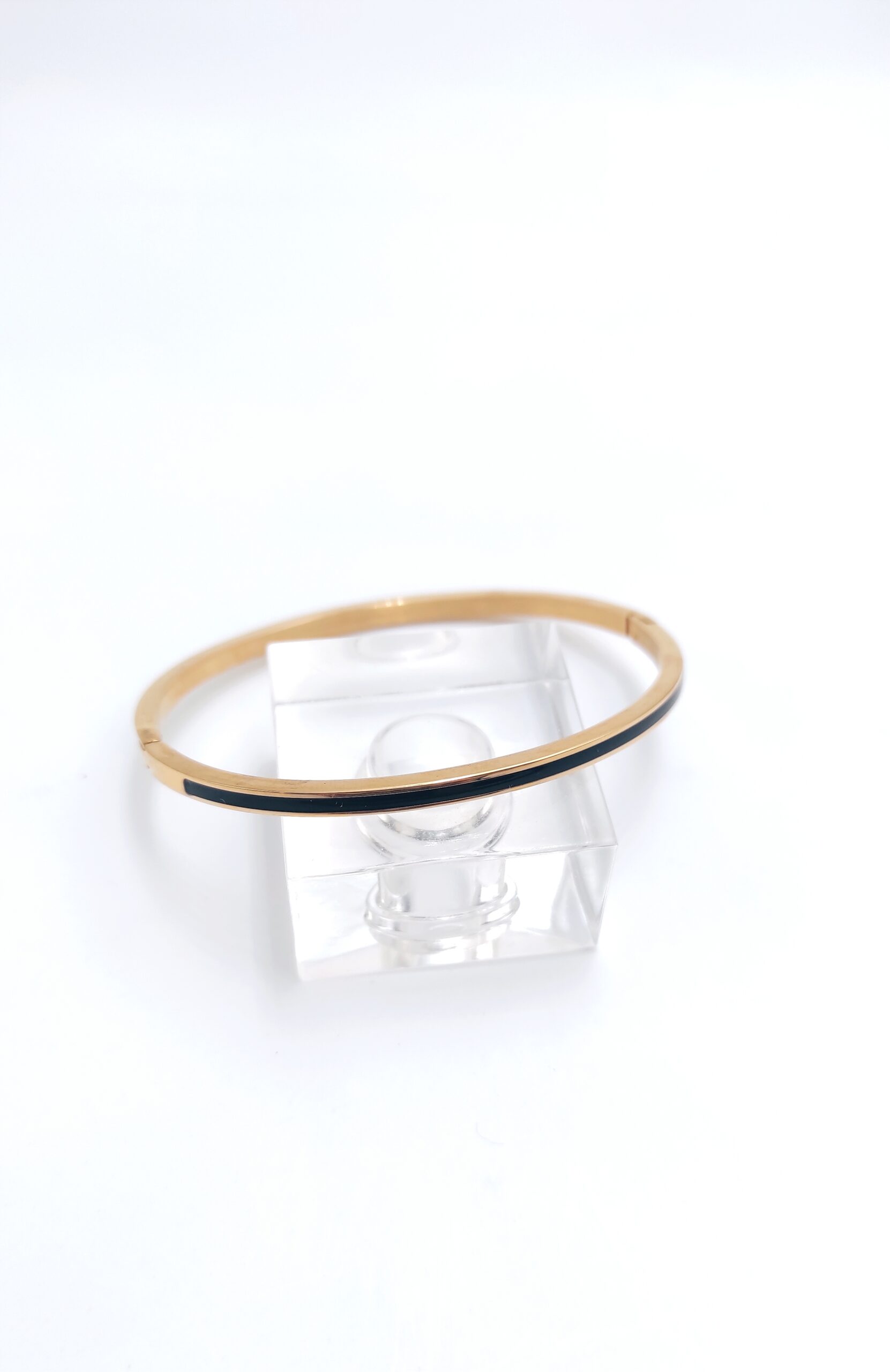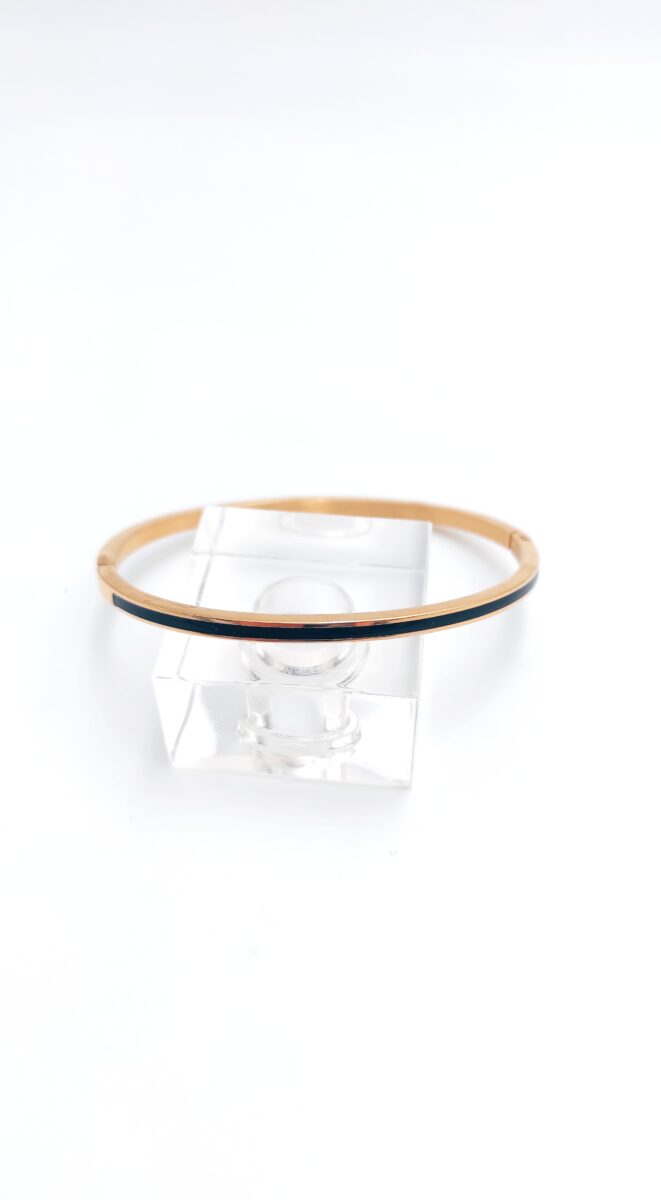 Bracelet jonc en acier inoxydable doré. Émail noir tout autour du bracelet. Bijoux de forme ovale (6cm de diamètre) épousant parfaitement les poignets, évitant que le bracelet tourne, pour un meilleur confort. Jonc s’ouvrant sur le côté, facile à mettre. Bijoux minimaliste, moderne et tendance, avec un côté chic, parfait pour mettre en valeur votre poignet avec élégance 👌😍