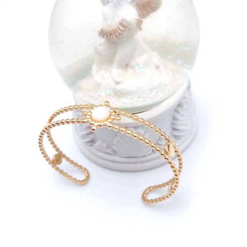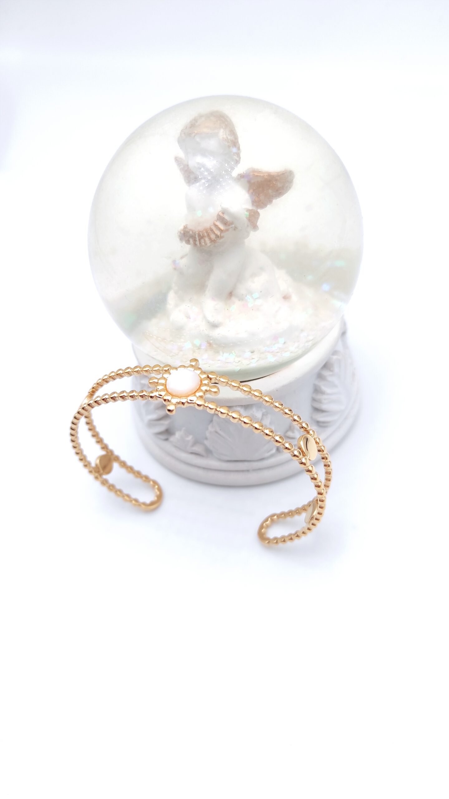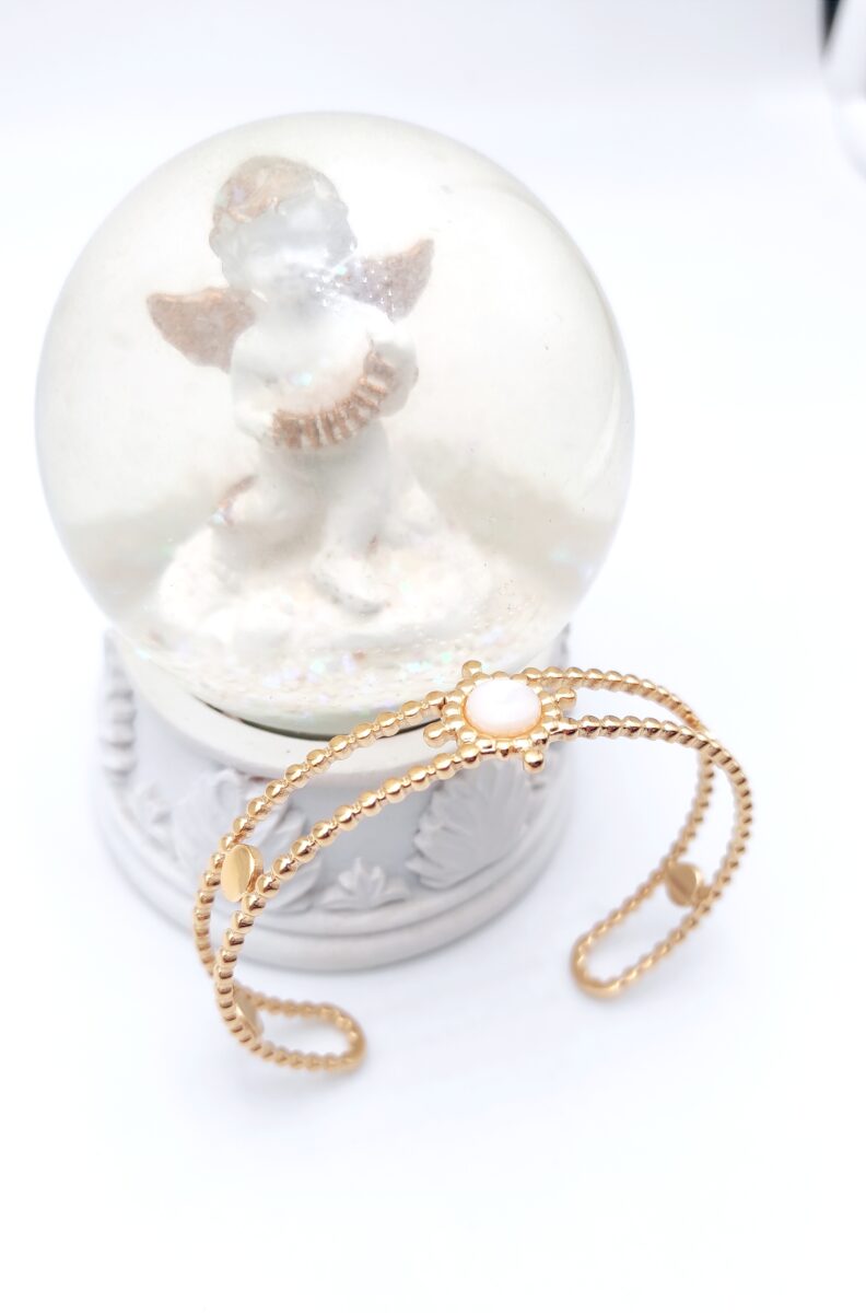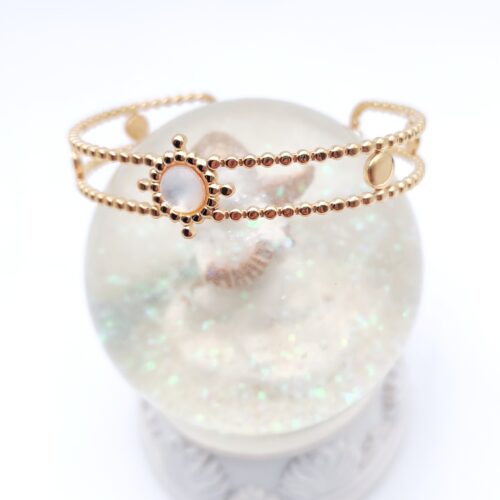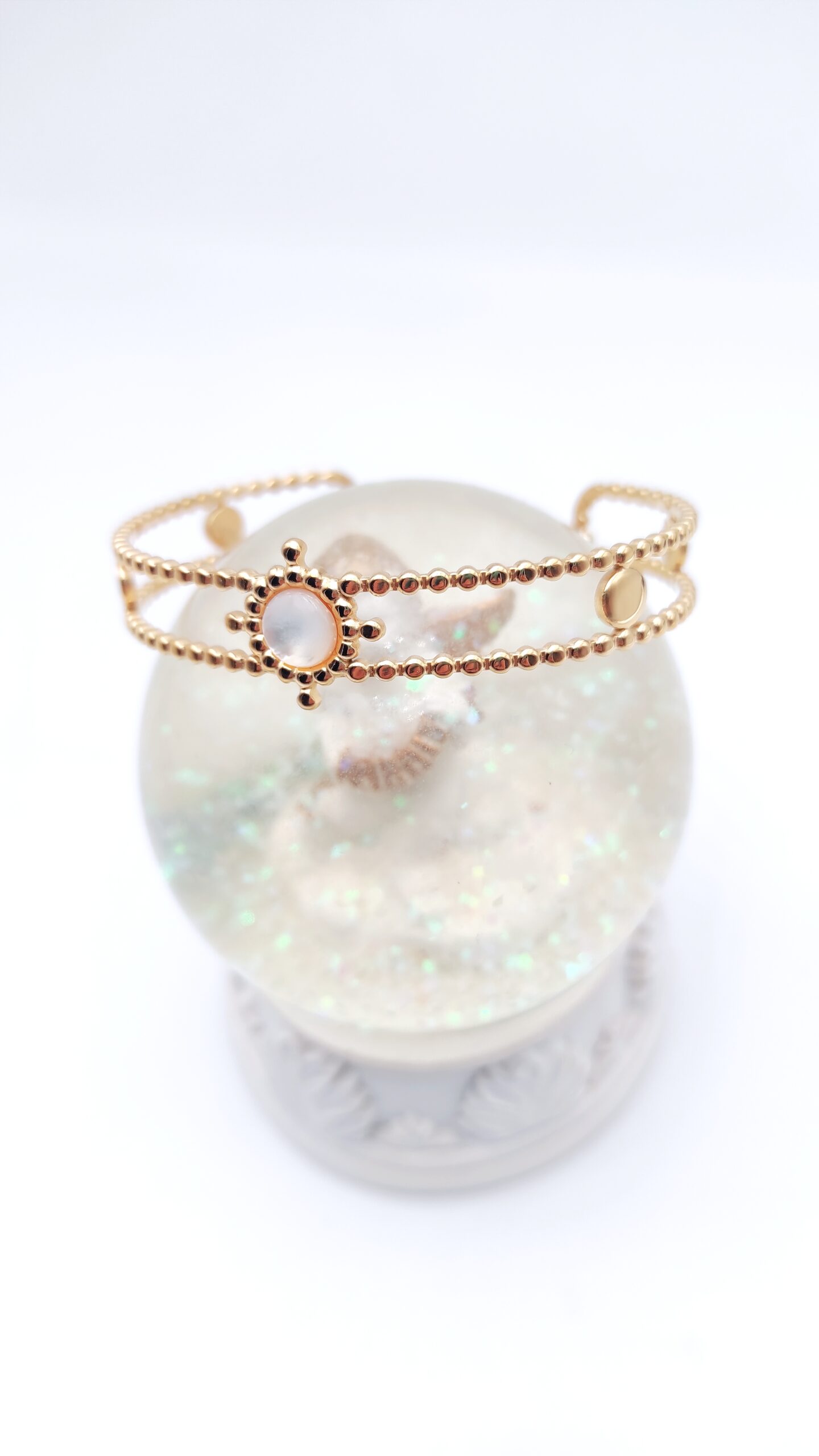 Superbe bracelet type jonc en acier inoxydable doré de marque Ikita 😍 Bijoux surmonté d’une pièce de nacre de 1cm de diamètre. Le bracelet mesure 6cm de diamètre sur 0,9cm de largeur, il peut s’ajuster en fonction de la taille du poignet. Ajouré et travaillé avec une effet de perles dorées, ce jonc est tellement lumineux et raffiné qu’il se suffit à lui-même pour vous mettre en valeur tout en élégance👌😍