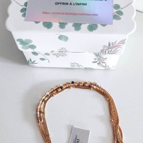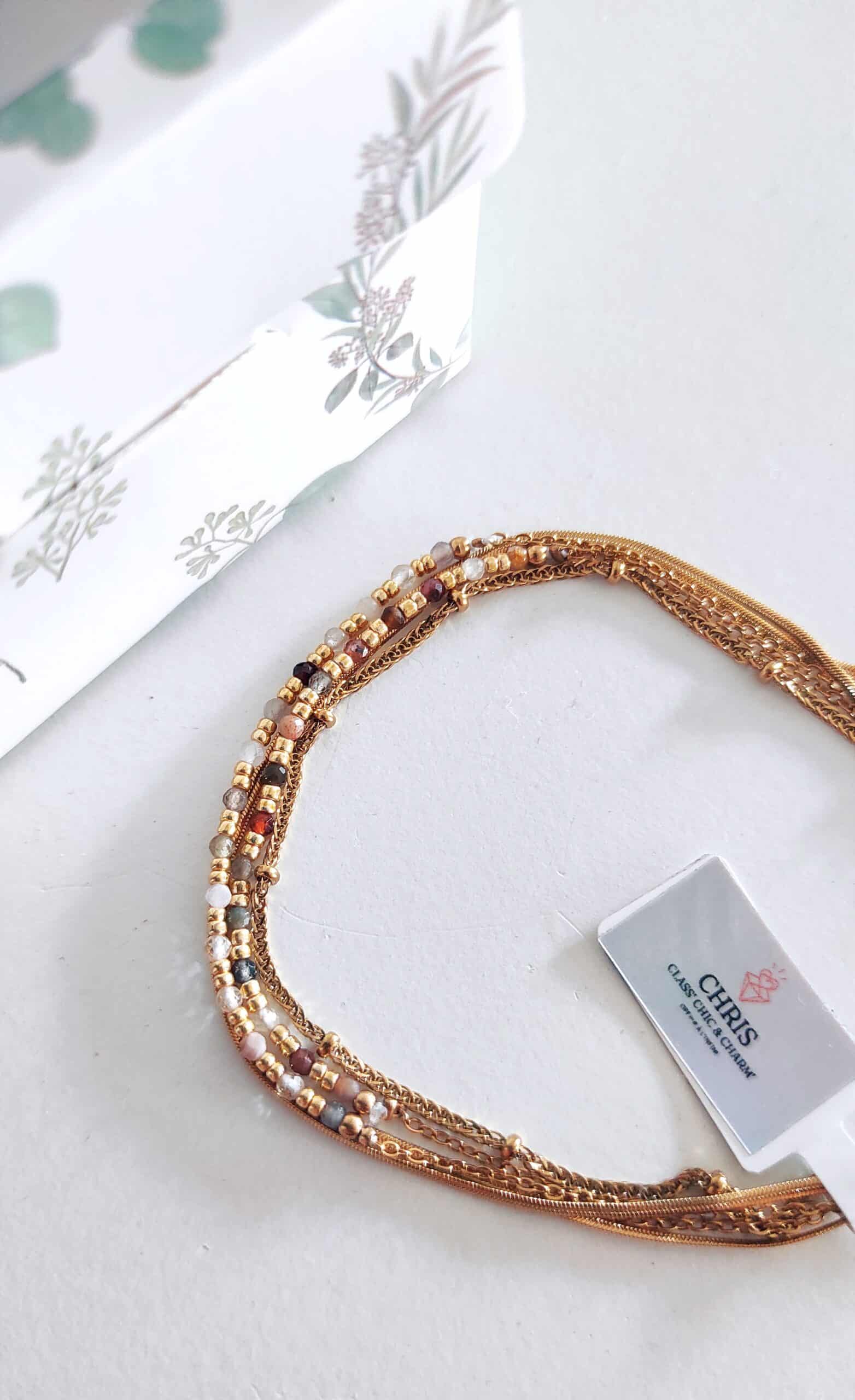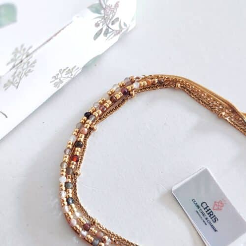 Bracelet en acier inoxydable doré de marque Bohm. Bracelet comportant 5 brins: 2 avec des perles en pierre naturelle Agate multi, 2 chaînes lisses, et 1 chaîne fine.