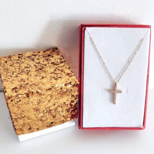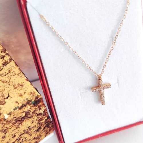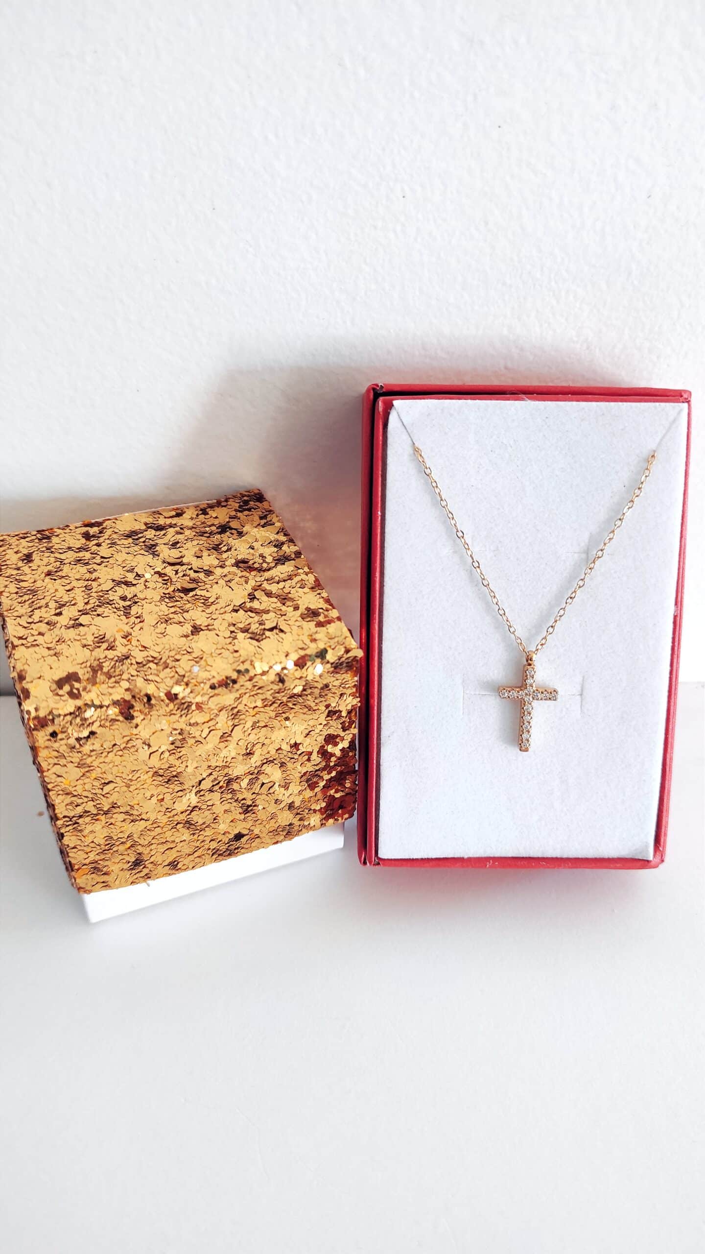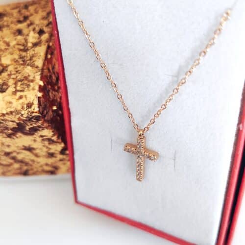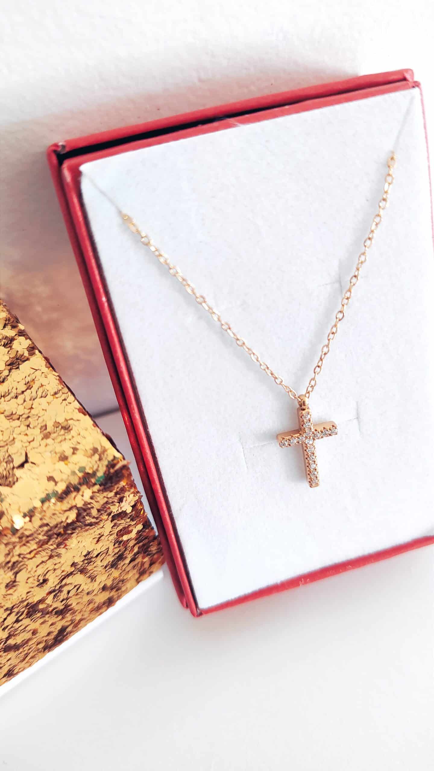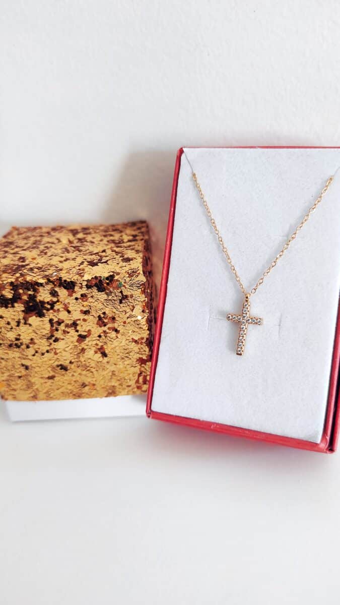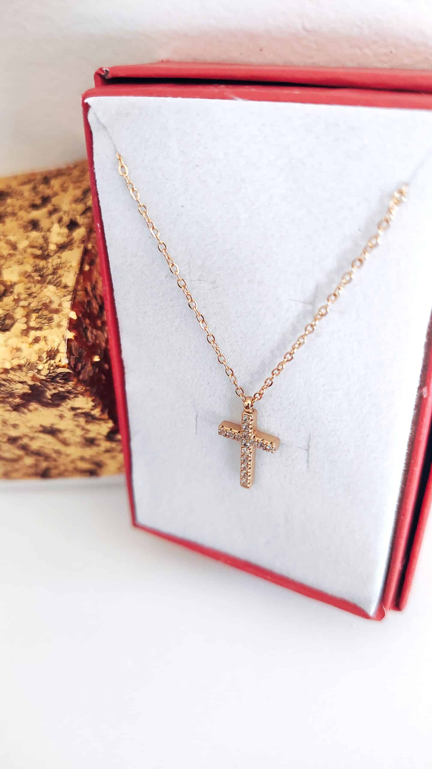 Collier en acier inoxydable doré avec un pendentif en forme de croix ornée de strass.