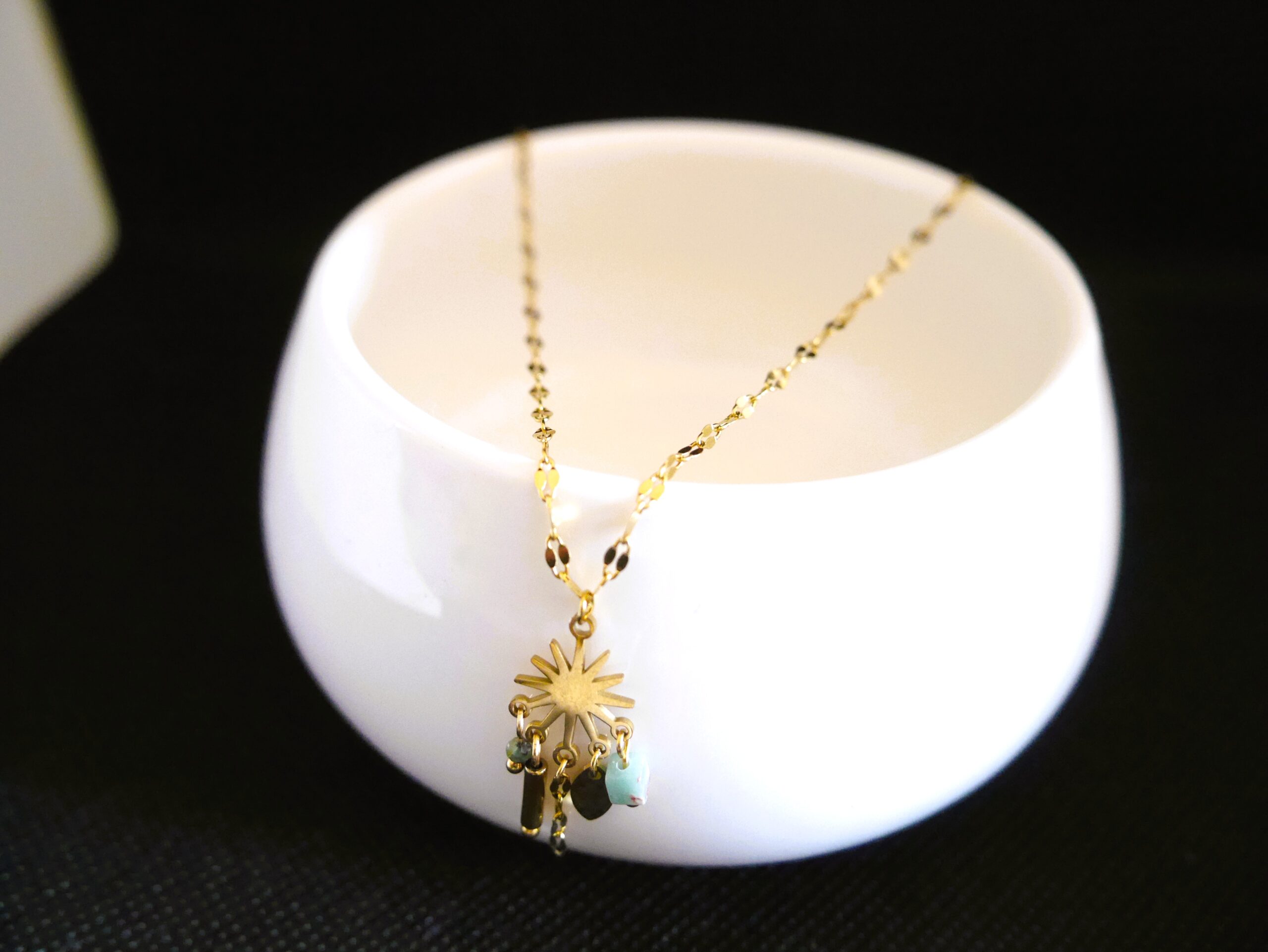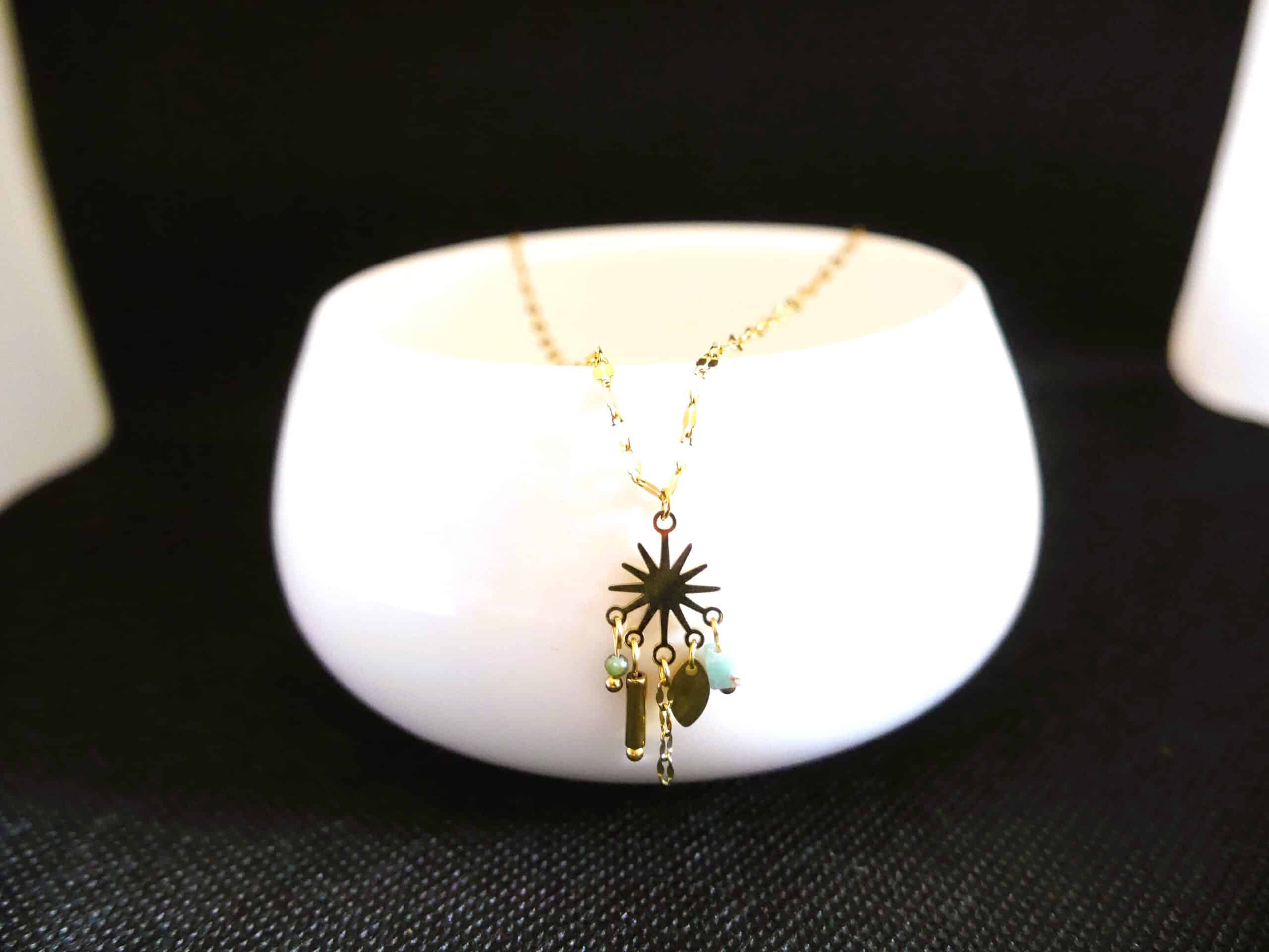 Collier moderne avec pendentif et breloques en pierre naturelle Amazonite. En acier inoxydable doré, ce bijou résiste à l’eau et ne noircit pas. Collier minimaliste et raffiné 👌 Collier court+rallonge.