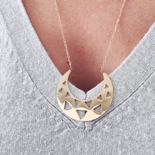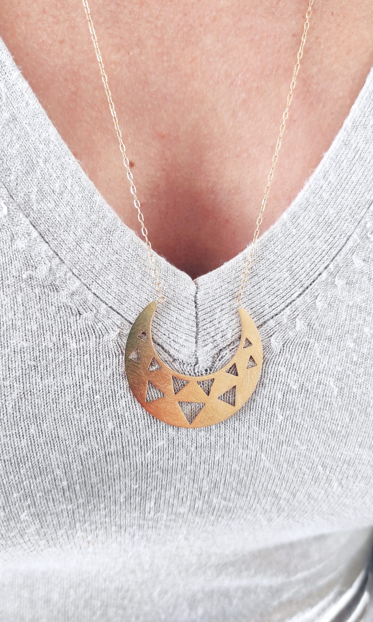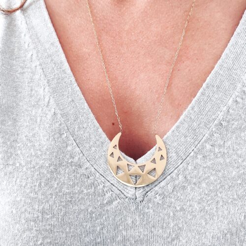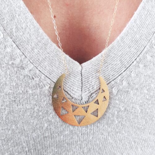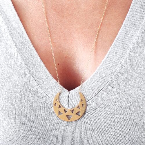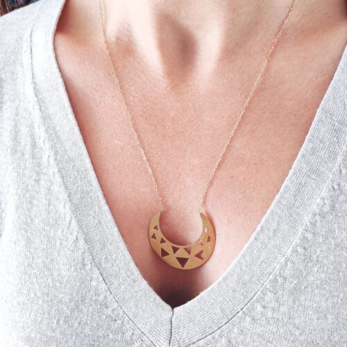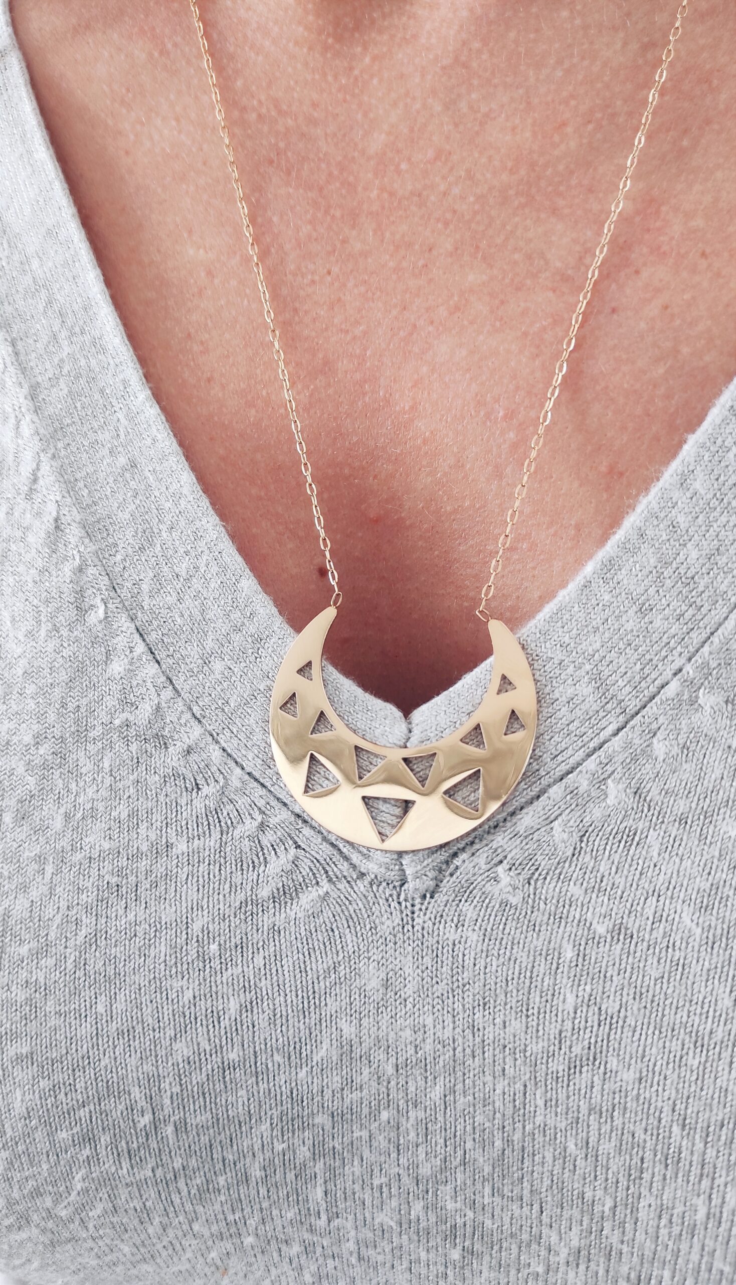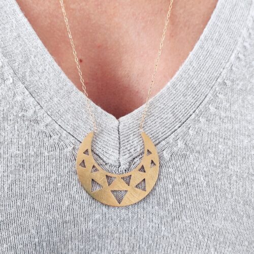 Collier long de marque Ikita en acier inoxydable doré. Collier pouvant s’ajuster grâce à sa rallonge, soit il tombe au niveau du décollé, soit juste en dessous. Le pendentif est constitué de triangles ajourés dans une demie-lune. Bijoux original et singulier 👌 Le pendentif a un côté lisse brillant et un côté brossé, ce qui permet de pouvoir le porter que ce soit avec une tenue chic ou une tenue plus décontractée à votre convenance 👍 Bijoux minimaliste et distingué 😍👌