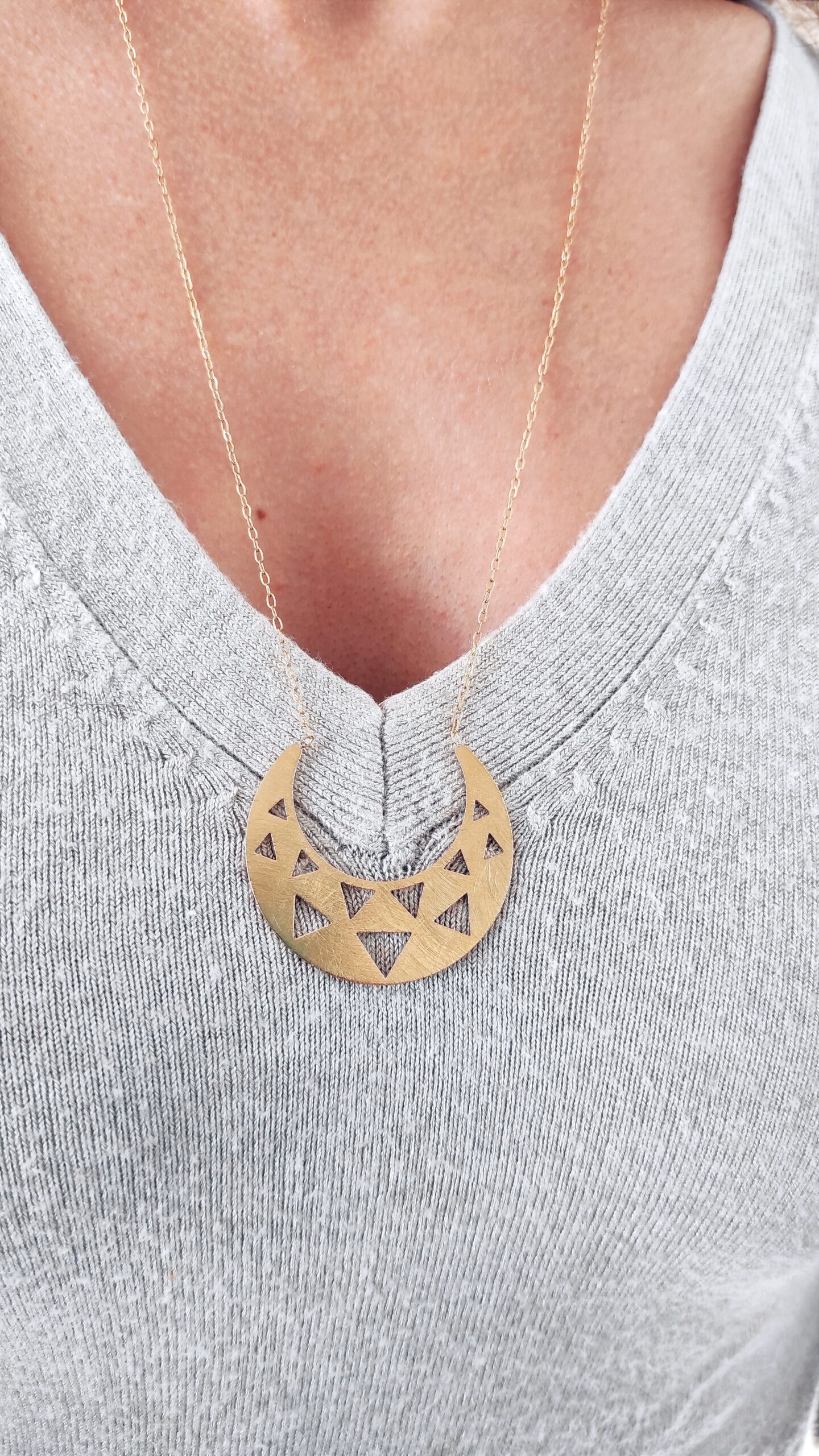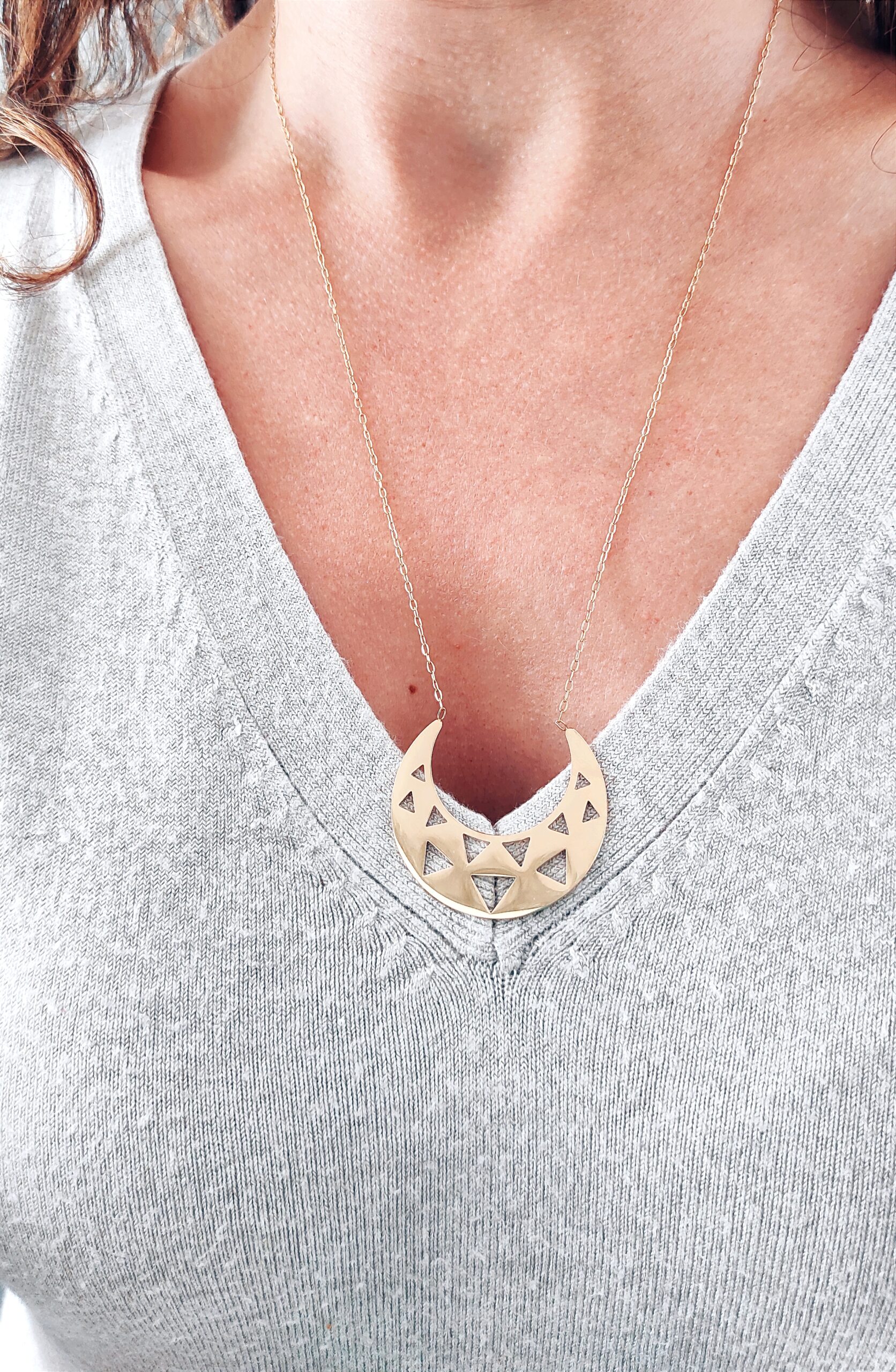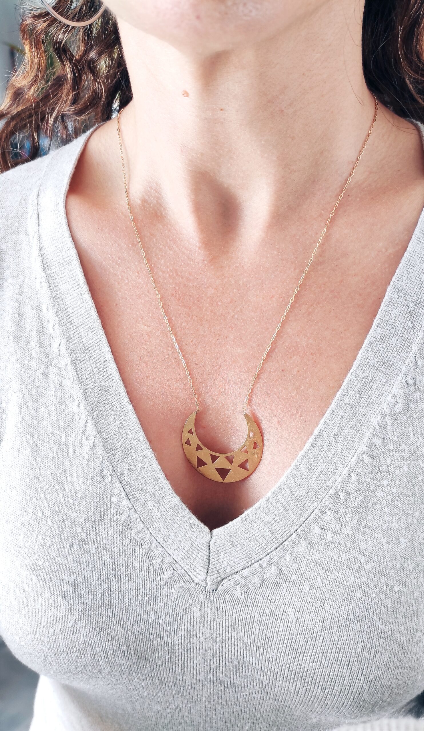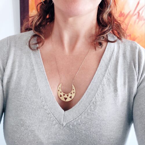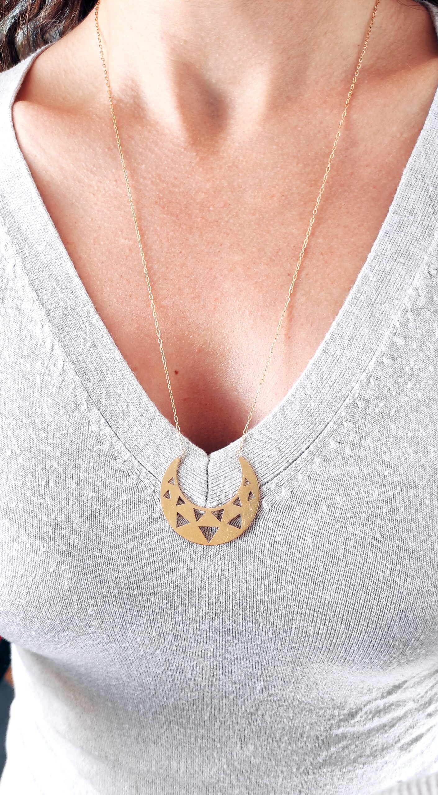 Collier long de marque Ikita en acier inoxydable doré. Collier pouvant s’ajuster grâce à sa rallonge, soit il tombe au niveau du décollé, soit juste en dessous. Le pendentif est constitué de triangles ajourés dans une demie-lune. Bijoux original et singulier 👌 Le pendentif a un côté lisse brillant et un côté brossé, ce qui permet de pouvoir le porter que ce soit avec une tenue chic ou une tenue plus décontractée à votre convenance 👍 Bijoux minimaliste et distingué 😍👌