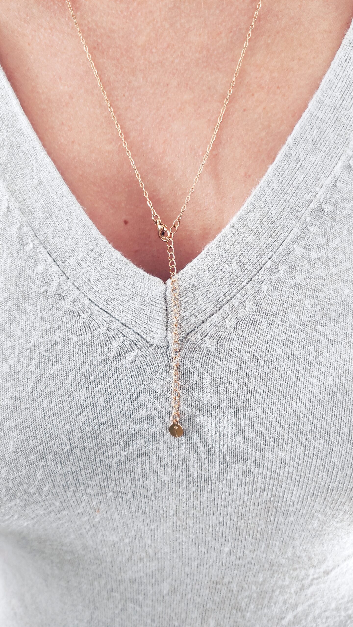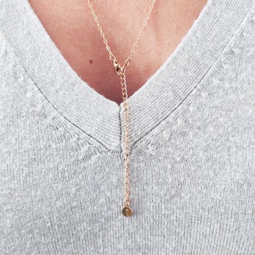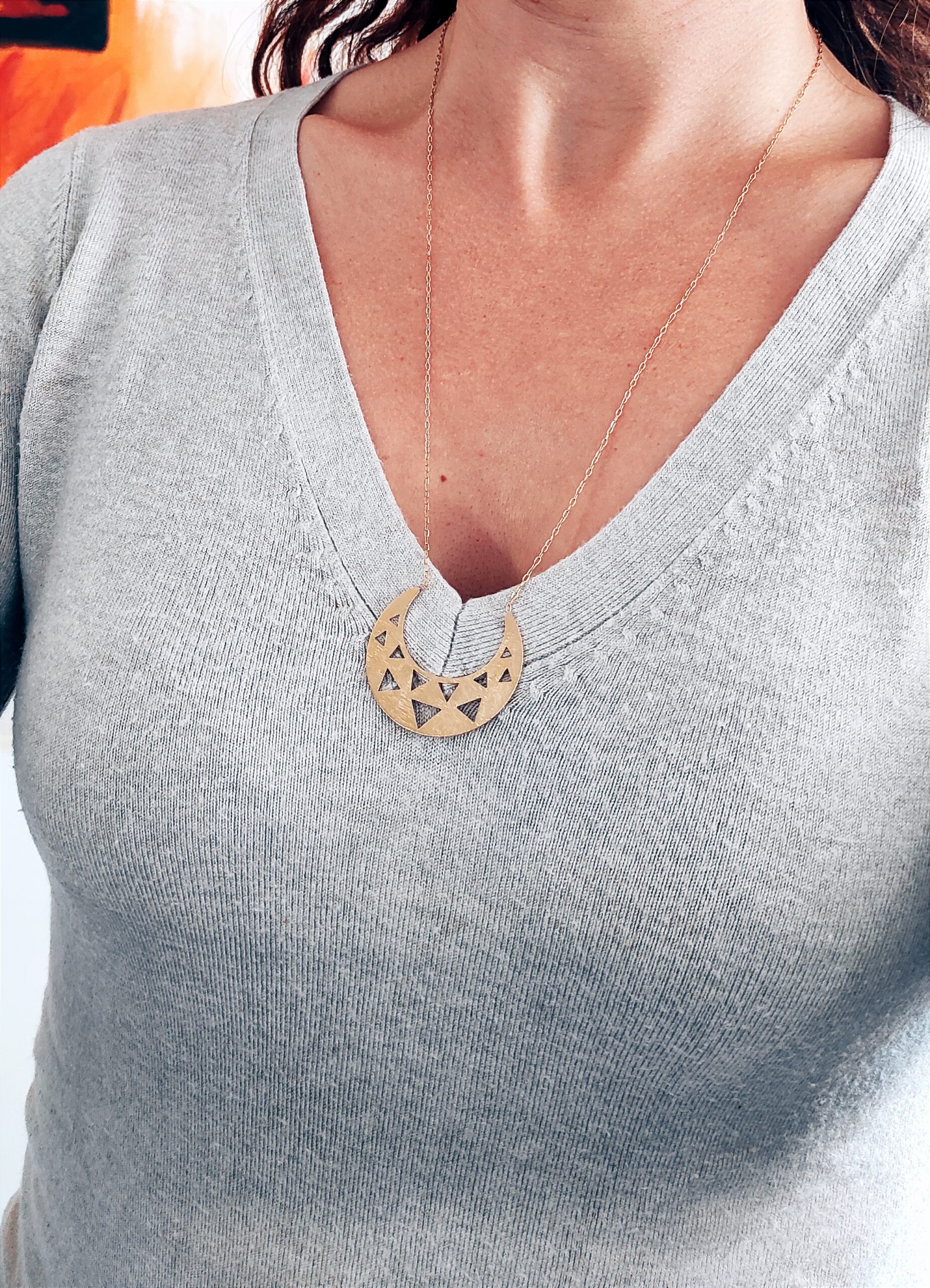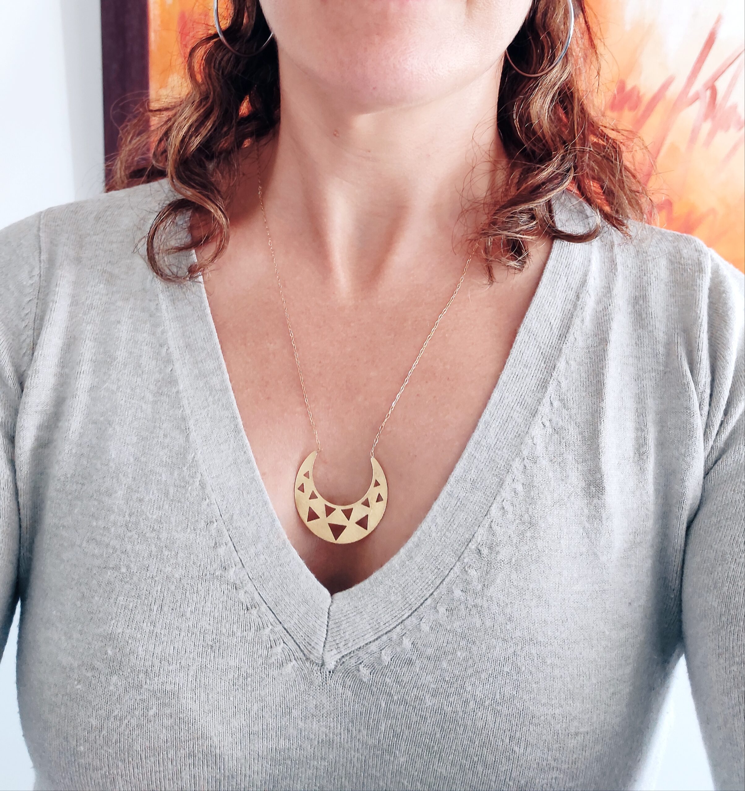 Collier long de marque Ikita en acier inoxydable doré. Collier pouvant s’ajuster grâce à sa rallonge, soit il tombe au niveau du décollé, soit juste en dessous. Le pendentif est constitué de triangles ajourés dans une demie-lune. Bijoux original et singulier 👌 Le pendentif a un côté lisse brillant et un côté brossé, ce qui permet de pouvoir le porter que ce soit avec une tenue chic ou une tenue plus décontractée à votre convenance 👍 Bijoux minimaliste et distingué 😍👌