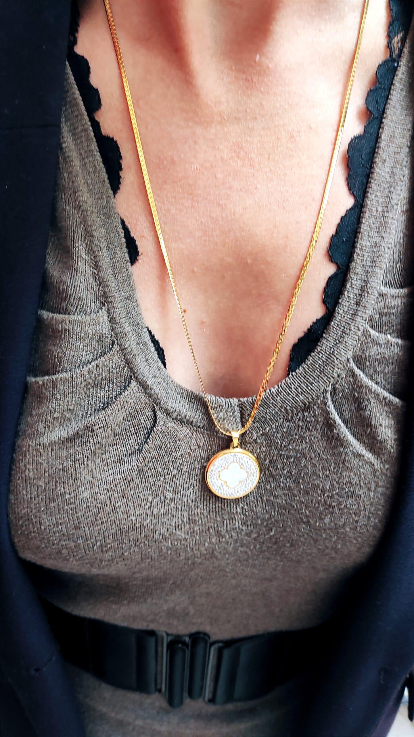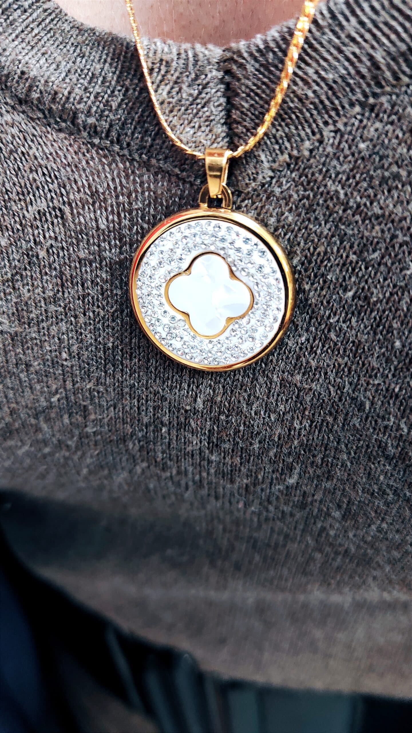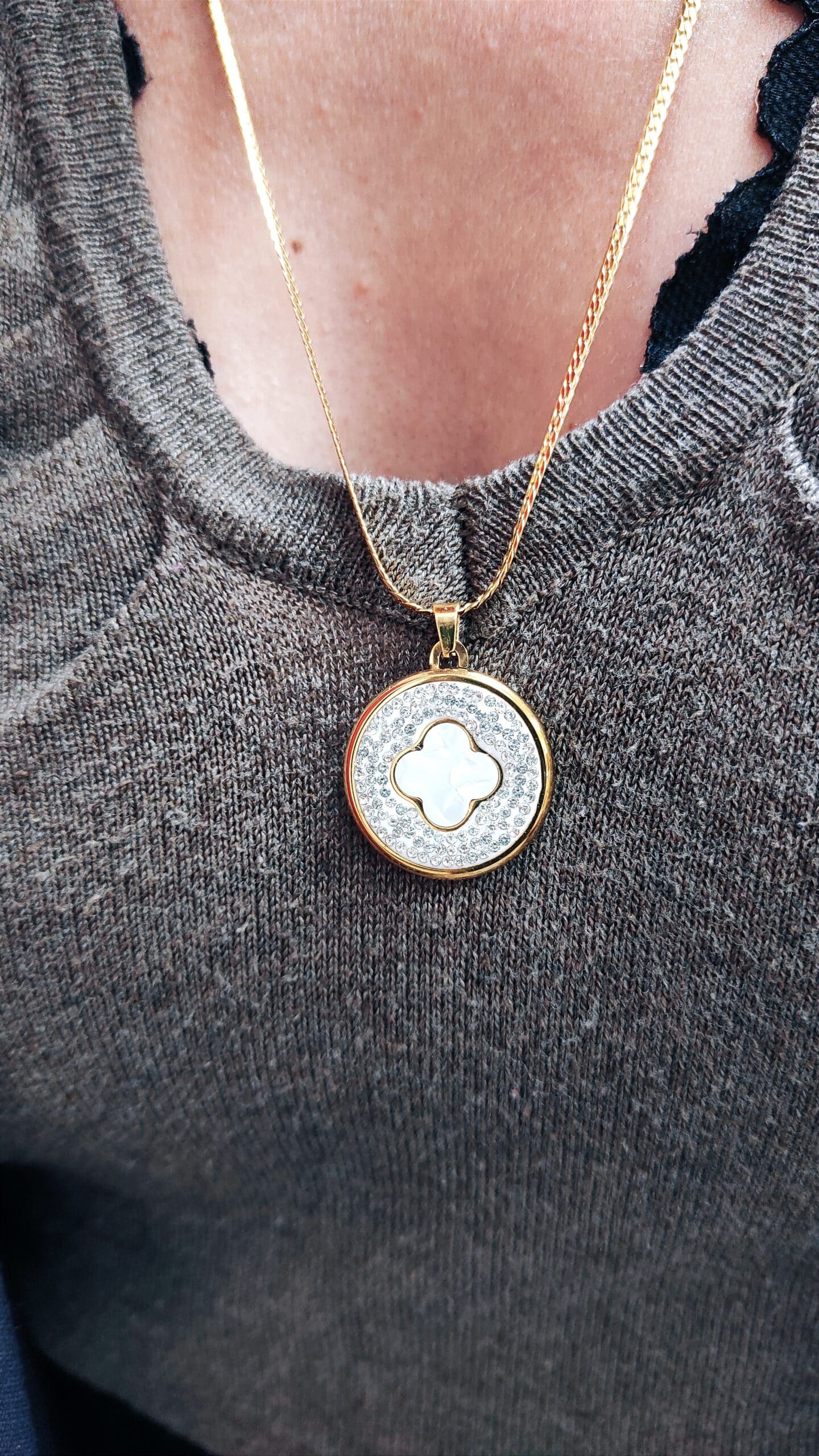 Splendide collier mi-long en acier inoxydable doré avec un pendentif rond orné de strass au centre formant un trèfle et comblé par un émail effet nacre.