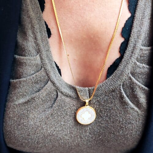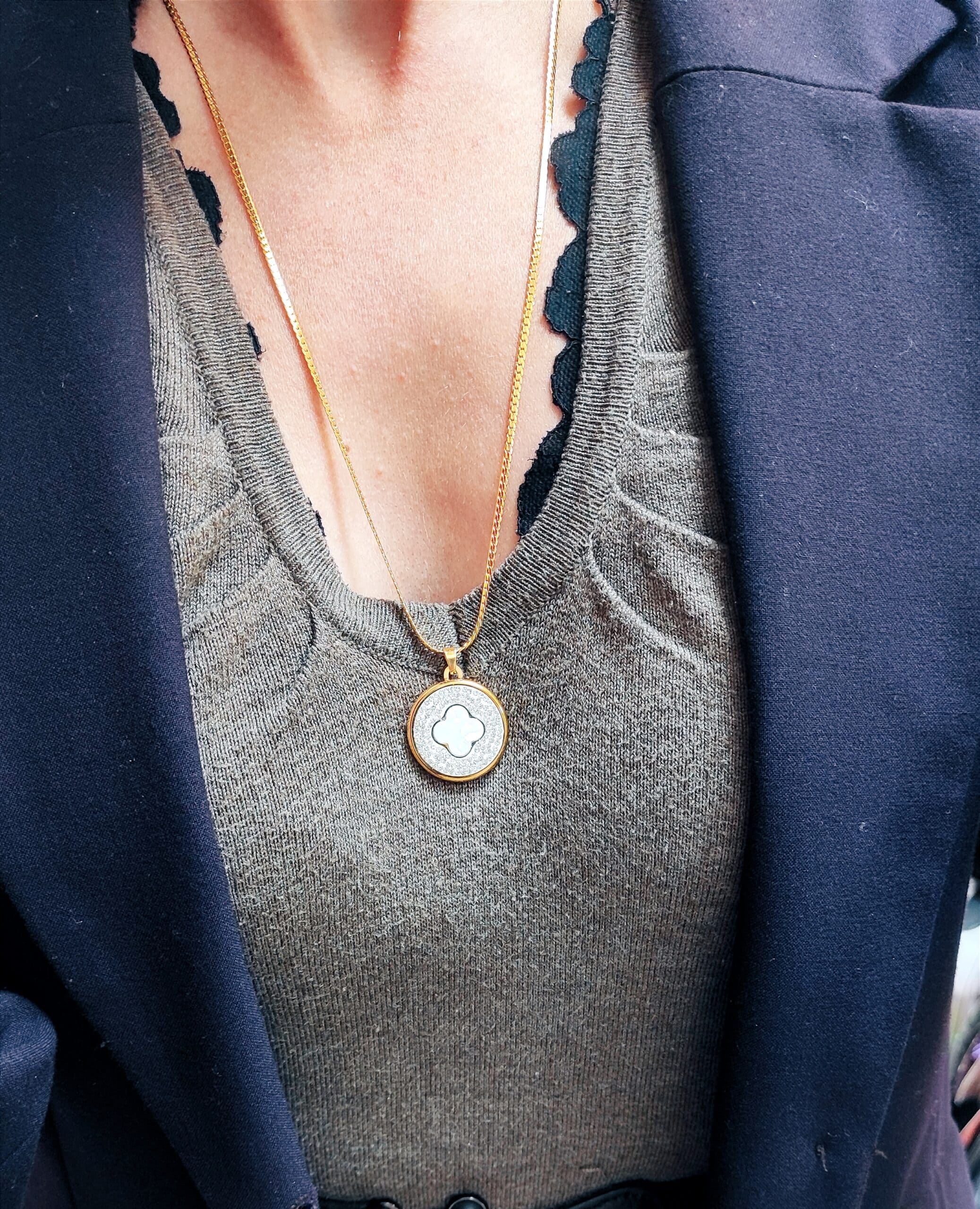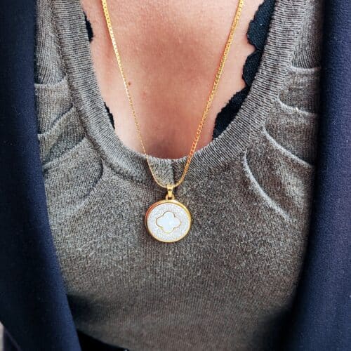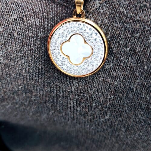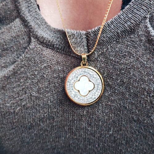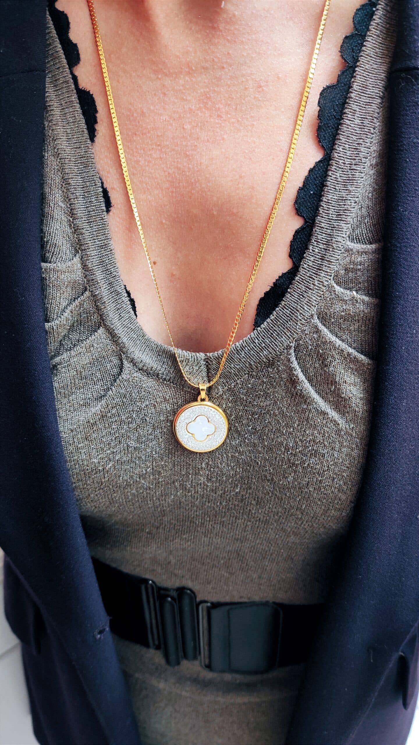 Splendide collier mi-long en acier inoxydable doré avec un pendentif rond orné de strass au centre formant un trèfle et comblé par un émail effet nacre.