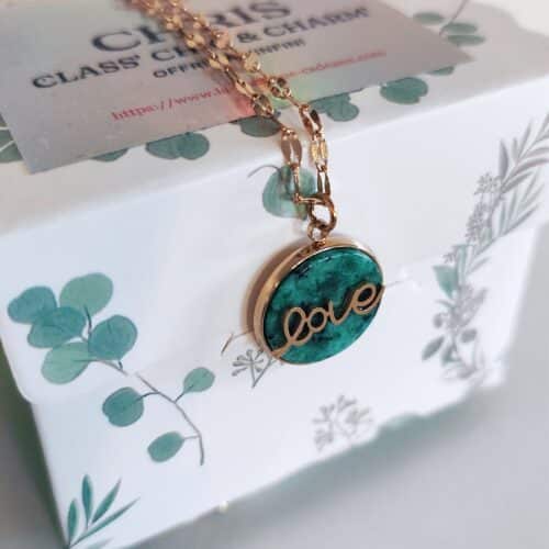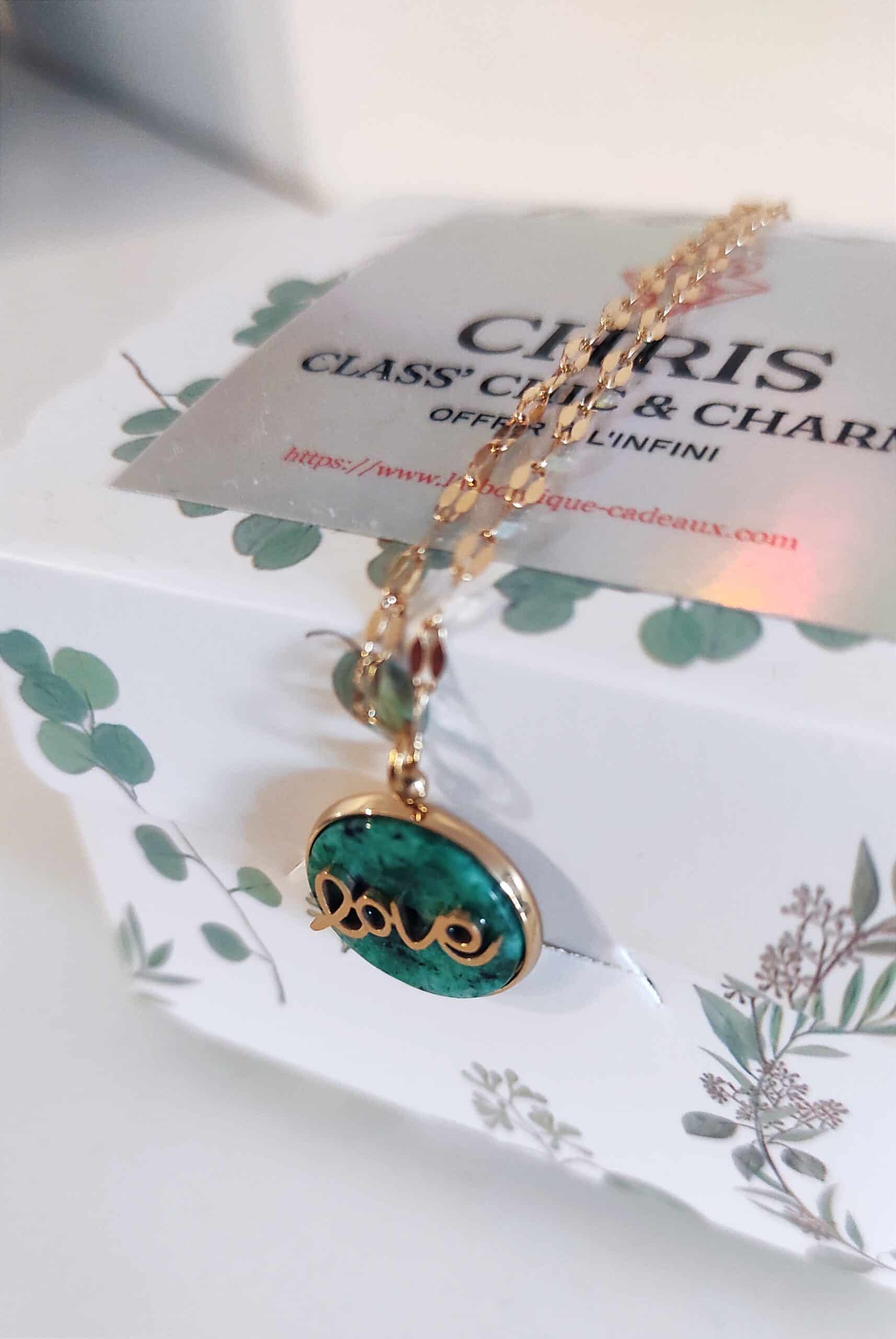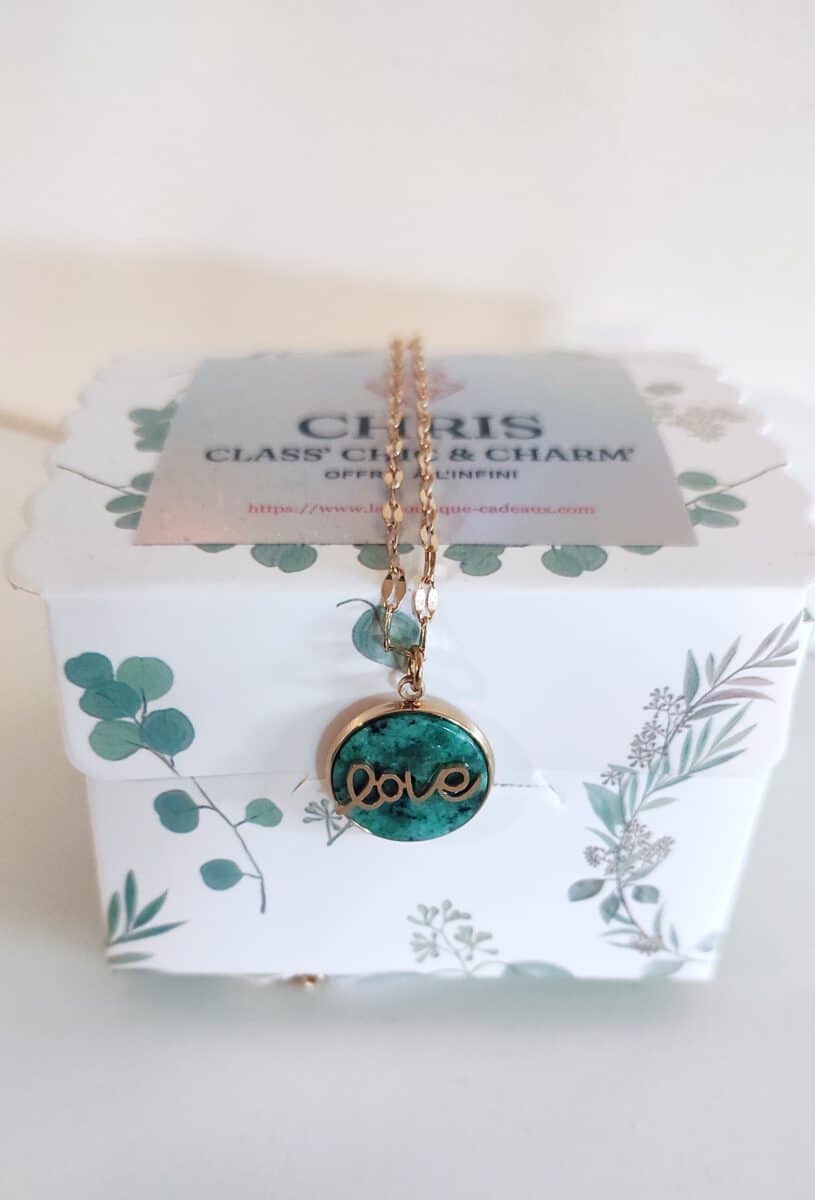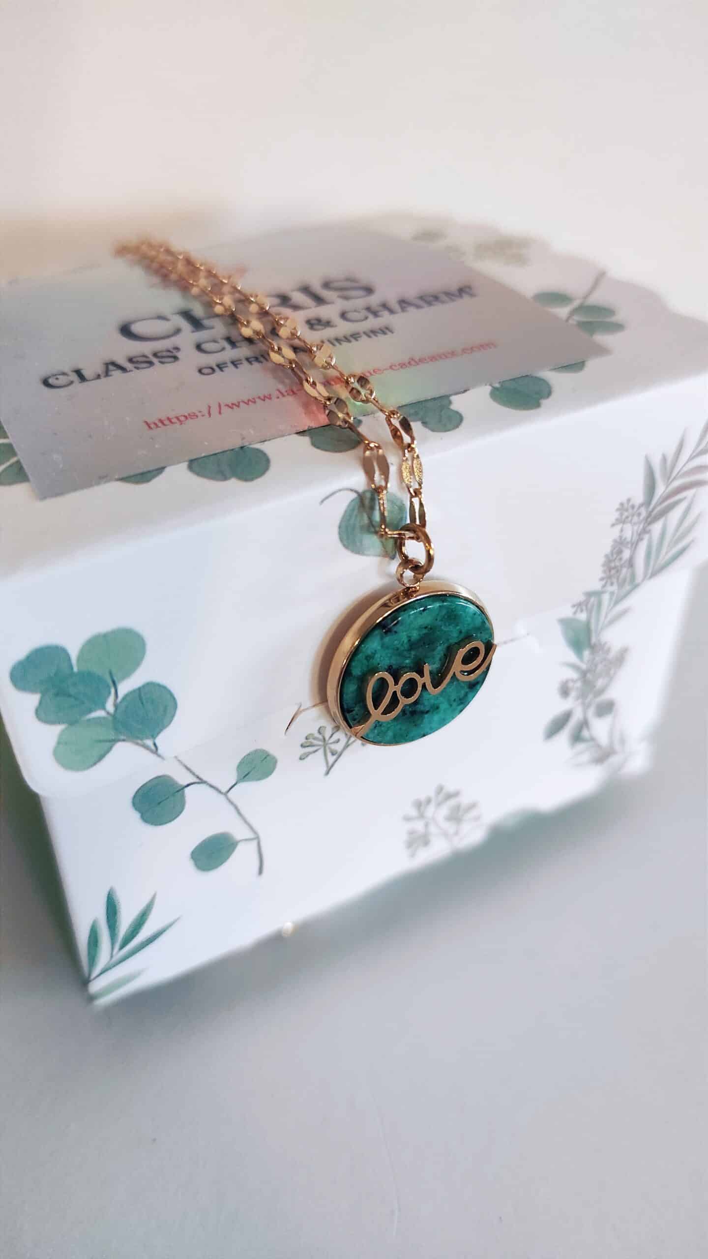 Collier en acier inoxydable doré de marque Lolilota avec un pendentif en pierre turquoise africaine de forme ronde et une inscription « Love » dorée dessus.
