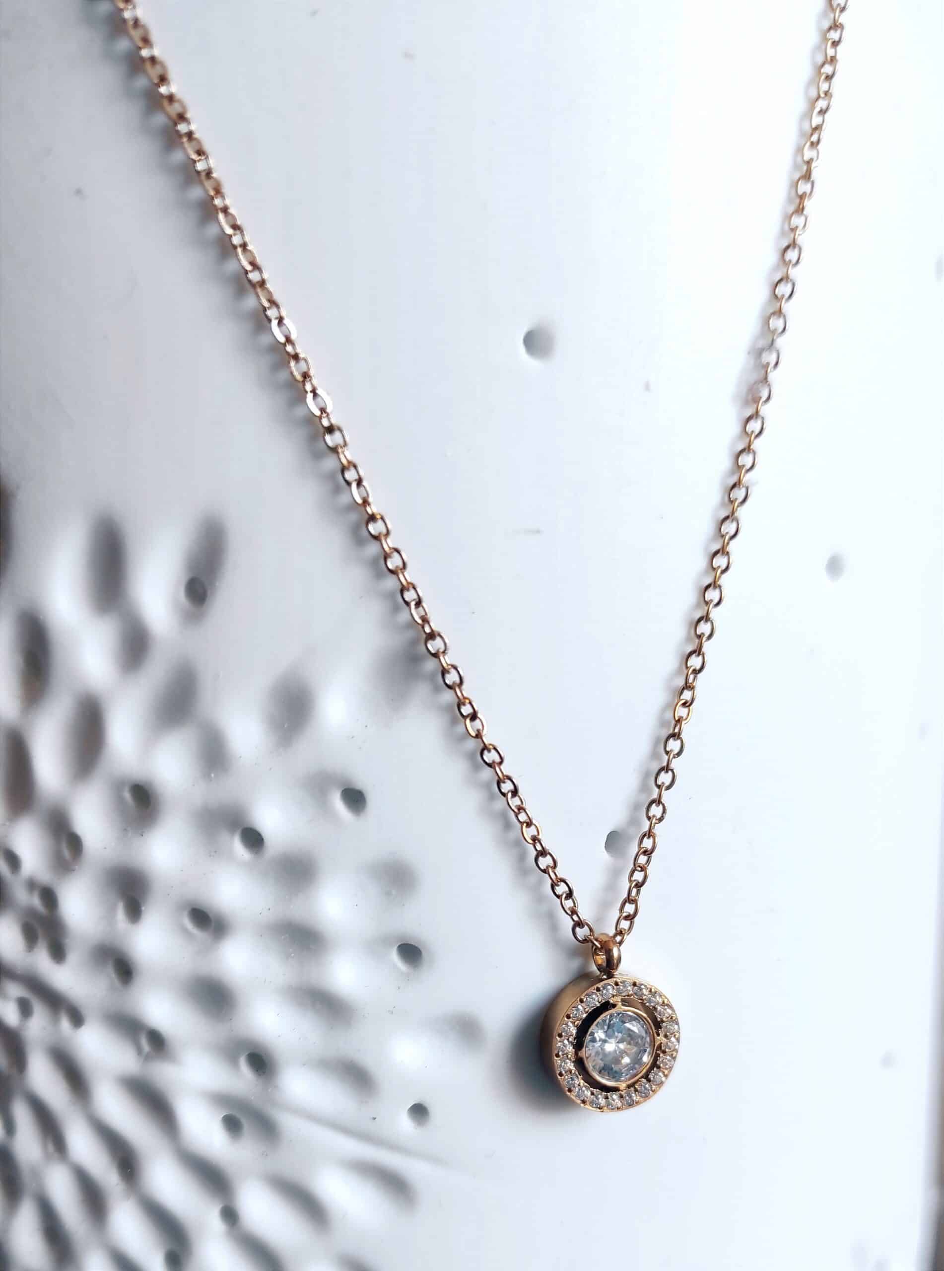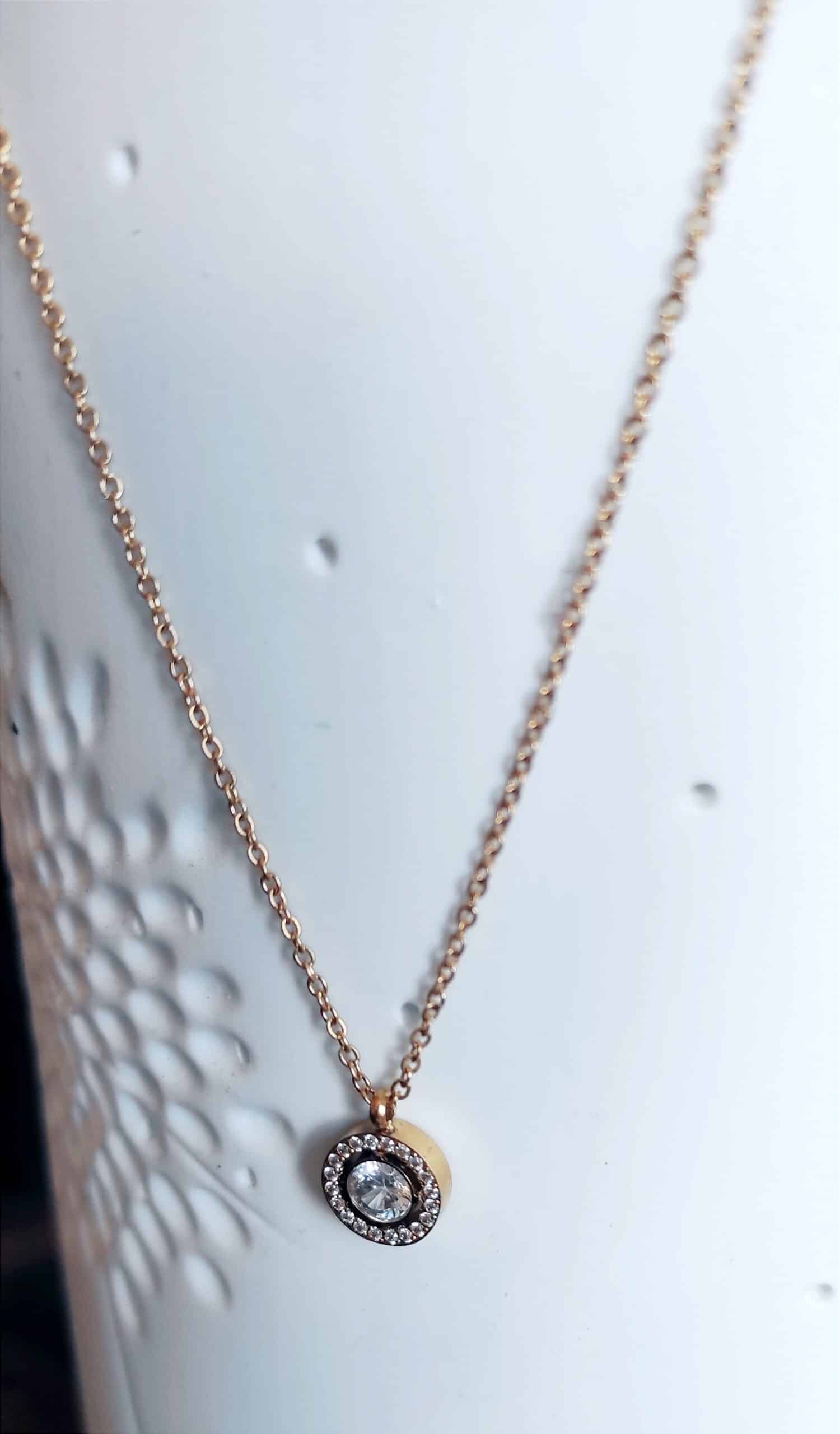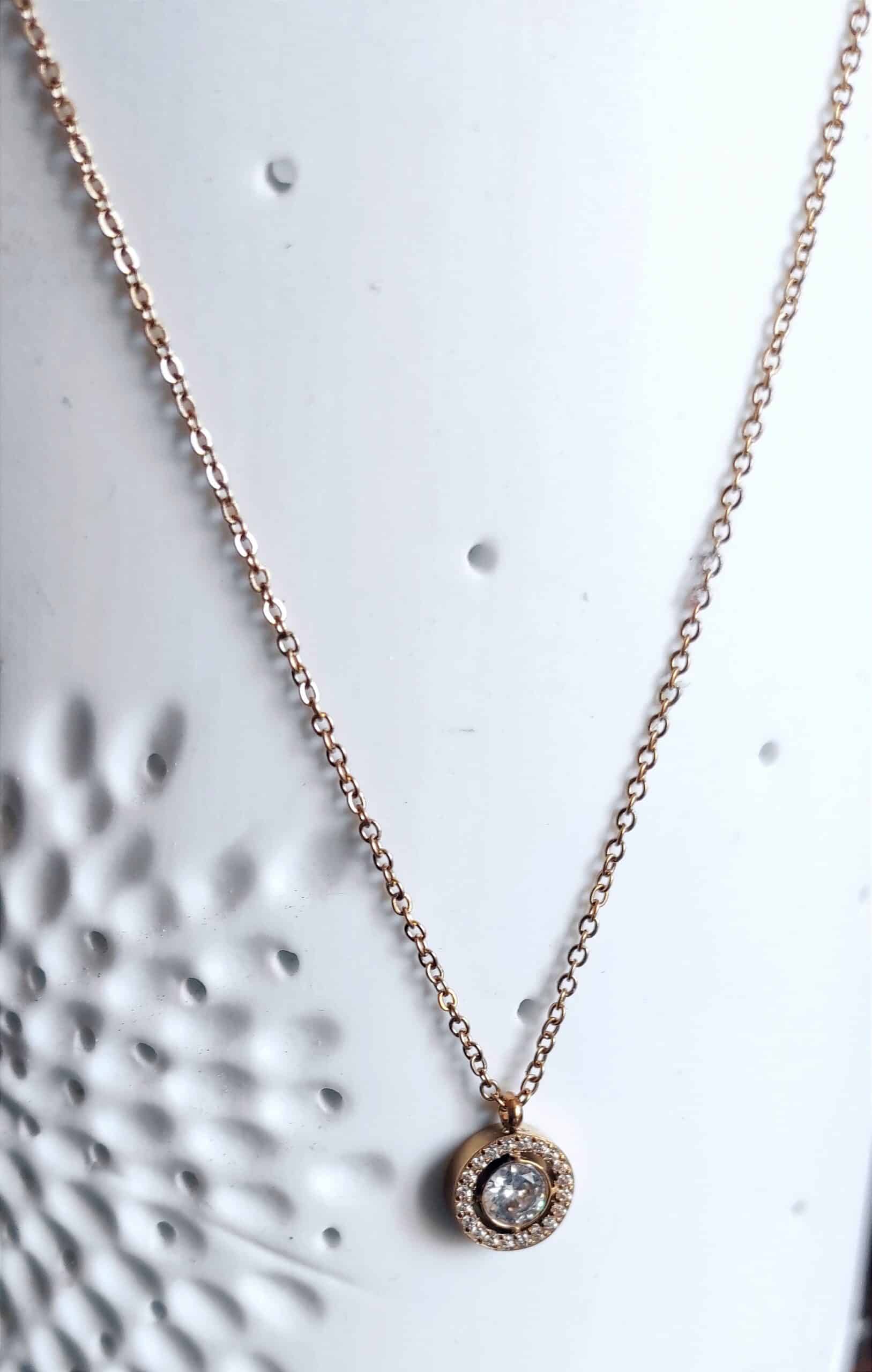 Collier en acier inoxydable doré avec un pendentif plat de forme ronde orné de strass.