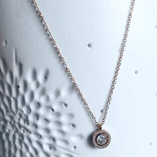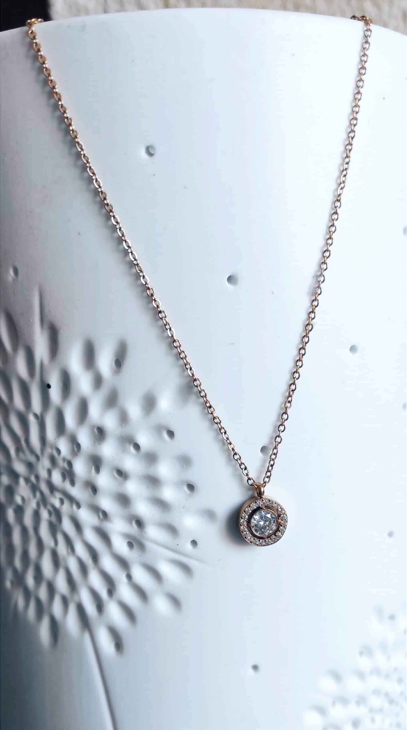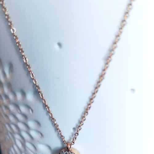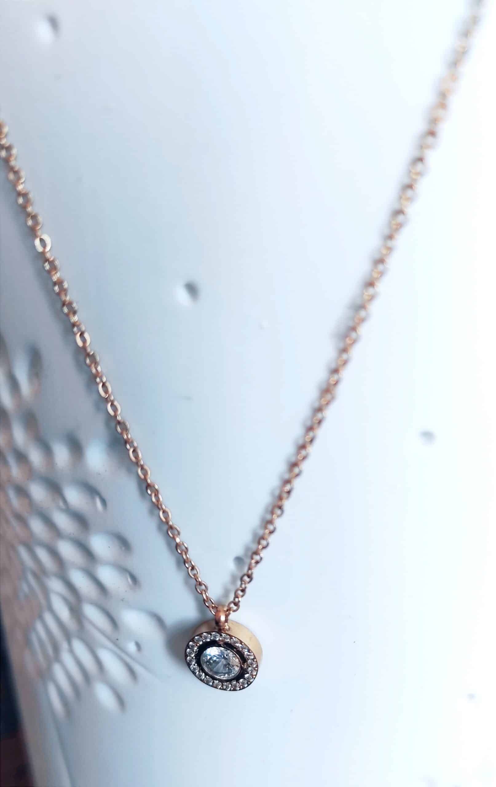 Collier en acier inoxydable doré avec un pendentif plat de forme ronde orné de strass.