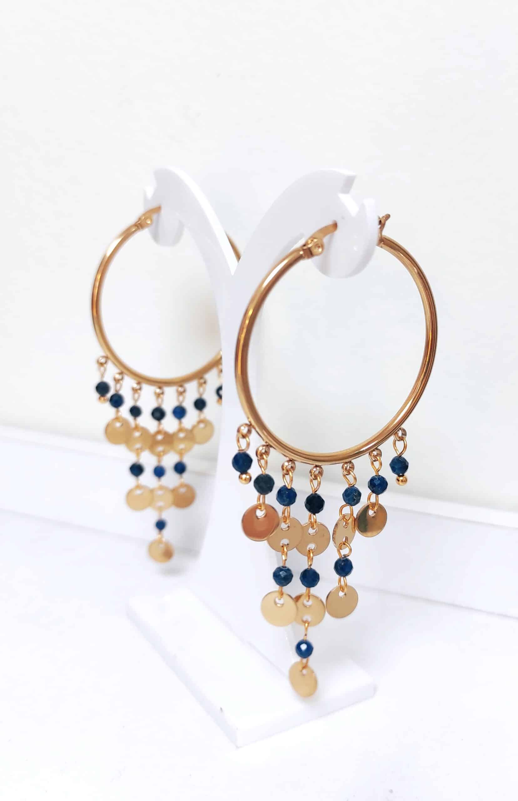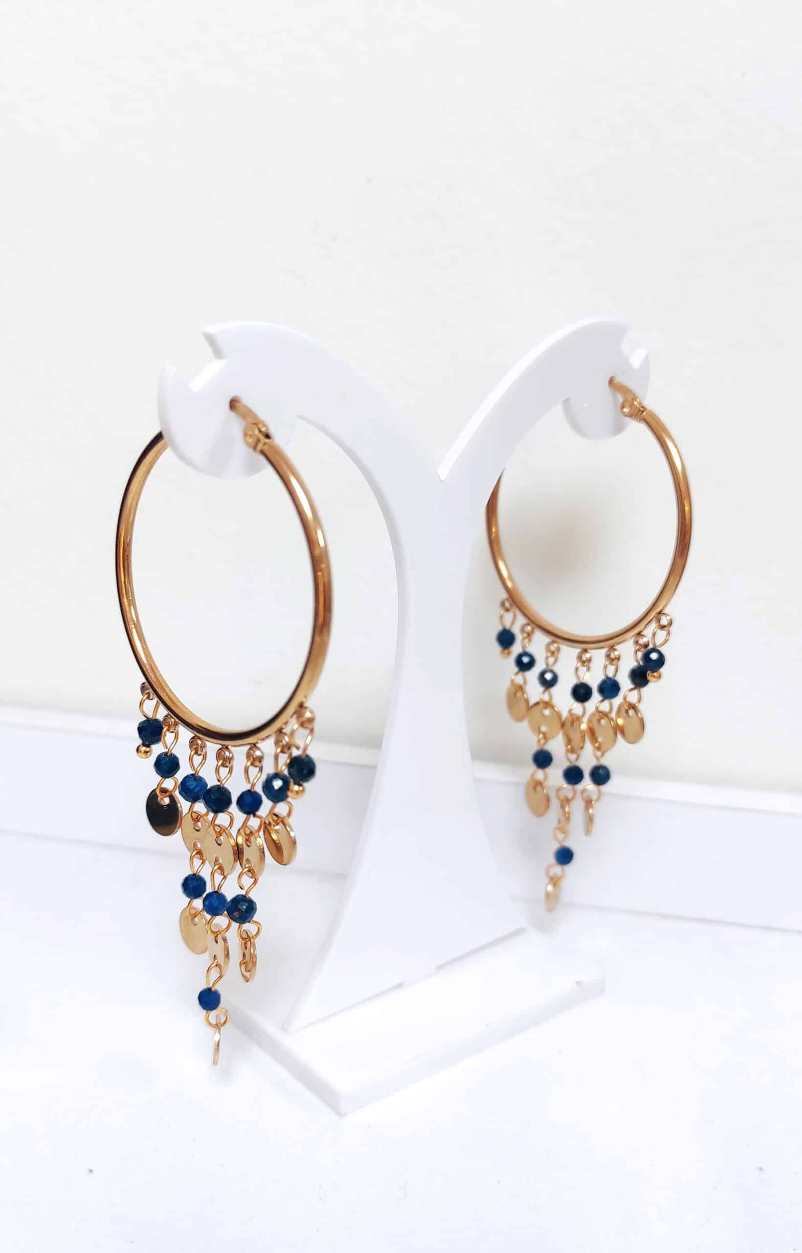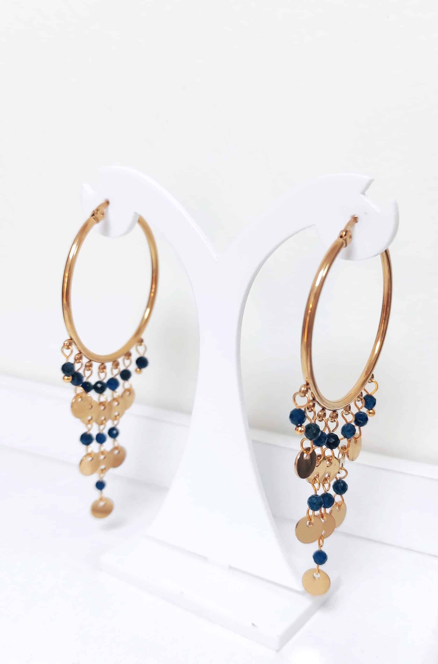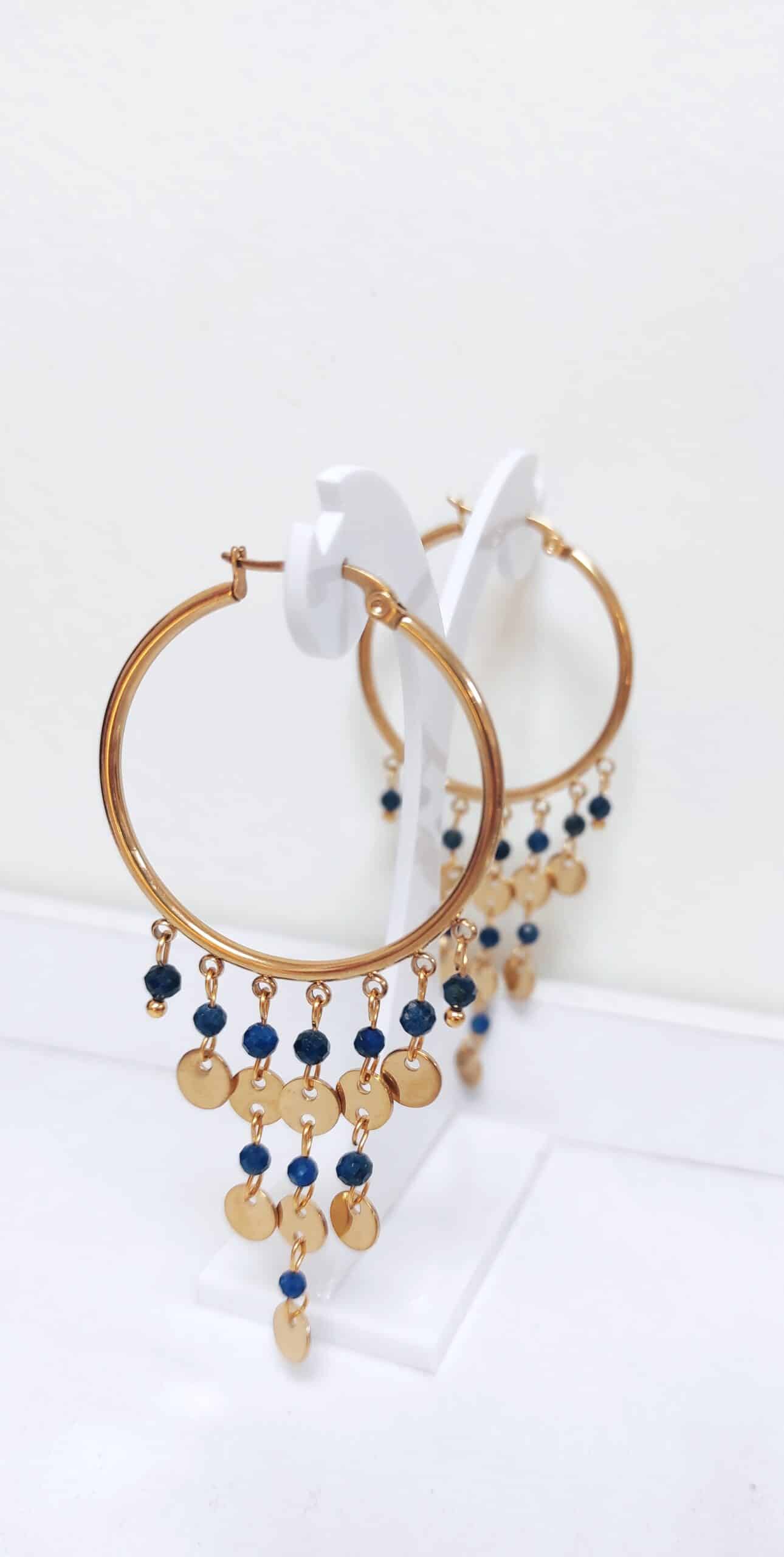 Boucles d’oreilles type créoles en acier inoxydable doré avec une pluie de pastilles rondes pleines et des perles en pierre naturelle Lapis Lazuli de couleur bleu marine. Bijoux léger facile à porter, se terminant en forme de pointe pour une touche d’originalité en restant très tendance 👌😍