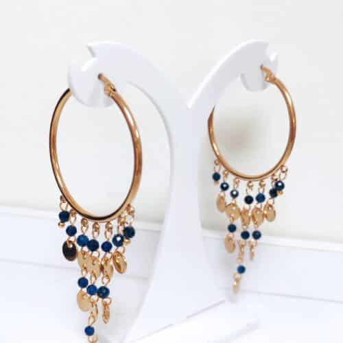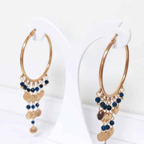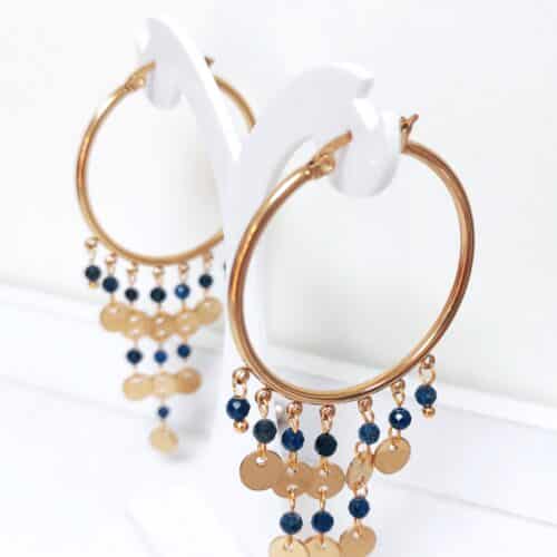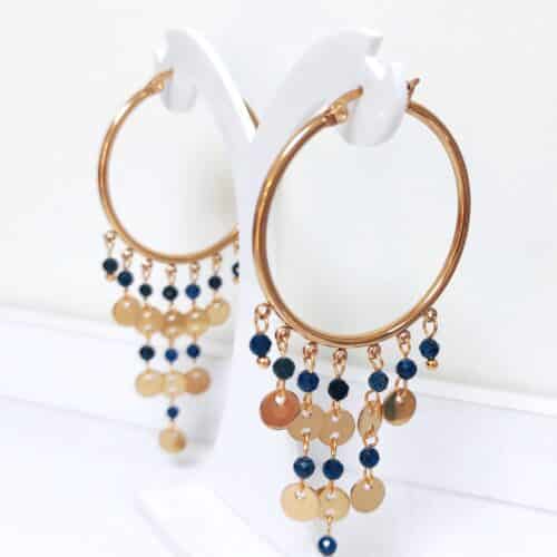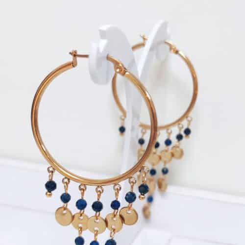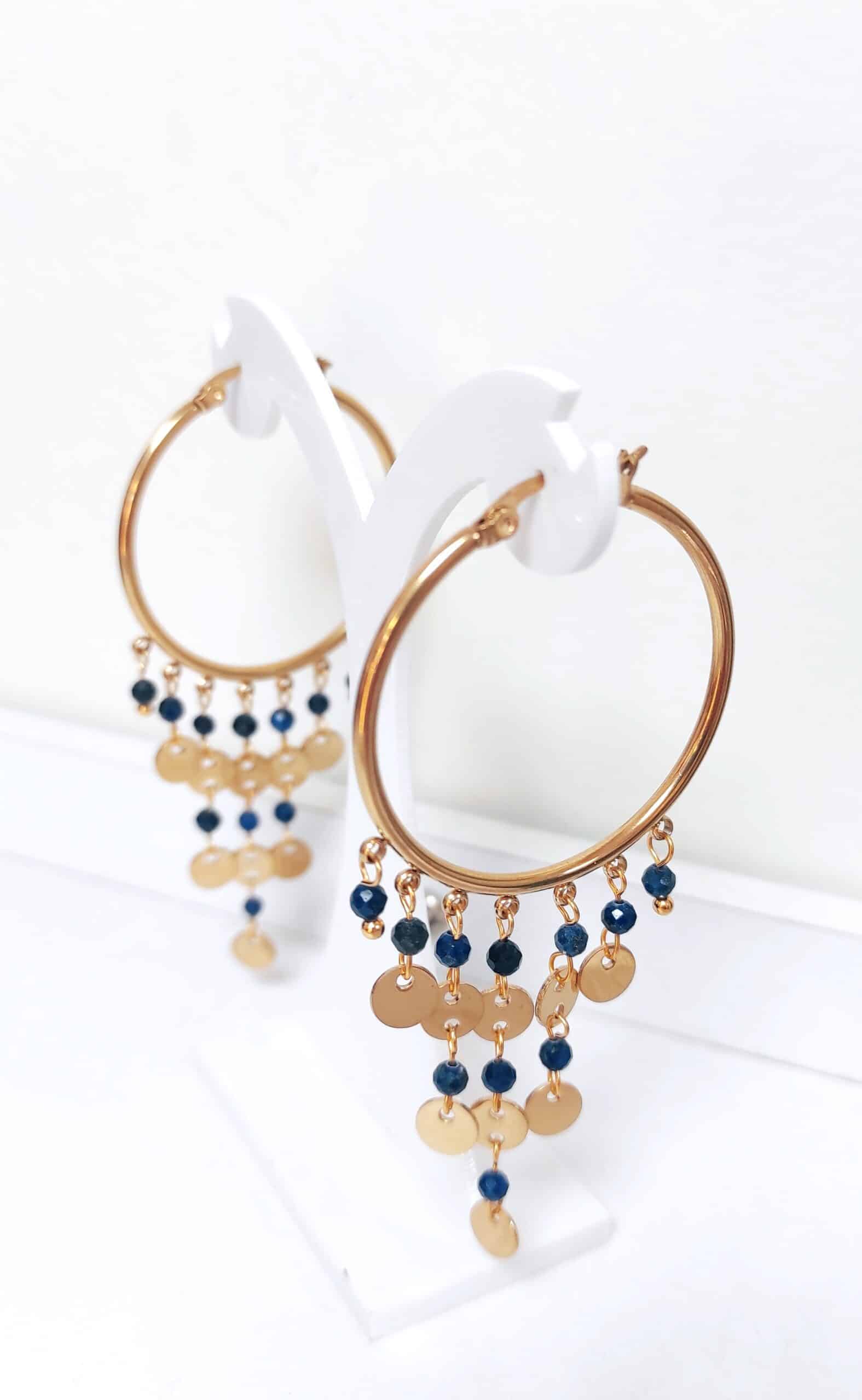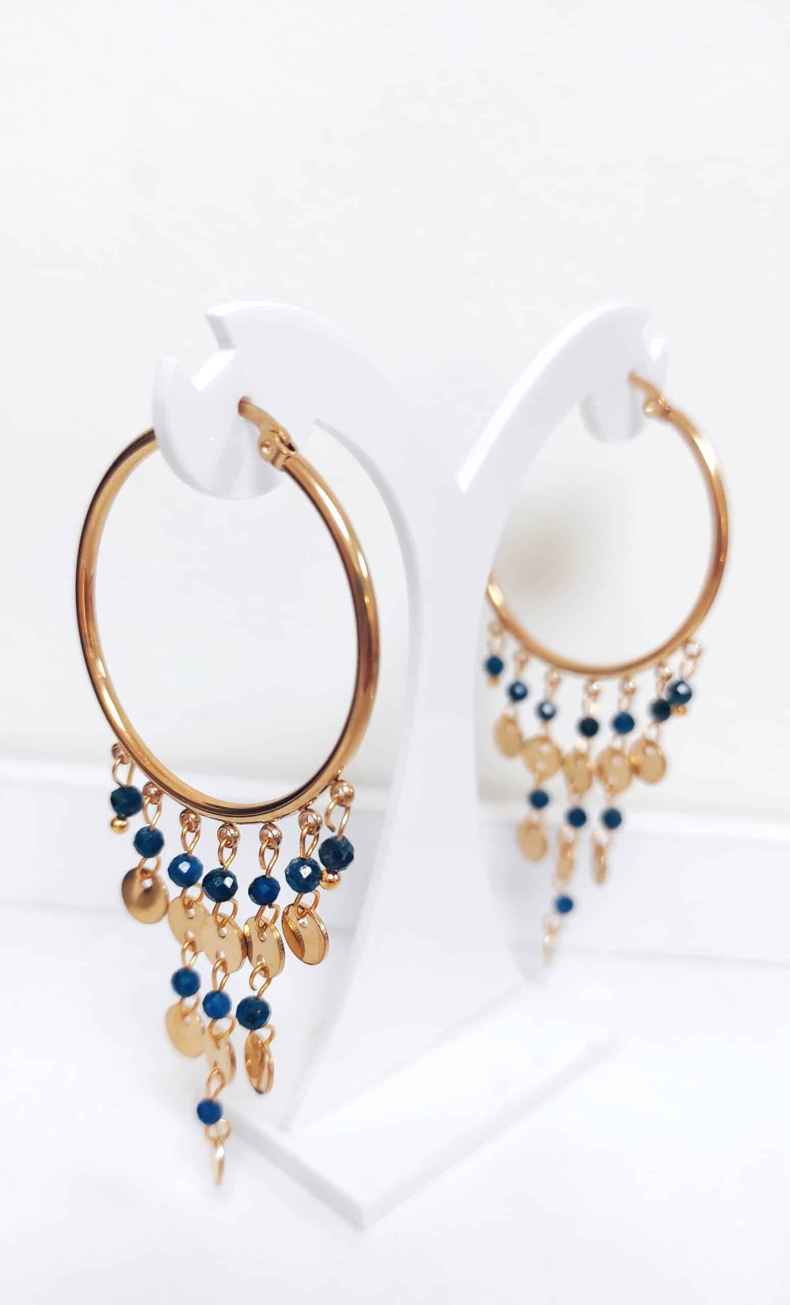 Boucles d’oreilles type créoles en acier inoxydable doré avec une pluie de pastilles rondes pleines et des perles en pierre naturelle Lapis Lazuli de couleur bleu marine. Bijoux léger facile à porter, se terminant en forme de pointe pour une touche d’originalité en restant très tendance 👌😍