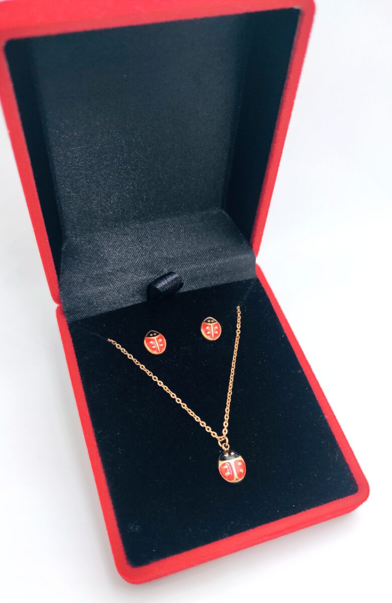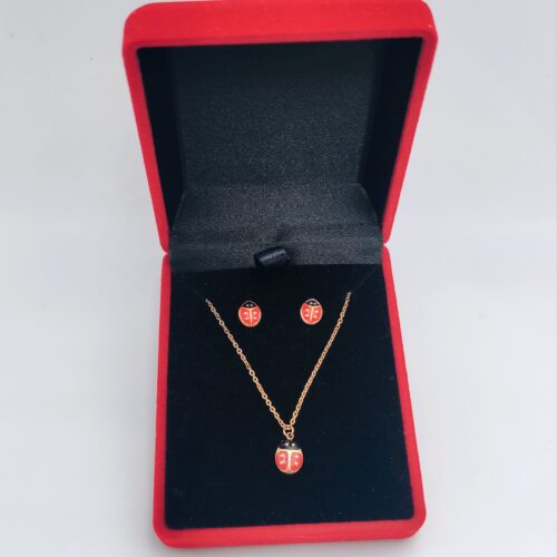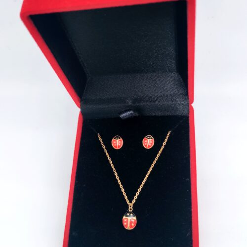 Parure en acier inoxydable dorĂ© de marque Bohm avec un pendentif en forme de coccinelle et les boucles d’oreilles assorties. La coccinelle est un symbole de chance, de joie et de grands bonheurs Ă venir.