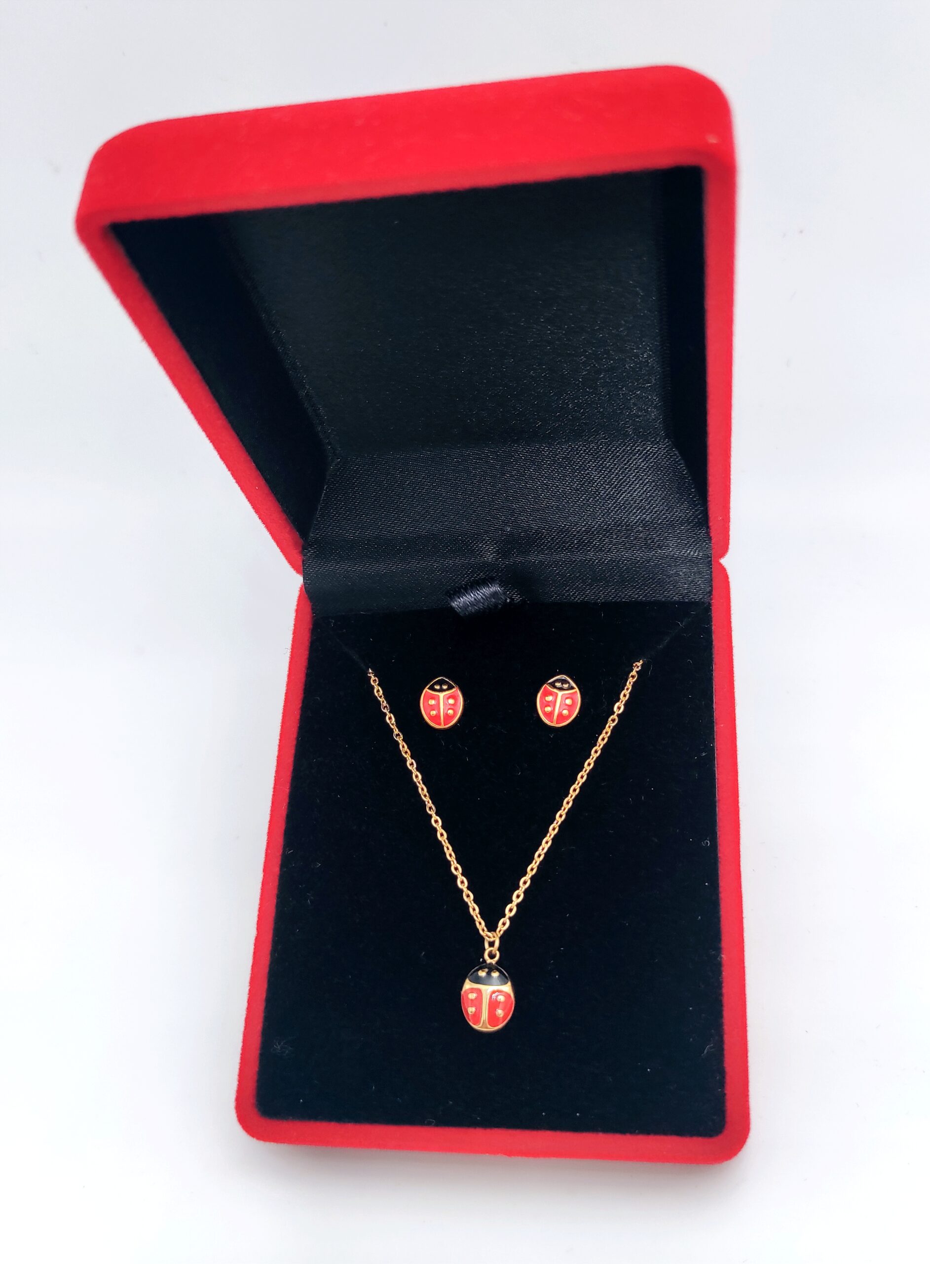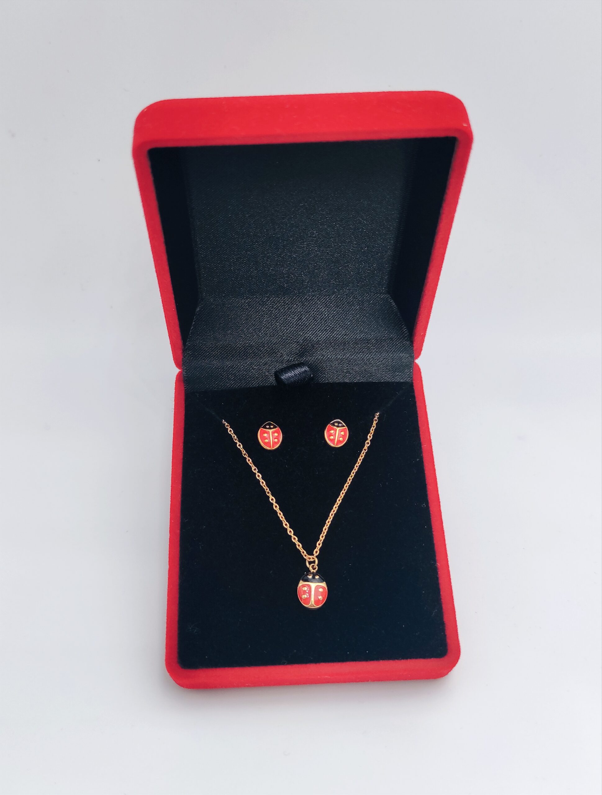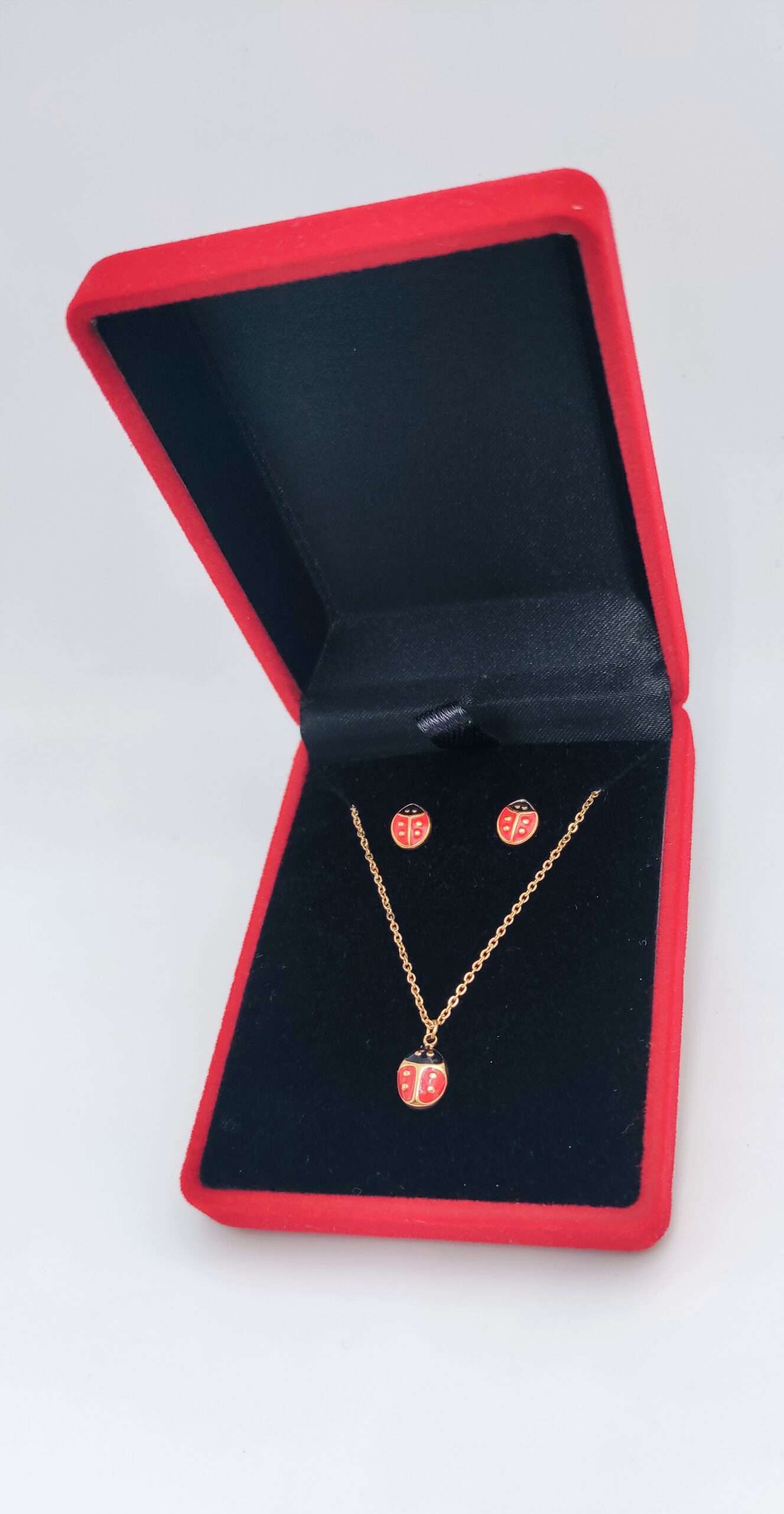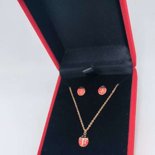 Les coccinelles mesurent environ 0,7cm. Les boucles d’oreilles sont Ă puce avec des petits fermoirs. Le collier est court avec une rallonge.