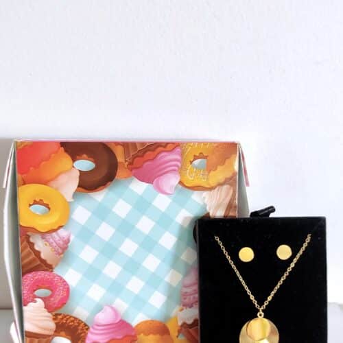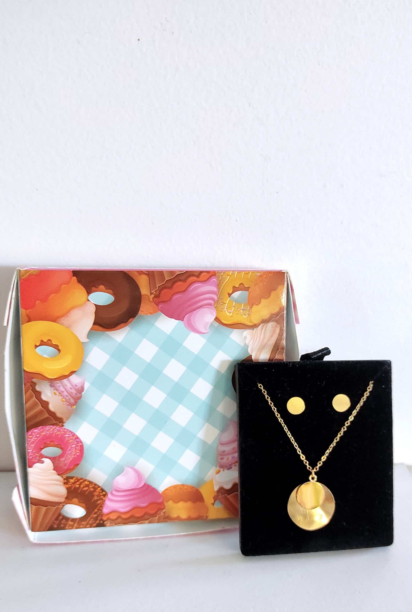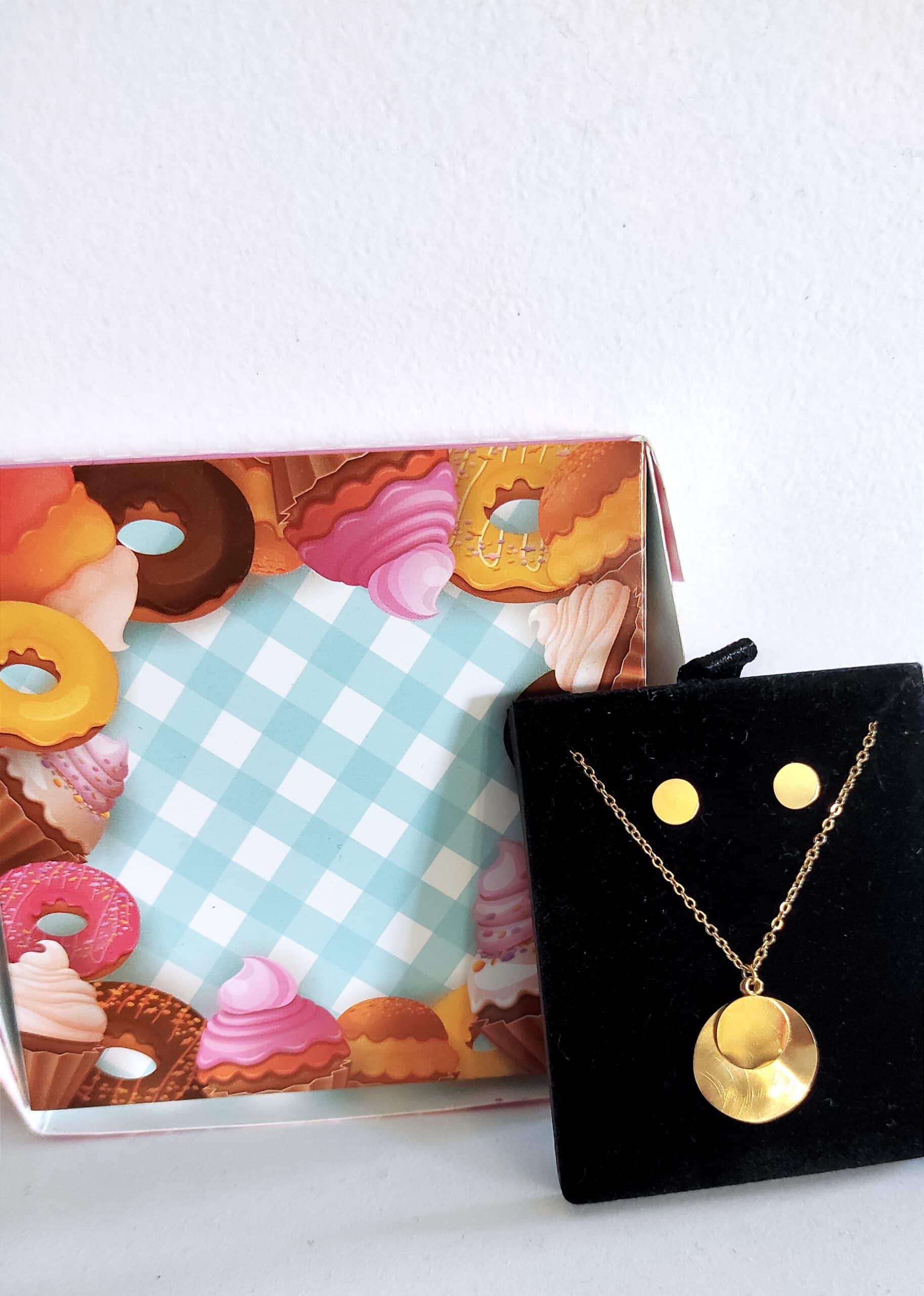 Parure comprenant un collier en acier inoxydable doré de marque Ikita et une paire de boucles d’oreilles en forme de pastille ronde lisse effet miroir pour assortir le pendentif.