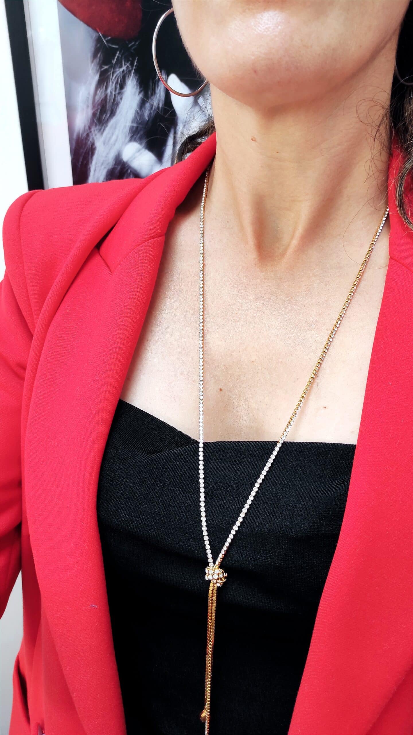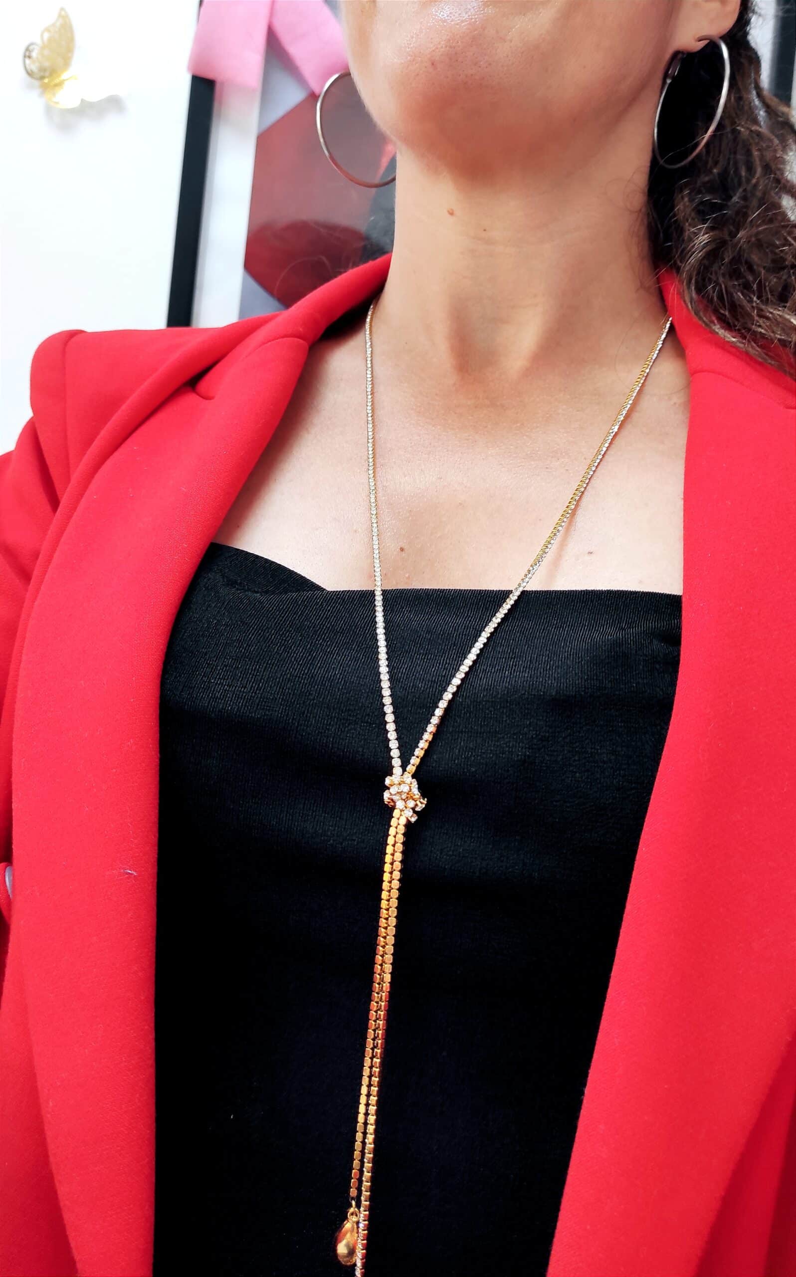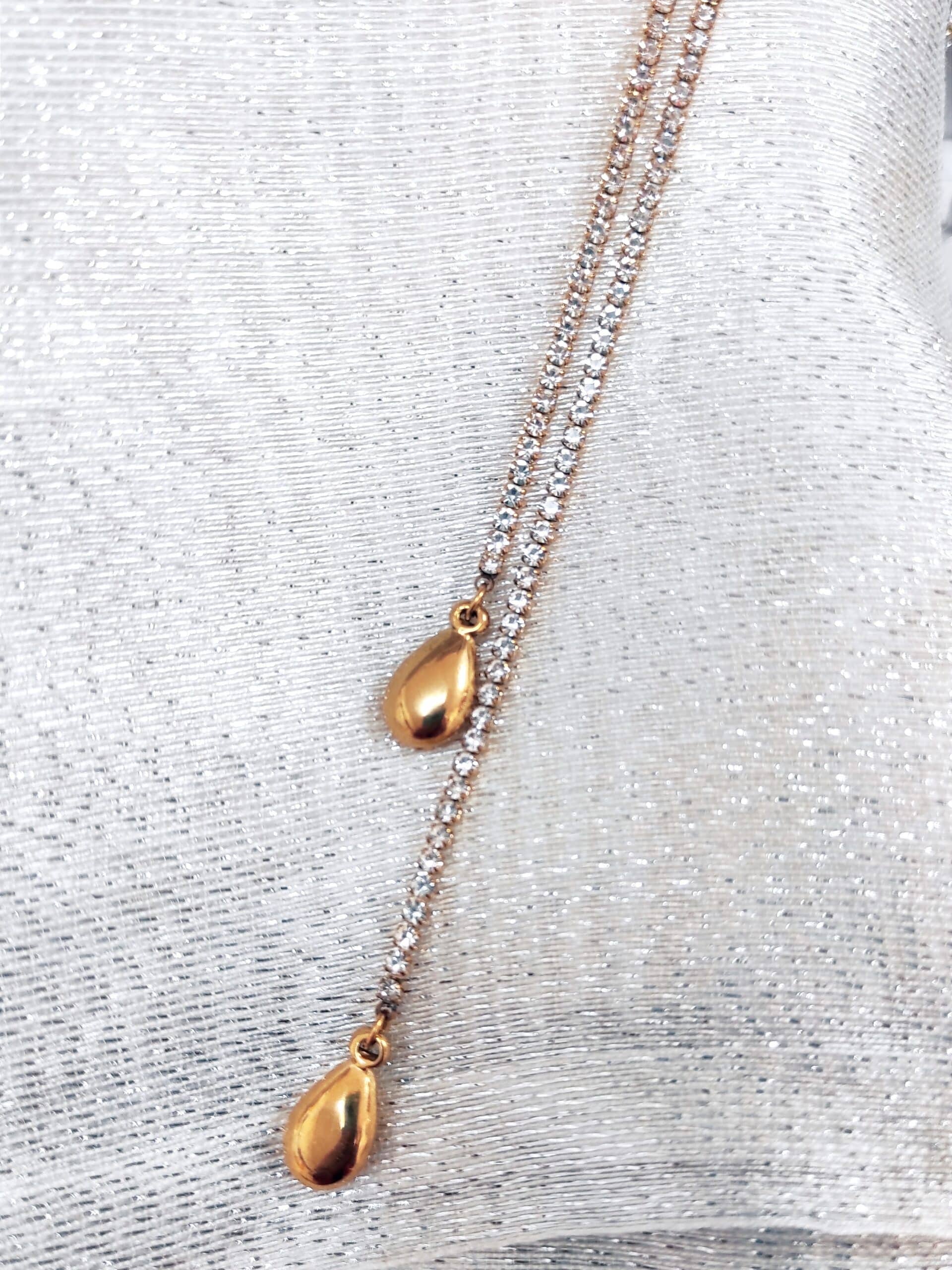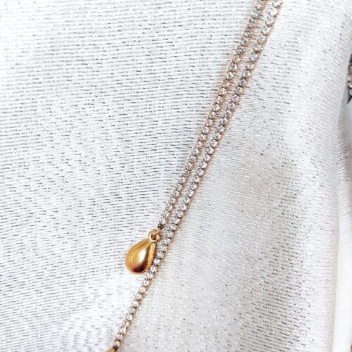 Collier type sautoir long orné de strass tout le long du collier et en acier inoxydable doré. Le collier se « noue » à l’endroit que vous souhaitez et se termine par deux gouttes dorées « pleines » plus « lourdes » pour permettre au bijoux de moins remonter facilement. Le collier peut tout à fait également se porter sans le noyer, en me laissant de part et d’autre des épaules. Bijoux original, singulier et tendance. Il égayera facilement vos tenues avec beaucoup de classe et d’élégance 👌