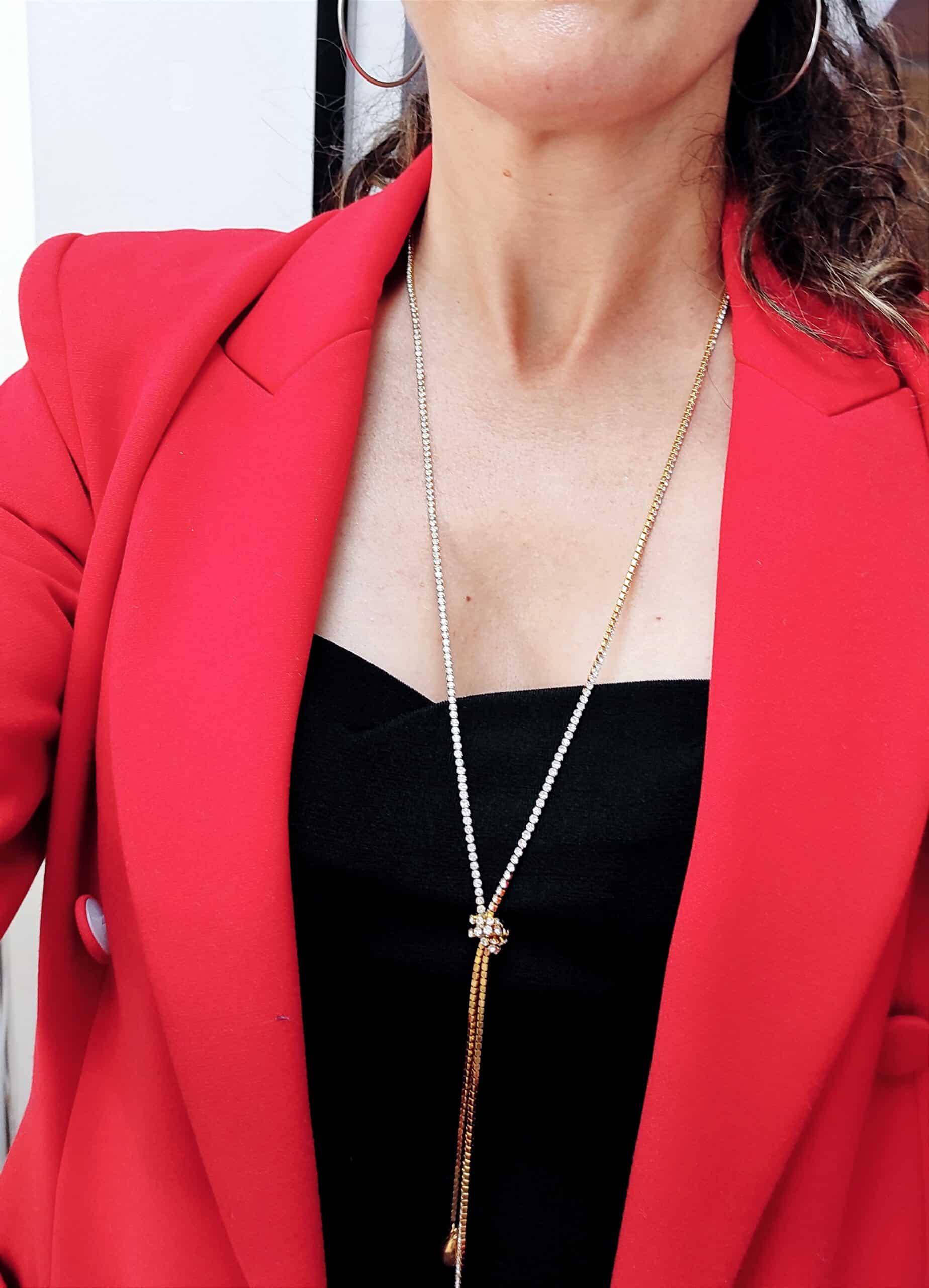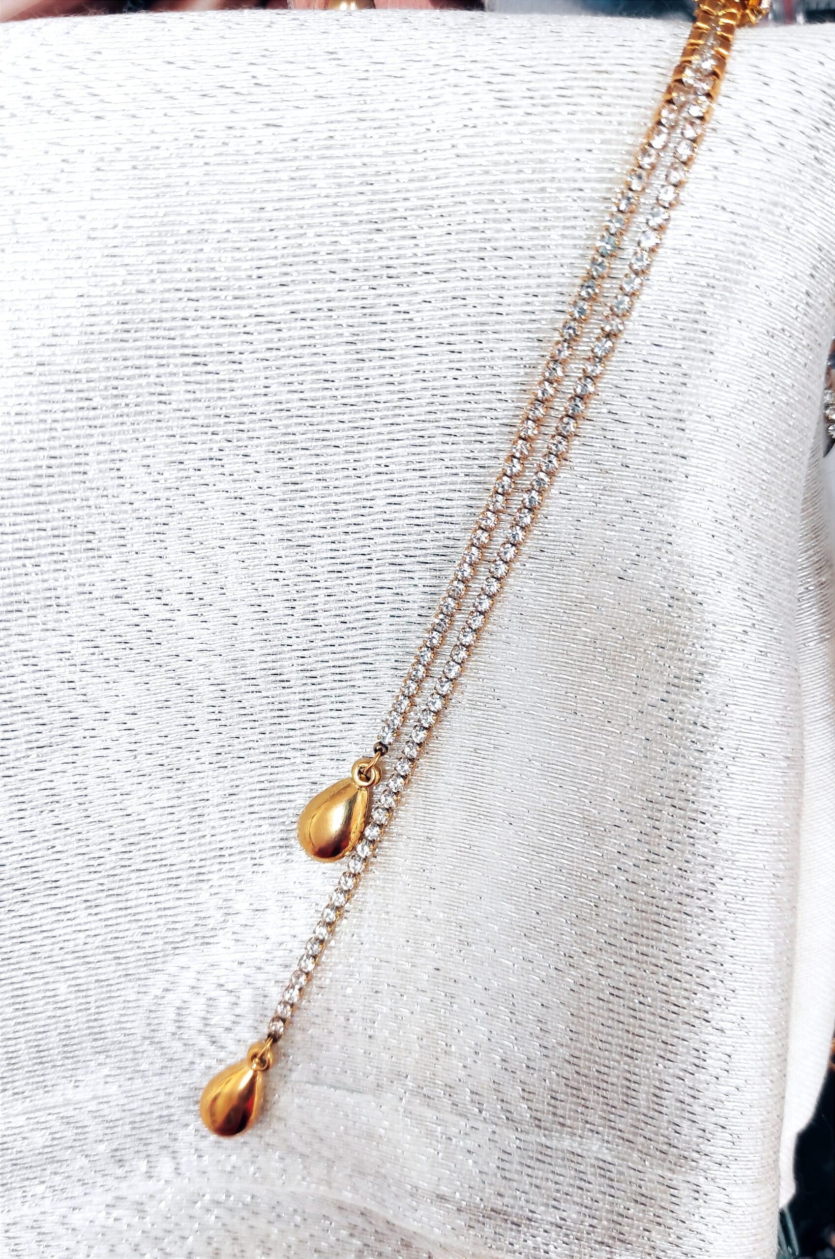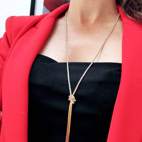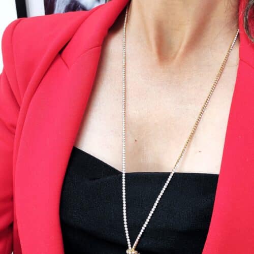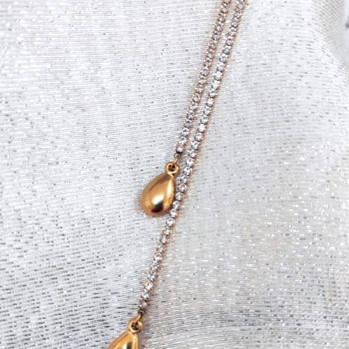 Collier type sautoir long orné de strass tout le long du collier et en acier inoxydable doré. Le collier se « noue » à l’endroit que vous souhaitez et se termine par deux gouttes dorées « pleines » plus « lourdes » pour permettre au bijoux de moins remonter facilement. Le collier peut tout à fait également se porter sans le noyer, en me laissant de part et d’autre des épaules. Bijoux original, singulier et tendance. Il égayera facilement vos tenues avec beaucoup de classe et d’élégance 👌